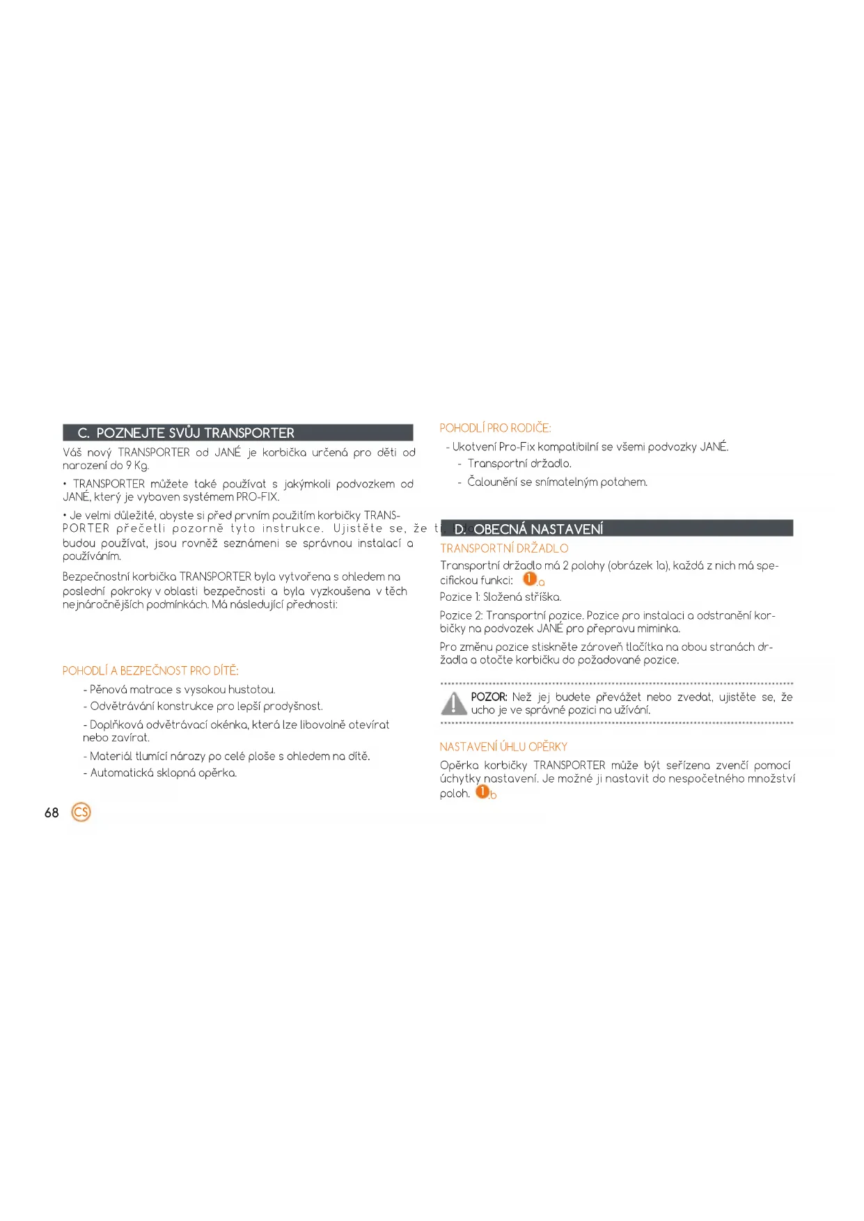 A. INFORMACE A BEZPEČNOSTNÍ UPOZORNĚNÍ INSTRUKCE - DŮLEŽITÉ: Tyto instrukce si přečtěte pečlivě před použitím a ponechte si je pro budoucí konzultace. UPOZORNĚNÍ: - Tento produkt je vhodný pouze pro děti, které si ještě nedo- kážou samy sednout. - Nikdy nenechávejte dítě bez dozoru. - Nenechte ostatní děti, aby si hrály bez dozoru v blízkosti korbičky. - Nepoužívejte, pokud nějaká část chybí, je zničená nebo utržená. - Nepoužívejte tuto korbičku na podstavci. - Nepřidávejte žádnou matraci. - Používejte pouze na pevnou, horizontální, vyrovnanou a su- chou plochu. - Nikdy nepoužívejte tuto přenosnou korbičku, aniž byste ji upevnili na kočárek, jak je uvedeno v instrukcích. - Z bezpečnostních důvodů se nesmí používat v kopcích se sklo- nem vyšším než 12º. V takovém případě by mohlo dojít k naru- šení stability kočárku. - Nedávejte přenosnou korbičku do výšek jako jsou stoly, poste- le, atd. Hrozí riziko pádu. OMEZENÍ POUŽÍVÁNÍ: - Používejte pouze originální komponenty JANÉ. - Aktivujte vždy brzdu kočárku dříve, než umístíte nebo odstra- níte korbičku TRANSPORTER. - Mějte vždy na paměti riziko, které může vyvolat oheň nebo jiné zdroje tepla jako jsou topení, plynové hořáky, atd., když se na- cházejí v blízkosti korbičky. - Ucha a dno korby by se měly pravidelně prohlížet, aby se zjis- tily příznaky poškození nebo opotřebení. - Tato korbička je určena pro děti od narození do 9 kg. - Tento produkt je vhodný pro děti, které nejsou schopné samy sedět, obracet se nebo se zvedat za pomoci rukou a kolen. Maximální váha dítěte: 9 kg. - Nejezděte s kočárkem ze schodů ani do schodů. - Ujistěte se, zda je hlava dítěte ve vyšší poloze než tělo. DOPORUČENÍ - Ponechte si tento návod k použití pro budoucí konzultace. Měj- te jej vždy v kapse umístěné v čalouněné spodní části nohou.67