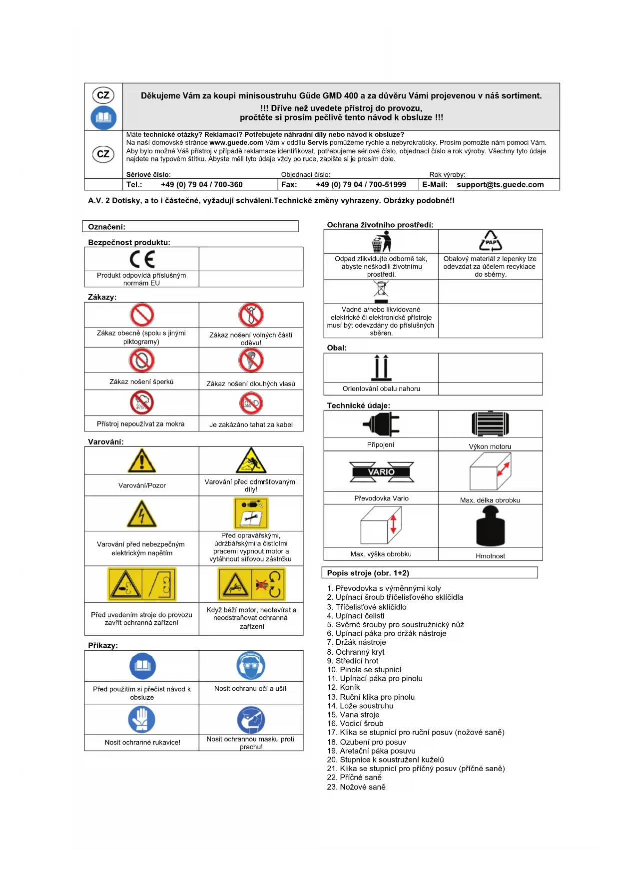 Máte technické otázky? Reklamaci? Potřebujete náhradní díly nebo návod k obsluze? Na naší domovské stránce www.guede.com Vám v oddílu Servis pomůžeme rychle a nebyrokraticky. Prosím pomožte nám pomoci Vám. Aby bylo možné Váš přístroj v případě reklamace identifikovat, potřebujeme sériové číslo, objednací číslo a rok výroby. Všechny tyto údaje najdete na typovém štítku. Abyste měli tyto údaje vždy po ruce, zapište si je prosím dole. Sériové číslo:_____________________________Objednací číslo:__________________________Rok výroby:_______________________ Tel.: +49 (0) 79 04 / 700-360 Fax: +49 (0) 79 04 / 700-51999 E-Mail: support@ts.guede.com A.V. 2 Dotisky, a to i částečné, vyžadují schválení.Technické změny vyhrazeny. Obrázky podobné!! Označení: Bezpečnost produktu: