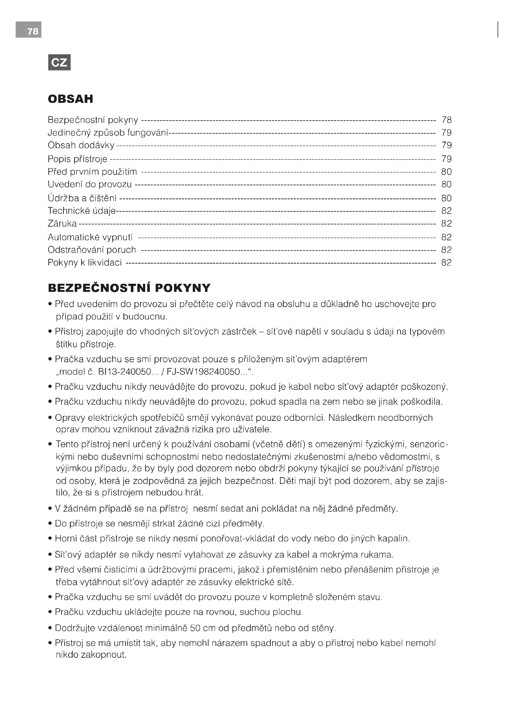 - Pračka vzduchu se smí provozovat pouze s přiloženým síťovým adaptérem „model č. BI13-240050... / FJ-SW198240050...“.