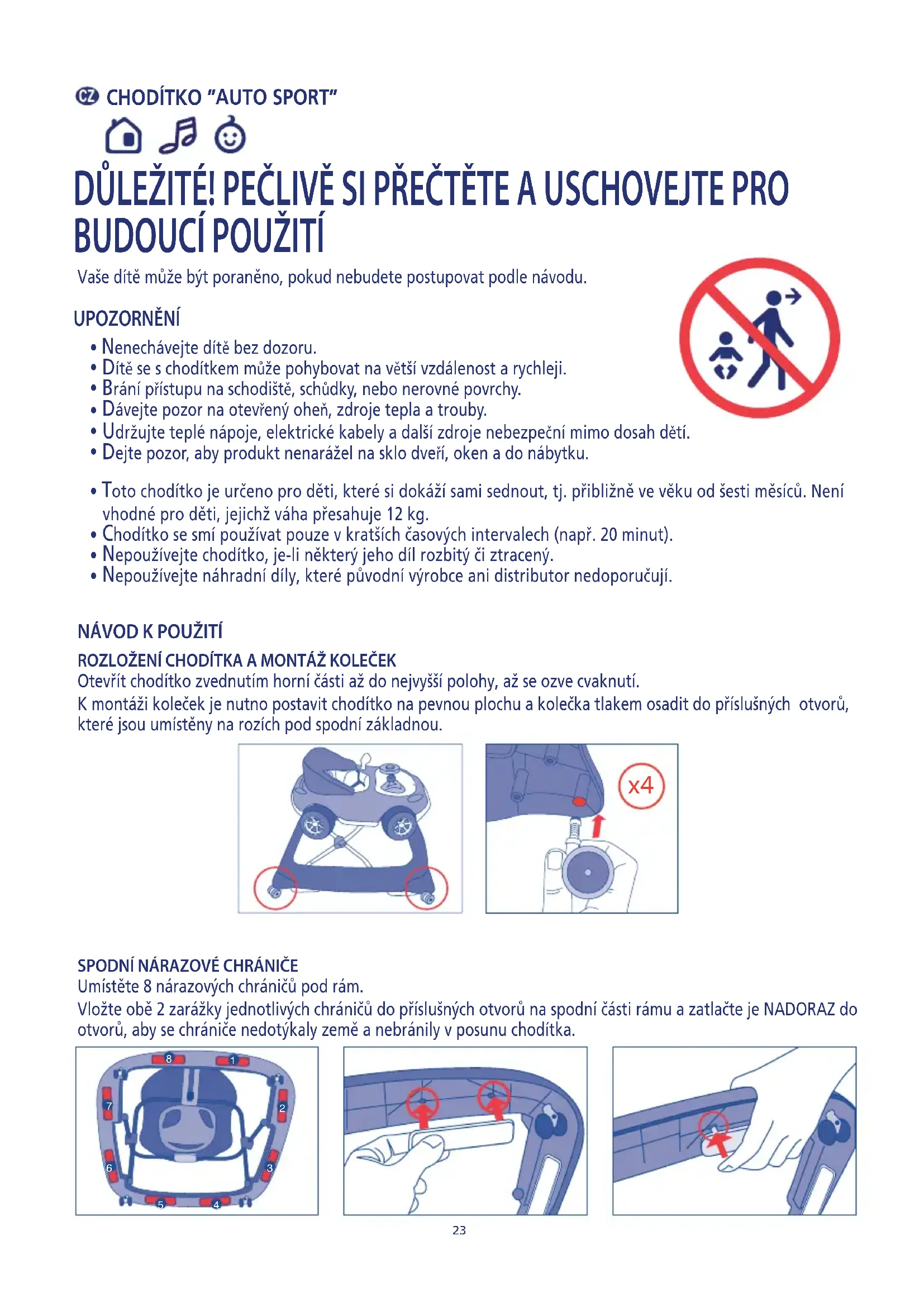 UPOZORNĚNÍ: -Pozor! Baterie smí vyměňovat pouze dospělá osoba. -Baterie uchovávejte vždy mimo dosah dětí. -Při vkládání baterií dbejte na jejich správnou polaritu. -Není přípustné míchat různé druhy baterií a ani nové baterie se staršími. -Nenabíjecí baterie se nesmí dobíjet. -Vyjměte vybité baterie. -Baterie nesmí vyvolat zkrat napájecího zdroje. -Uchovávejte obal vždy mimo dosah dítěte. -Uschovejte si pokyny k použití pro případné pozdější nahlédnutí. -Před nabíjením vyjměte baterie z výrobku. -Nabíjení baterií musí probíhat pod dohledem dospělé osoby. -Multifunkční hrací panel musí být smontován dospělou osobou. Hrací desku musí složit dospělá osoba. Pro upevnění desky k horní základně chodítka umístíme desku tak, aby otvory spodní strany desky byly otočené směrem horní základně chodítka (A). Na spodní straně horní základny chodítka jsou dvě podpěry, které se musí otočit tak, aby byly orientované příčně. Ujistěte se, že hrací deska je správně podepřena (B).