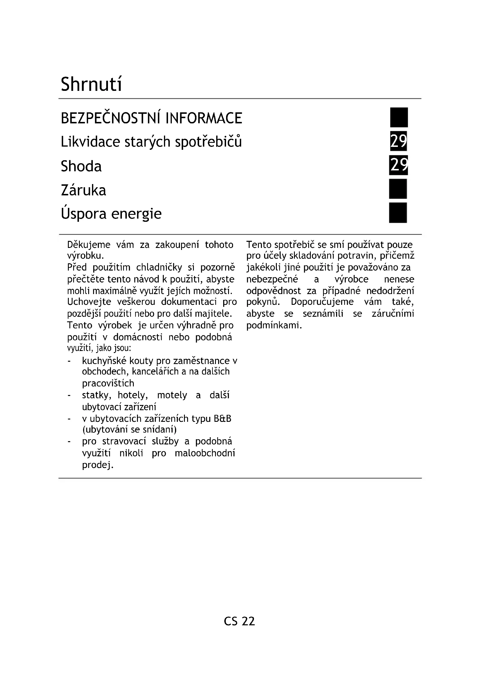 Záruka 29 Úspora energie 30 Děkujeme vám za zakoupení tohoto výrobku. Před použitím chladničky si pozorně přečtěte tento návod k použití, abyste mohli maximálně využít jejích možností. Uchovejte veškerou dokumentaci pro pozdější použití nebo pro další majitele. Tento výrobek je určen výhradně pro použití v domácnosti nebo podobná využití, jako jsou: