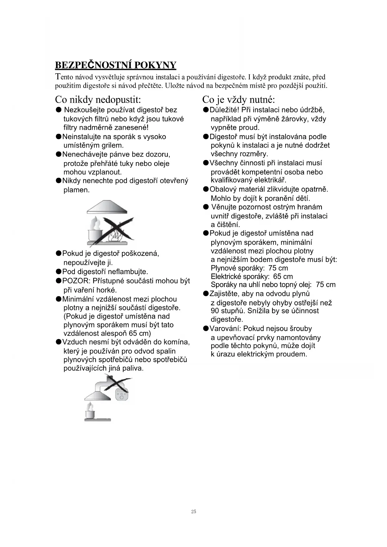 Tento návod vysvětluje správnou instalaci a používání digestoře. I když produkt znáte, před použitím digestoře si návod přečtěte. Uložte návod na bezpečném místě pro pozdější použití. Co nikdy nedopustit: ● Nezkoušejte používat digestoř bez tukových filtrů nebo když jsou tukové filtry nadměrně zanesené! ●Neinstalujte na sporák s vysoko umístěným grilem. ●Nenechávejte pánve bez dozoru, protože přehřáté tuky nebo oleje mohou vzplanout. ●Nikdy nenechte pod digestoří otevřený plamen. ●Pokud je digestoř poškozená, nepoužívejte ji. ●Pod digestoří neflambujte. ●POZOR: Přístupné součásti mohou být při vaření horké. ●Minimální vzdálenost mezi plochou plotny a nejnižší součástí digestoře. (Pokud je digestoř umístěna nad plynovým sporákem musí být tato vzdálenost alespoň 65 cm) ●Vzduch nesmí být odváděn do komína, který je používán pro odvod spalin plynových spotřebičů nebo spotřebičů používajících jiná paliva. Co je vždy nutné: ●Důležité! Při instalaci nebo údržbě, například při výměně žárovky, vždy vypněte proud. ●Digestoř musí být instalována podle pokynů k instalaci a je nutné dodržet všechny rozměry. ●Všechny činnosti při instalaci musí provádět kompetentní osoba nebo kvalifikovaný elektrikář. ●Obalový materiál zlikvidujte opatrně. Mohlo by dojít k poranění dětí. ● Věnujte pozornost ostrým hranám uvnitř digestoře, zvláště při instalaci a čištění. ●Pokud je digestoř umístěna nad plynovým sporákem, minimální vzdálenost mezi plochou plotny a nejnižším bodem digestoře musí být: Plynové sporáky: 75 cm Elektrické sporáky: 65 cm Sporáky na uhlí nebo topný olej: 75 cm ●Zajistěte, aby na odvodu plynů z digestoře nebyly ohyby ostřejší než 90 stupňů. Snížila by se účinnost digestoře. ●Varování: Pokud nejsou šrouby a upevňovací prvky namontovány podle těchto pokynů, může dojít k úrazu elektrickým proudem. 25Co je vždy nutné: ●Pokud vaříte na plynovém sporáku, vždy na hrnce a pánve dejte pokličku. ●V režimu odsávání je z místnosti odsáván vzduch. Zajistěte dostatečné větrání. Digestoř odsává z místnosti pachy, ale ne páru. ●Digestoř je určena pouze k použití v domácnosti. ●Pokud se poškodí napájecí kabel, výměnu musí provést výrobce, jeho servisní zástupce nebo osoby s podobnou kvalifikací, aby se vyloučilo riziko.. ●Tento spotřebič mohou používat děti starší osmi let a osoby s omezenými fyzickými, smyslovými nebo duševními schopnostmi nebo osoby nezkušené a neznalé za předpokladu, že mají zajištěný dohled nebo byly poučeny o bezpečném používání spotřebiče a chápou související rizika. Děti si s digestoří nesmí hrát. Děti nesmí provádět čištění a uživatelskou údržbu bez dohledu. ●Varování: Před tím, než se dotknete svorek, musí výt všechny obvody odpojeny. Co je vždy nutné: ●Pozor: Spotřebič a jeho přístupné součásti se mohou při používání zahřát. Zabraňte dotyku s horkými součástmi. Děti mladší než 8 let se nesmí přibližovat, pokud nejsou pod stálým dozorem. ● Pokud je digestoř používána v místnosti, kde jsou další spotřebiče spalující plyn nebo jiná paliva, musí být zajištěno dostatečné větrání. ●Pokud není prováděno čištění podle pokynů, existuje riziko požáru. ●Musí být dodržovány předpisy pro odvod vzduchu. ●Pravidelně spotřebič čistěte postupem uvedeným v kapitole ÚDRŽBA. ●Z bezpečnostních důvodů používejte pouze šrouby, které jsou doporučené v tomto návodu. ●Podrobnosti a intervaly čištění jsou uvedeny v popisu údržby a čistění v návodu k obsluze. ●Děti nesmí provádět čištění a uživatelskou údržbu bez dohledu. ●Pokud jsou digestoř a současně fungující spotřebiče připojeny na napájení jiné, než elektrickou energií, podtlak v místnosti nesmí překročit 4 Pa (4 × 10-5 bar). ●VAROVÁNÍ: Nebezpečí požáru: neskladujte předměty na varném povrchu. ●Nepoužívejte parní čistič. ●NIKDY se nepokoušejte hasit požár vodou, ale vypněte spotřebič a potom zakryjte plamen např. pokličkou nebo hasicí rouškou. 26INSTALACE