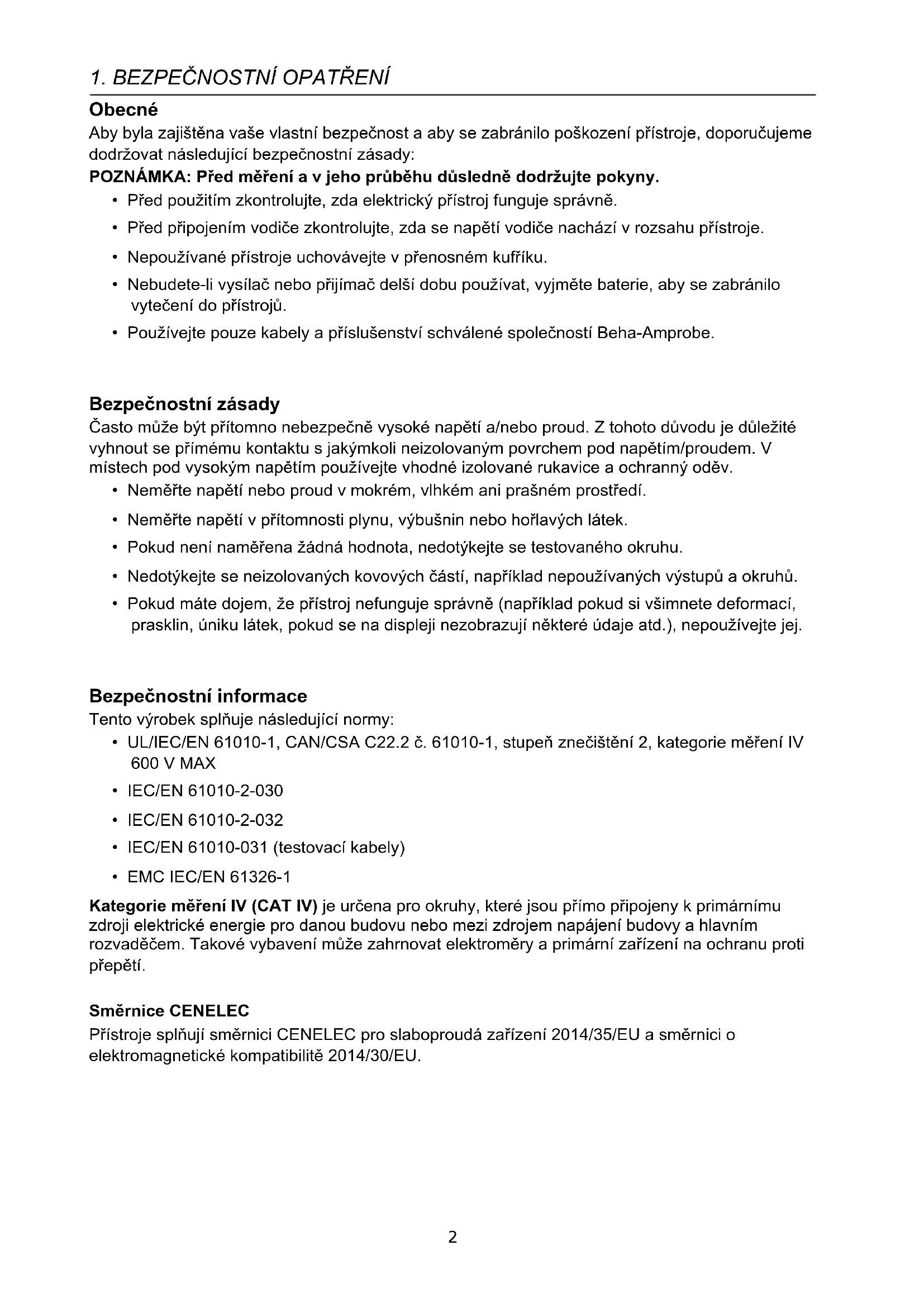 - Používejte pouze kabely a příslušenství schválené společností Beha-Amprobe. Bezpečnostní zásady Často může být přítomno nebezpečně vysoké napětí a/nebo proud. Z tohoto důvodu je důležité vyhnout se přímému kontaktu s jakýmkoli neizolovaným povrchem pod napětím/proudem. V místech pod vysokým napětím používejte vhodné izolované rukavice a ochranný oděv.