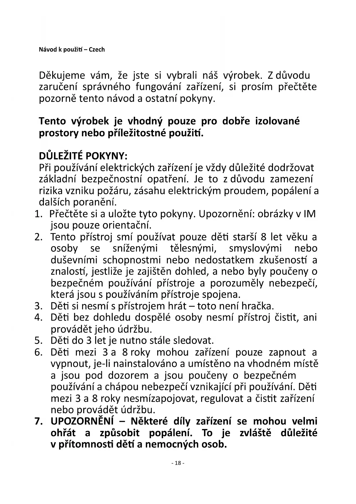 Удовлетворява изискванията на директивите на Съвета: РЕГЛАМЕНТ (ЕС) № 2015/1188 НА КОМИСИЯТА от 28 април 2015 година и за изменение на Регламент (ЕС) 2016/2282 за прилагане на Директива 2009/125 /ЕО на Европейския парламент и на Съвета по отношение на изискванията за екодизайн към местни пространствени отоплители Относно информацията за потребителите за инсталиране, употреба и поддръжка на продукта, ОЕЕО информация, моля, проверте ръководството с инструкции предоставено с опаковката.- 18 - Návod k použití – Czech Děkujeme vám, že jste si vybrali náš výrobek. Z důvodu zaručení správného fungování zařízení, si prosím přečtěte pozorně tento návod a ostatní pokyny. Tento výrobek je vhodný pouze pro dobře izolované prostory nebo příležitostné použití. DŮLEŽITÉ POKYNY: Při používání elektrických zařízení je vždy důležité dodržovat základní bezpečnostní opatření. Je to z důvodu zamezení rizika vzniku požáru, zásahu elektrickým proudem, popálení a dalších poranění.