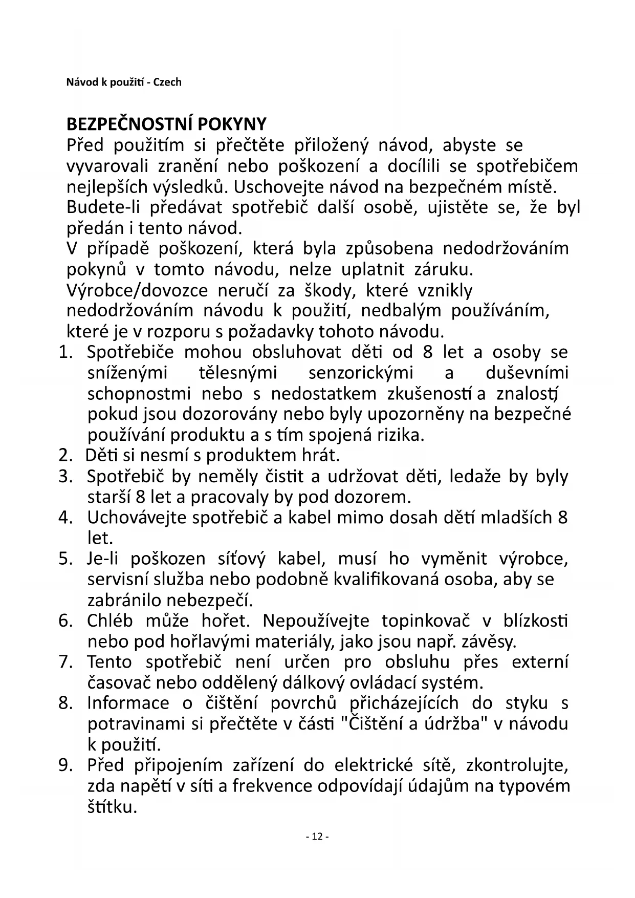 Před použitím si přečtěte přiložený návod, abyste se vyvarovali zranění nebo poškození a docílili se spotřebičem nejlepších výsledků. Uschovejte návod na bezpečném místě. Budete-li předávat spotřebič další osobě, ujistěte se, že byl předán i tento návod. V případě poškození, která byla způsobena nedodržováním pokynů v tomto návodu, nelze uplatnit záruku. Výrobce/dovozce neručí za škody, které vznikly nedodržováním návodu k použití, nedbalým používáním, které je v rozporu s požadavky tohoto návodu.