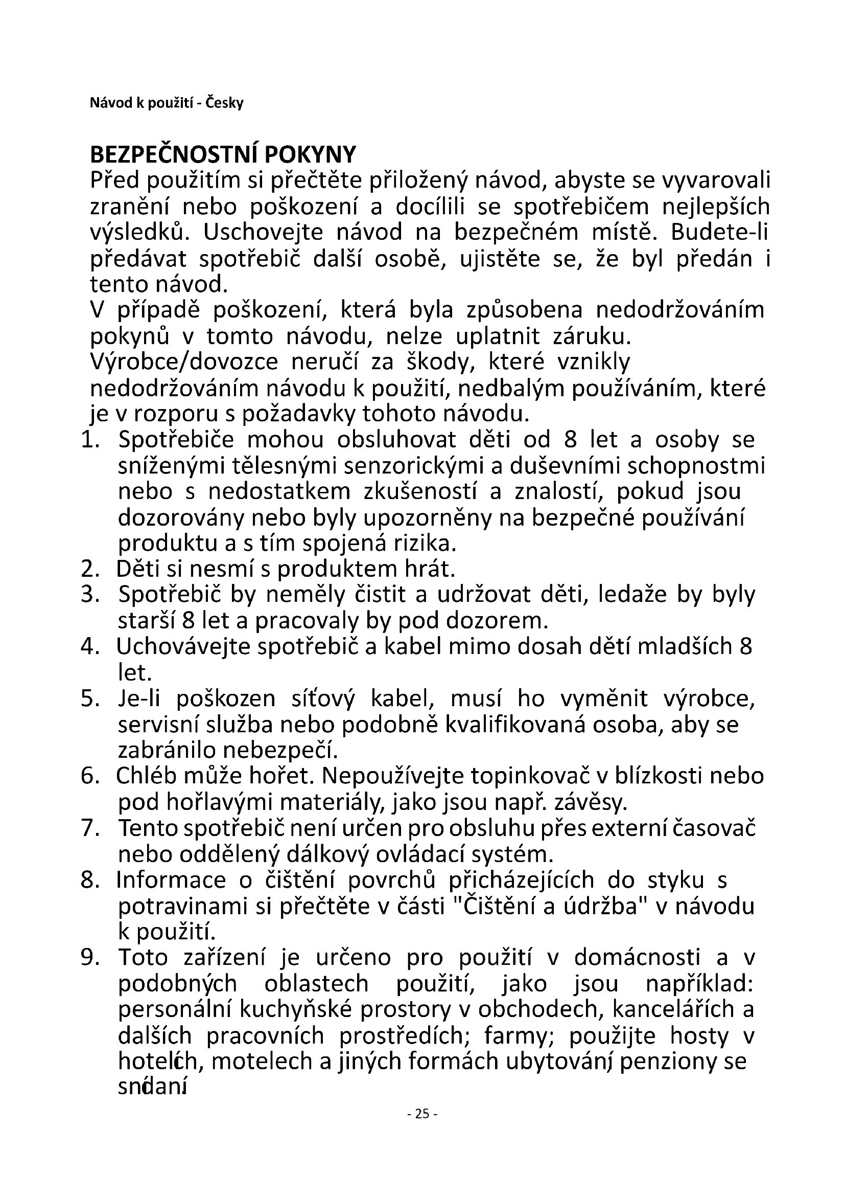 Před použitím si přečtěte přiložený návod, abyste se vyvarovali zranění nebo poškození a docílili se spotřebičem nejlepších výsledků. Uschovejte návod na bezpečném místě. Budete-li předávat spotřebič další osobě, ujistěte se, že byl předán i tento návod. V případě poškození, která byla způsobena nedodržováním pokynů v tomto návodu, nelze uplatnit záruku. Výrobce/dovozce neručí za škody, které vznikly nedodržováním návodu k použití, nedbalým používáním, které je v rozporu s požadavky tohoto návodu.