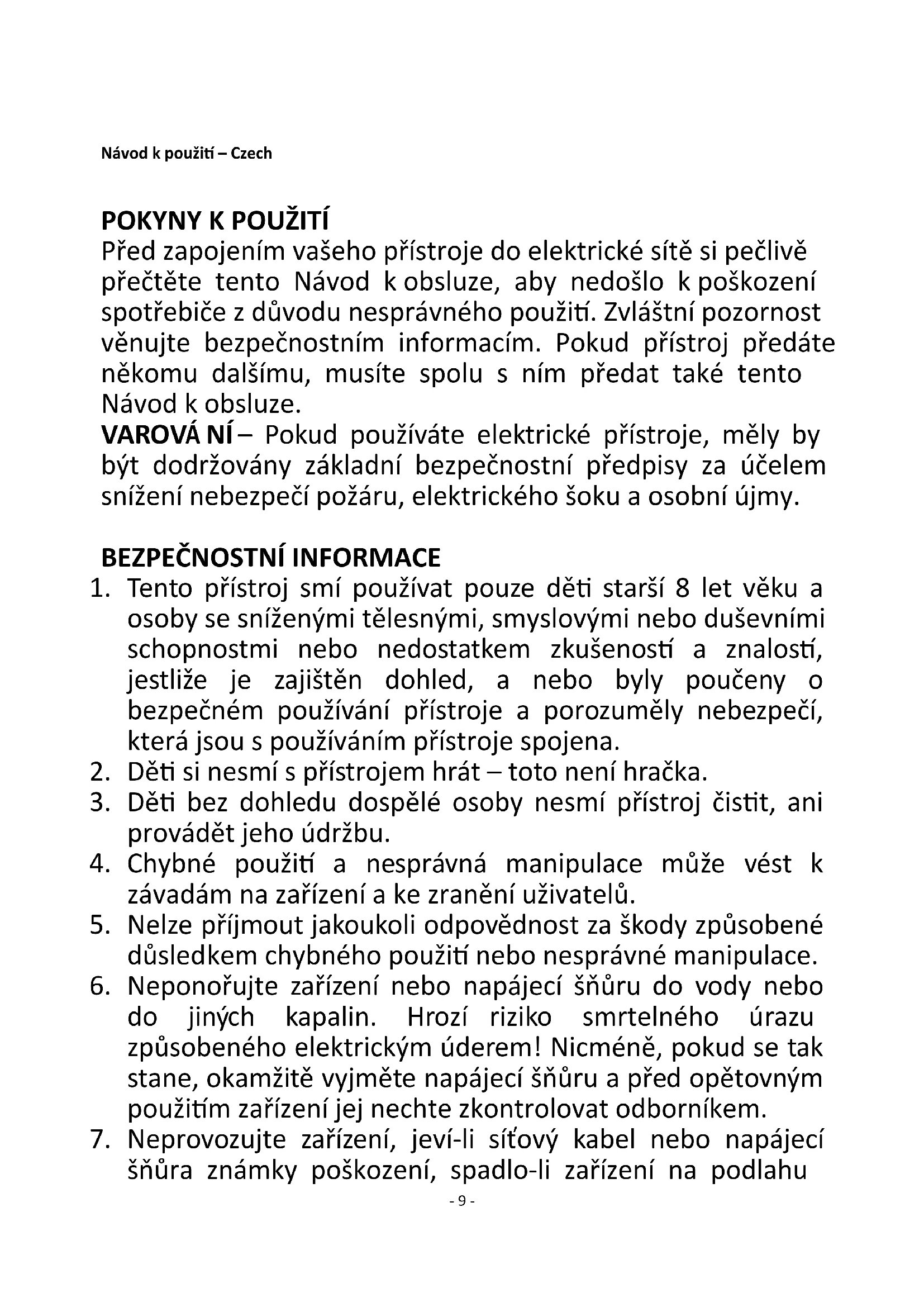 Před zapojením vašeho přístroje do elektrické sítě si pečlivě přečtěte tento Návod k obsluze, aby nedošlo k poškození spotřebiče z důvodu nesprávného použití. Zvláštní pozornost věnujte bezpečnostním informacím. Pokud přístroj předáte někomu dalšímu, musíte spolu s ním předat také tento Návod k obsluze. VAROVÁNÍ – Pokud používáte elektrické přístroje, měly by být dodržovány základní bezpečnostní předpisy za účelem snížení nebezpečí požáru, elektrického šoku a osobní újmy.