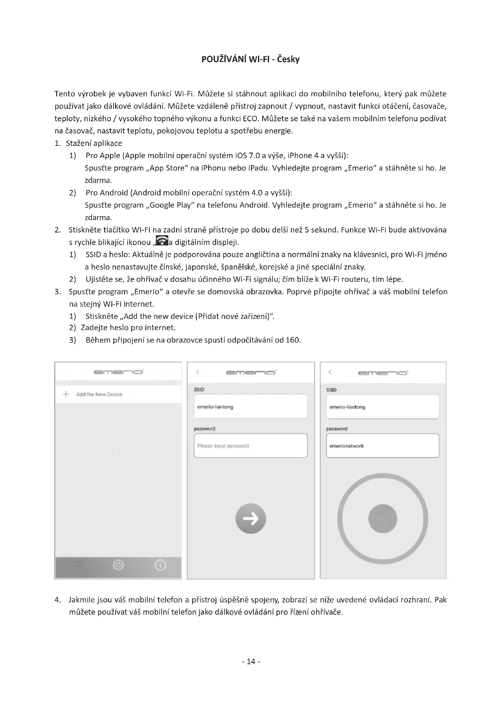 Podatkovna mreža U uslovima bez Wi-Fi mreže mobilni telefon se još uvijek može povezati s grijalicom. Najprije isključite postavke Wi-Fi mreže, a zatim otvorite podatkovnu mrežu (Proizvodom pokušajte upravljati u mreži 3G/4G.). Nakon otprilike 30 sekundi, mreža može potražiti uređaj. Uzimajući u obzir nestabilnost mreže 3G/4G, može doći do odgode od 1 - 2 sekunde, što je normalno. Podatkovnu mrežu treba koristiti na osnovu preduslova da je mobilni telefon prethodno bio povezan s grijalicom putem Wi-Fi mreže.- 14 - POUŽÍVÁNÍ WI-FI - Česky Tento výrobek je vybaven funkcí Wi-Fi. Můžete si stáhnout aplikaci do mobilního telefonu, který pak můžete používat jako dálkové ovládání. Můžete vzdáleně přístroj zapnout / vypnout, nastavit funkci otáčení, časovače, teploty, nízkého / vysokého topného výkonu a funkci ECO. Můžete se také na vašem mobilním telefonu podívat na časovač, nastavit teplotu, pokojovou teplotu a spotřebu energie.