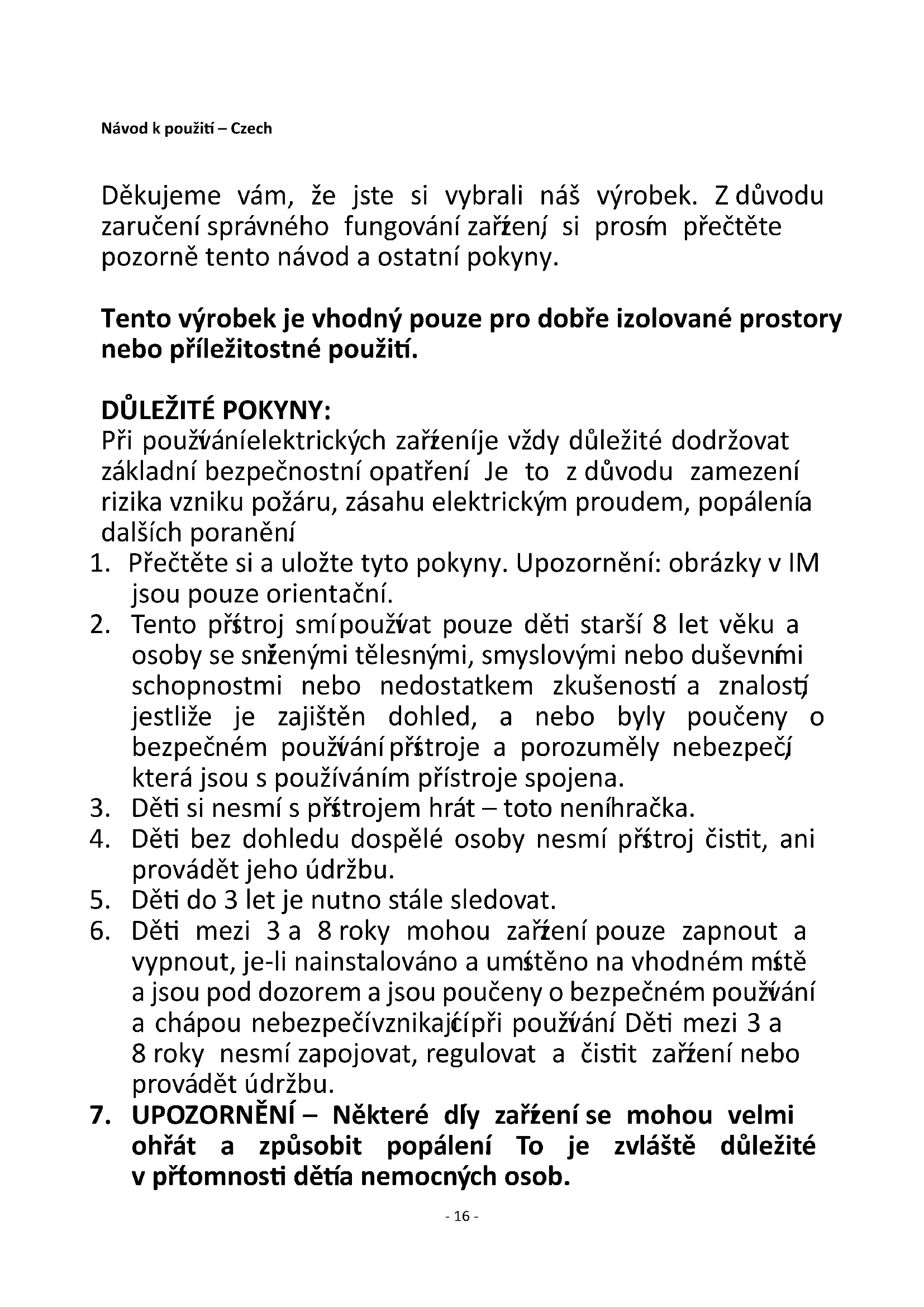 Удовлетворява изискванията на директивите на Съвета: РЕГЛАМЕНТ (ЕС) № 2015/1188 НА КОМИСИЯТА от 28 април 2015 година и за изменение на Регламент (ЕС) 2016/2282 за прилагане на Директива 2009/125 /ЕО на Европейския парламент и на Съвета по отношение на изискванията за екодизайн към местни пространствени отоплители Относно информацията за потребителите за инсталиране, употреба и поддръжка на продукта, ОЕЕО информация, моля, проверте ръководството с инструкции предоставено с опаковката.- 16 - Návod k použití – Czech Děkujeme vám, že jste si vybrali náš výrobek. Z důvodu zaručení správného fungování zařízení, si prosím přečtěte pozorně tento návod a ostatní pokyny. Tento výrobek je vhodný pouze pro dobře izolované prostory nebo příležitostné použití. DŮLEŽITÉ POKYNY: Při používání elektrických zařízení je vždy důležité dodržovat základní bezpečnostní opatření. Je to z důvodu zamezení rizika vzniku požáru, zásahu elektrickým proudem, popálení a dalších poranění.