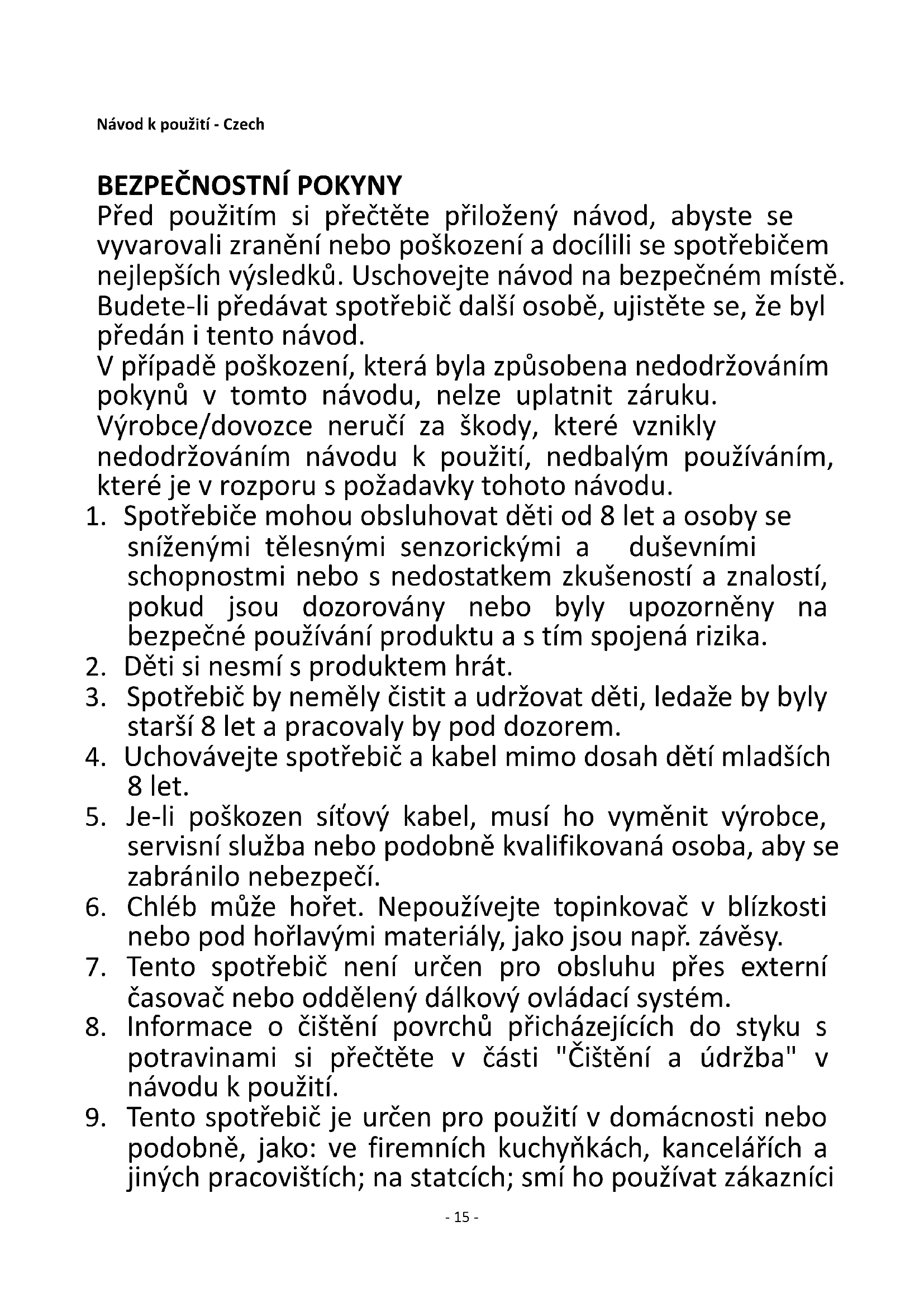 9. Tento spotřebič je určen pro použití v domácnosti nebo