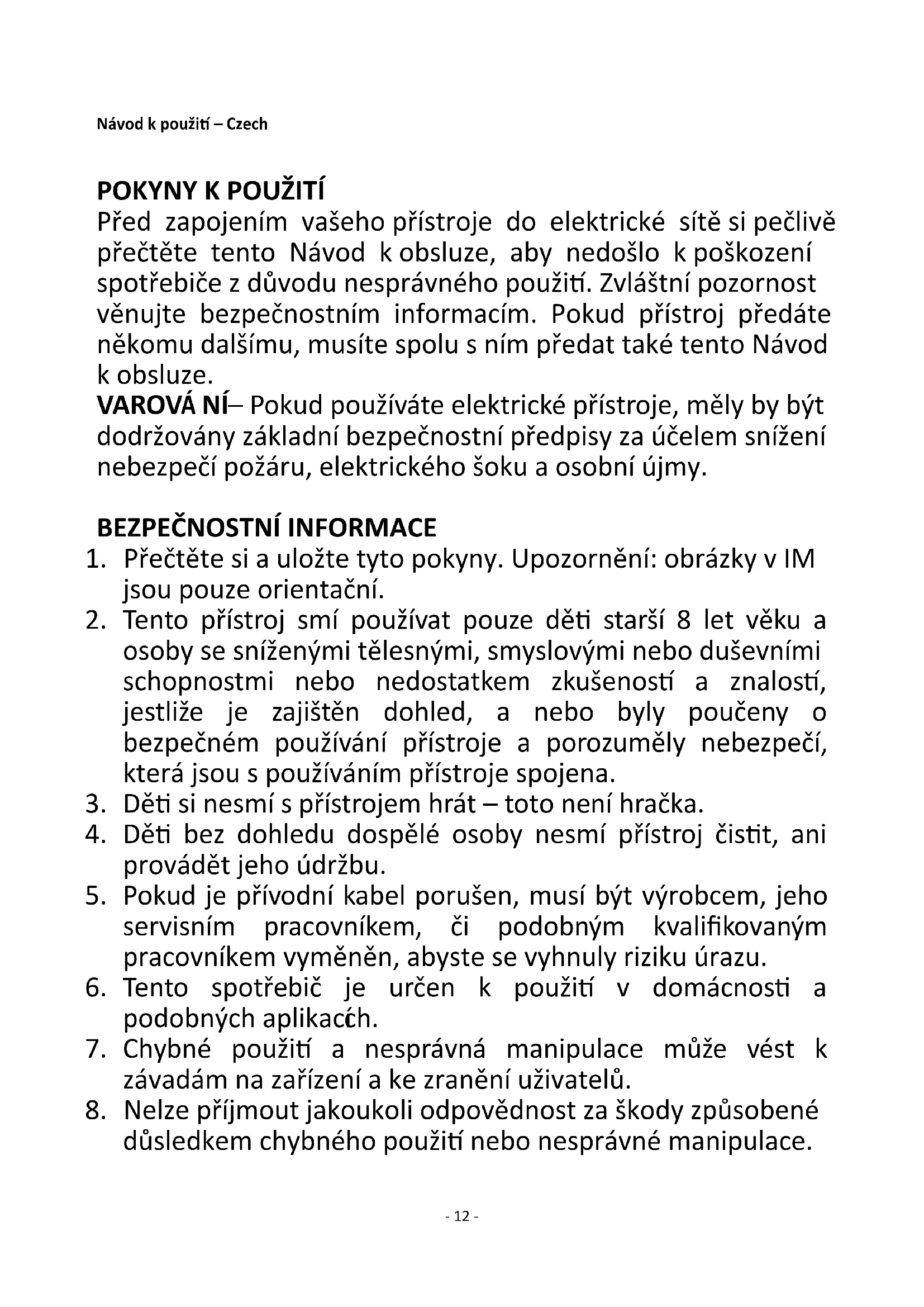 Před zapojením vašeho přístroje do elektrické sítě si pečlivě přečtěte tento Návod k obsluze, aby nedošlo k poškození spotřebiče z důvodu nesprávného použití. Zvláštní pozornost věnujte bezpečnostním informacím. Pokud přístroj předáte někomu dalšímu, musíte spolu s ním předat také tento Návod k obsluze. VAROVÁNÍ – Pokud používáte elektrické přístroje, měly by být dodržovány základní bezpečnostní předpisy za účelem snížení nebezpečí požáru, elektrického šoku a osobní újmy.