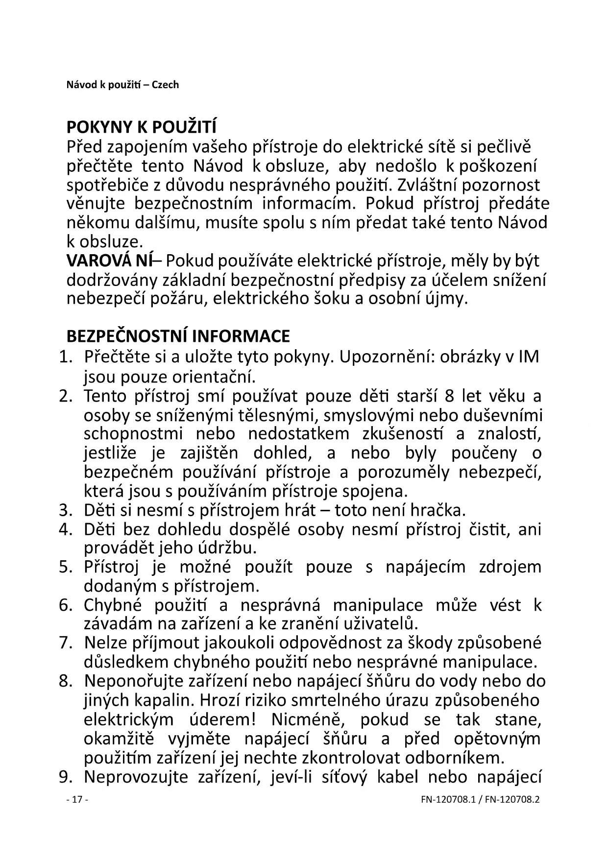 9. Neprovozujte zařízení, jeví-li síťový kabel nebo napájecí- 18 - FN-120708.1 / FN-120708.2