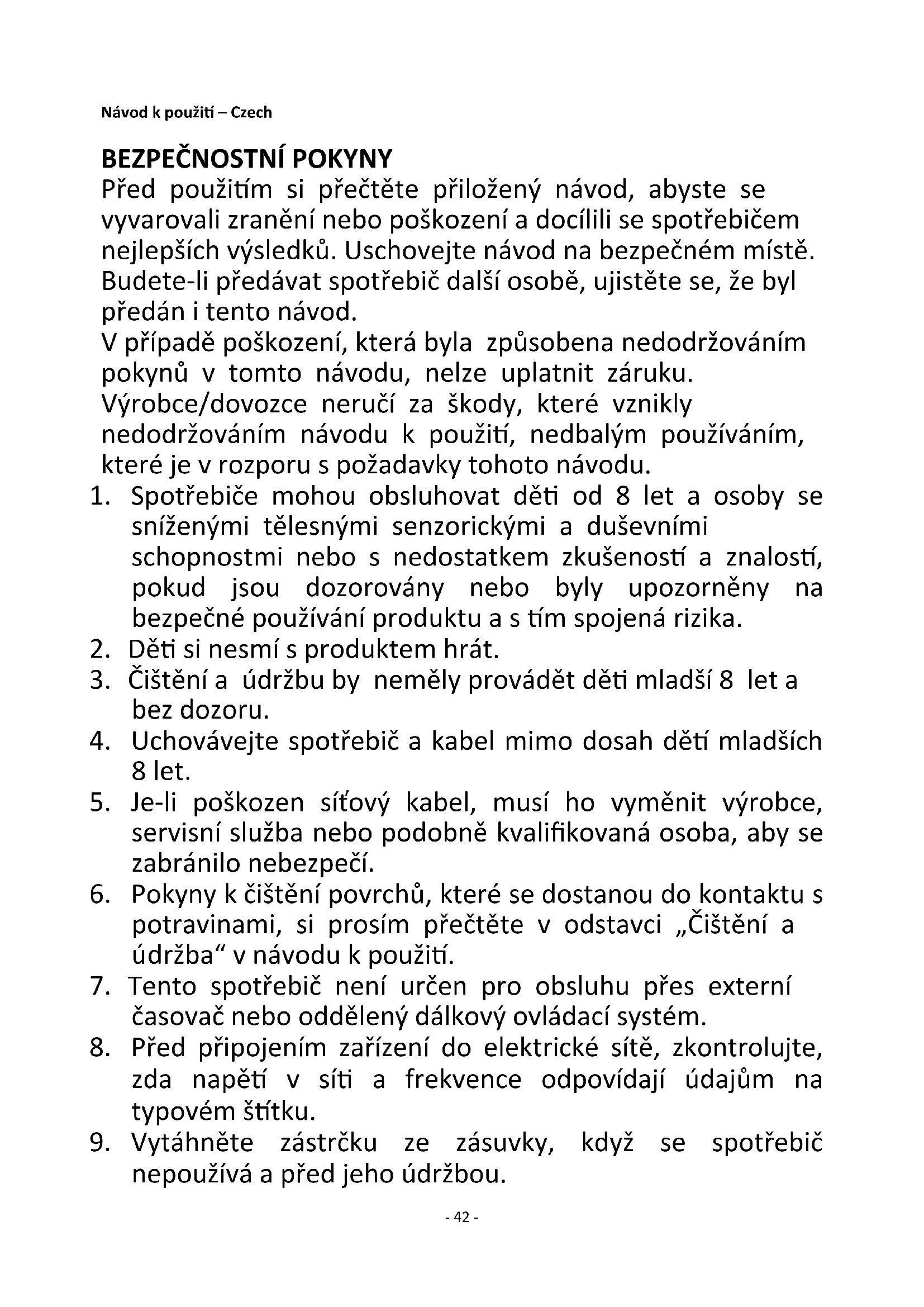 Před použitím si přečtěte přiložený návod, abyste se vyvarovali zranění nebo poškození a docílili se spotřebičem nejlepších výsledků. Uschovejte návod na bezpečném místě. Budete-li předávat spotřebič další osobě, ujistěte se, že byl předán i tento návod. V případě poškození, která byla způsobena nedodržováním pokynů v tomto návodu, nelze uplatnit záruku. Výrobce/dovozce neručí za škody, které vznikly nedodržováním návodu k použití, nedbalým používáním, které je v rozporu s požadavky tohoto návodu.