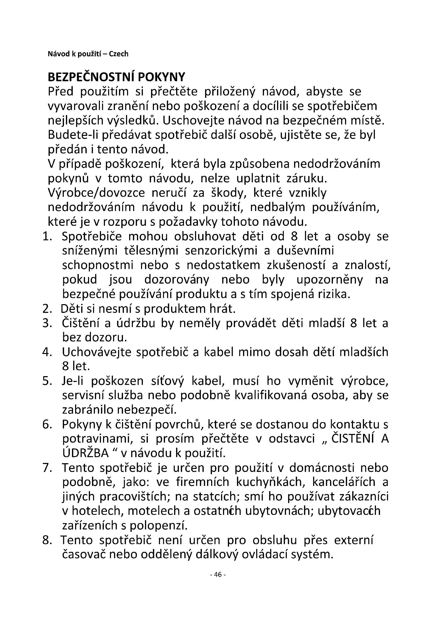 Před použitím si přečtěte přiložený návod, abyste se vyvarovali zranění nebo poškození a docílili se spotřebičem nejlepších výsledků. Uschovejte návod na bezpečném místě. Budete-li předávat spotřebič další osobě, ujistěte se, že byl předán i tento návod. V případě poškození, která byla způsobena nedodržováním pokynů v tomto návodu, nelze uplatnit záruku. Výrobce/dovozce neručí za škody, které vznikly nedodržováním návodu k použití, nedbalým používáním, které je v rozporu s požadavky tohoto návodu.