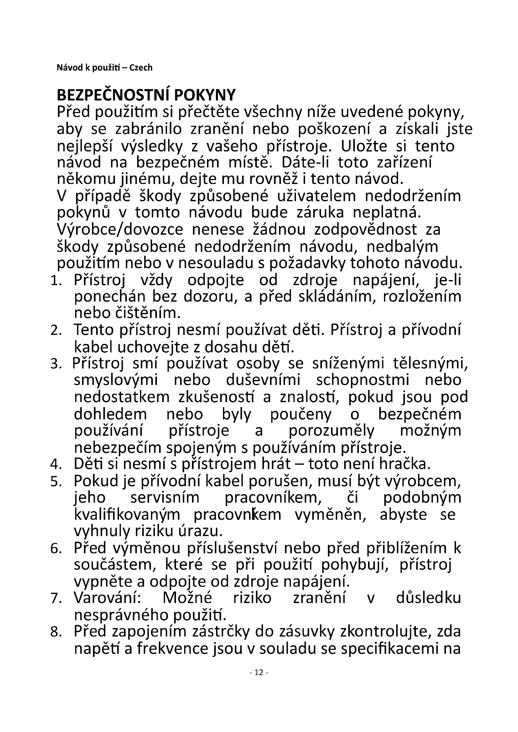 Před použitím si přečtěte všechny níže uvedené pokyny, aby se zabránilo zranění nebo poškození a získali jste nejlepší výsledky z vašeho přístroje. Uložte si tento návod na bezpečném místě. Dáte-li toto zařízení někomu jinému, dejte mu rovněž i tento návod. V případě škody způsobené uživatelem nedodržením pokynů v tomto návodu bude záruka neplatná. Výrobce/dovozce nenese žádnou zodpovědnost za škody způsobené nedodržením návodu, nedbalým použitím nebo v nesouladu s požadavky tohoto návodu.