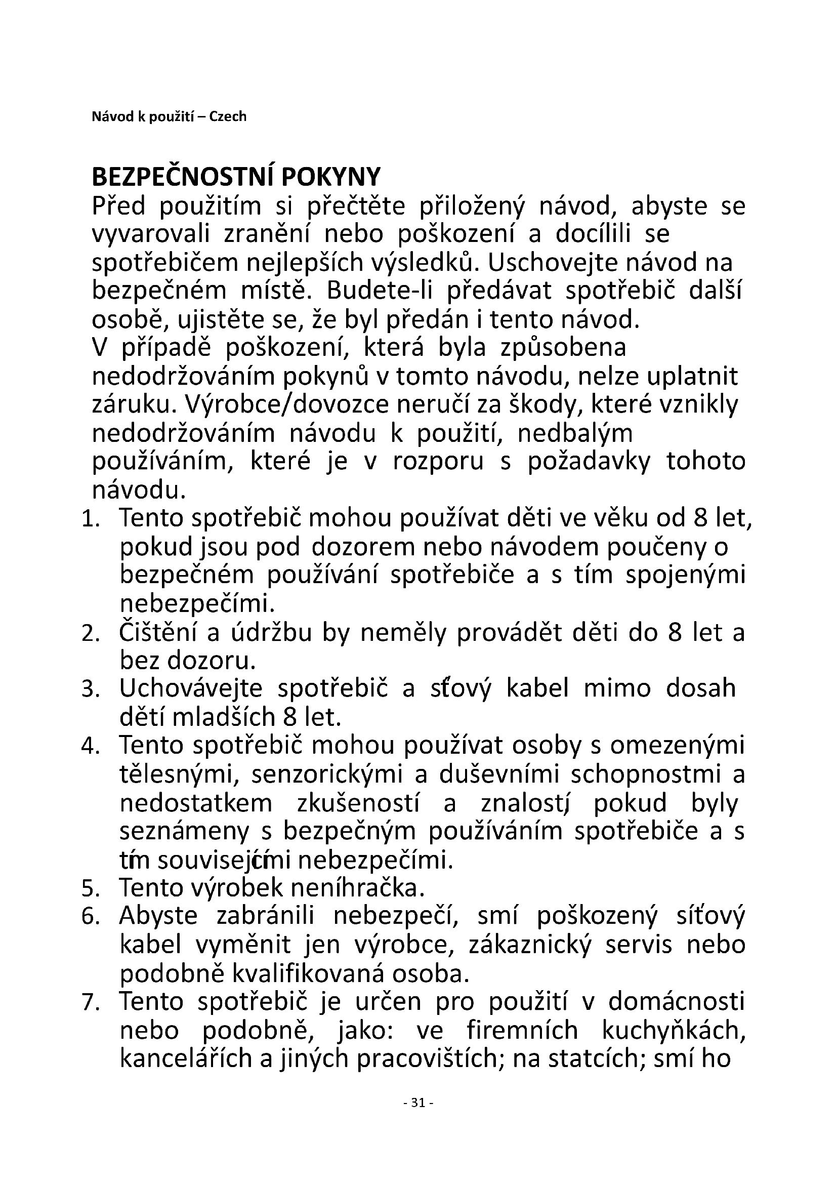 Před použitím si přečtěte přiložený návod, abyste se vyvarovali zranění nebo poškození a docílili se spotřebičem nejlepších výsledků. Uschovejte návod na bezpečném místě. Budete-li předávat spotřebič další osobě, ujistěte se, že byl předán i tento návod. V případě poškození, která byla způsobena nedodržováním pokynů v tomto návodu, nelze uplatnit záruku. Výrobce/dovozce neručí za škody, které vznikly nedodržováním návodu k použití, nedbalým používáním, které je v rozporu s požadavky tohoto návodu.