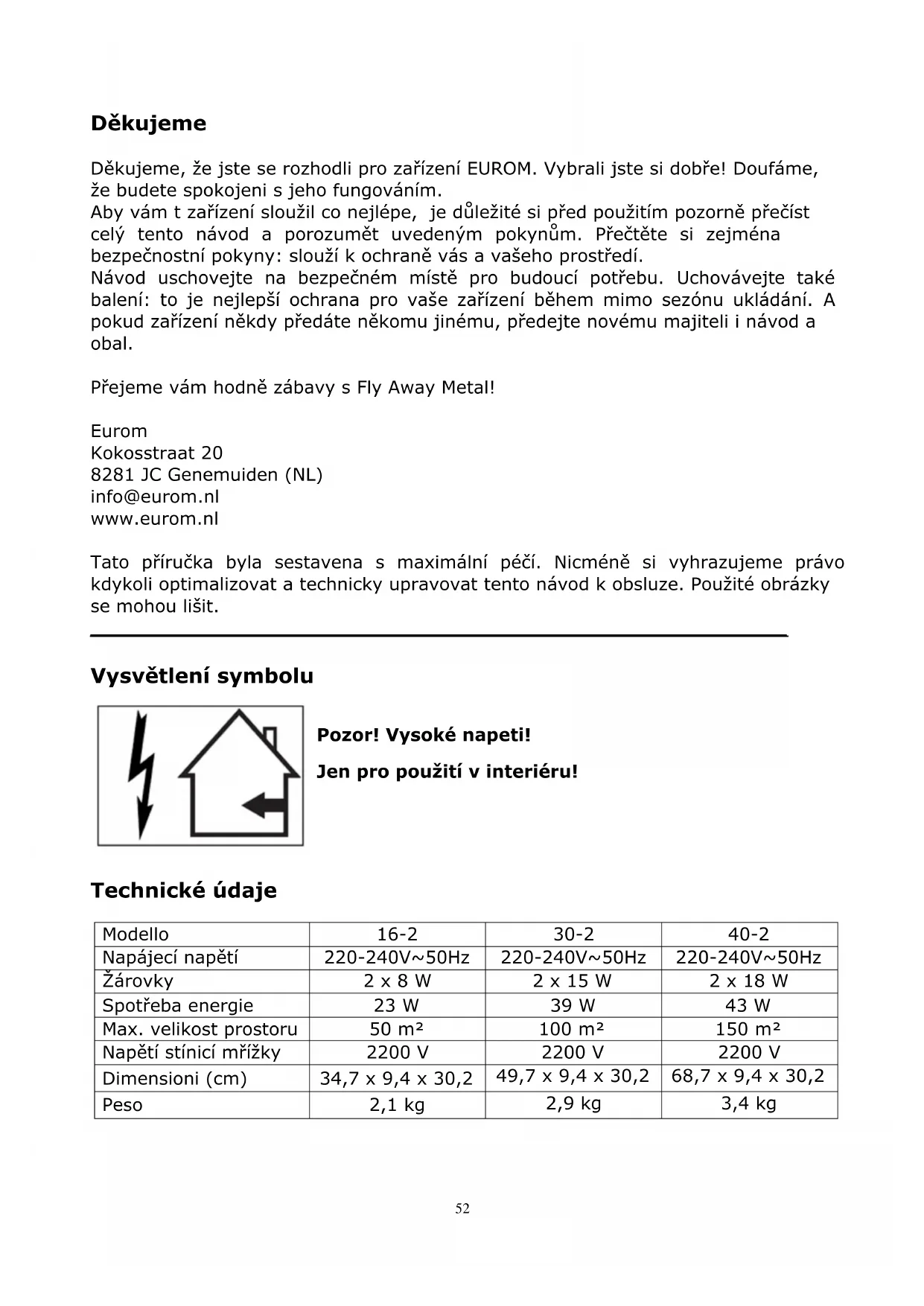 Děkujeme Děkujeme, že jste se rozhodli pro zařízení EUROM. Vybrali jste si dobře! Doufáme, že budete spokojeni s jeho fungováním. Aby vám t zařízení sloužil co nejlépe, je důležité si před použitím pozorně přečíst celý tento návod a porozumět uvedeným pokynům. Přečtěte si zejména bezpečnostní pokyny: slouží k ochraně vás a vašeho prostředí. Návod uschovejte na bezpečném místě pro budoucí potřebu. Uchovávejte také balení: to je nejlepší ochrana pro vaše zařízení během mimo sezónu ukládání. A pokud zařízení někdy předáte někomu jinému, předejte novému majiteli i návod a obal. Přejeme vám hodně zábavy s Fly Away Metal! Eurom Kokosstraat 20 8281 JC Genemuiden (NL) info@eurom.nl www.eurom.nl Tato příručka byla sestavena s maximální péčí. Nicméně si vyhrazujeme právo kdykoli optimalizovat a technicky upravovat tento návod k obsluze. Použité obrázky se mohou lišit.