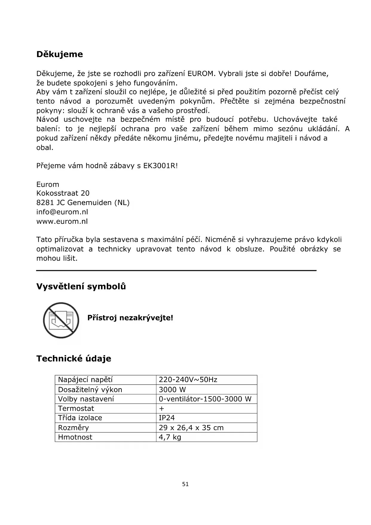 Umístění a připojení Odstraňte veškerý obalový materiál a odstraňte jej z dosahu dětí. Po odstranění obalu zkontrolujte, zda přístroj není poškozen, nebo zda nevykazuje jiné znaky možné poruchy, nebo závady. V případě pochybností přístroj nepoužívejte, ale obraťte se na dodavatele a požádejte o kontrolu nebo o výměnu. Vyberte vhodné místo pro zařízení s ohledem na všechna výše uvedená varování v tomto návodu. Ujistěte se, že je přístroj vypnutý (nastaven na pozici 0), potom jej zapojte do správně fungující zásuvky (uzemněné elektrické zásuvky). Nastavení a provoz Pokud přístroj používáte poprvé (nebo, chcete-li znovu nastavit požadovanou teplotu), otočte termostat do maximální polohy (co nejdále ve směru hodinových ručiček). Pomocí přepínače režimů nastavte přístroj podle svého přání: pouze ventilátor, s nízkým výkonem nebo s vysokým výkonem. Jakmile teplota v prostoru dosáhne požadované úrovně, pomalu otáčejte termostatem proti směru hodinových ručiček. Až uslyšíte tiché cvaknutí, nechte ciferník v této poloze. Topení bude automaticky udržovat teplotu na této úrovni. Teplota se udržuje zapínáním a vypínáním topných těles, když teplota příliš vzroste nebo poklesne. Pozor! Když termostat vypne topná tělesa, ventilátor stále pracuje. Tímto způsobem se vzduch neustále udržuje v pohybu, což přístroji umožňuje přesně měřit ochlazení prostoru. Termostat je plynule nastavitelný. Vyšší teplotu nastavíte otáčením ve směru hodinových ručiček, nižší teplotu otáčením proti směru hodinových ručiček.58 Bezpečnostní prvky V případě, že dojde k vnitřnímu přehřátí, funkce ochrany proti přehřátí přístroj automaticky vypne. V případě, že se topení vypne z důvodu přehřátí, okamžitě přepněte přepínač do polohy 0, odpojte a nechte topné těleso chladnout po dobu nejméně 10 minut. Teoreticky je nyní možno pokračovat v normálním provozu. Přehřívání zařízení však má obvyklou příčinu: topení nemůže dostatečně uvolňovat své teplo, nebo nasávat čerstvý vzduch (protože je přístroj zakrytý, jsou blokovány výstupy, topení je umístěno příliš blízko stěny tak dále). Před dalším použitím topení, odstraňte příčinu přehřívání. Pokud nemůžete nalézt příčinu a přehřátí se opakuje, přestaňte přístroj používat a kontaktujte svého prodejce / certifikovaného elektrotechnika a požádejte o kontrolu nebo opravu. Přehřátí představuje vážné riziko požáru! Čištění a údržba Udržujte topení v čistotě. Usazování prachu a nečistot v přístroji je častou příčinou přehřátí! Proto tyto usazeniny pravidelně odstraňujte. Před čištěním nebo údržbou topení vypněte, vytáhněte zástrčku ze zásuvky a nechte přístroj vychladnout. Pečlivě otřete povrch topení suchým, nebo téměř suchým hadříkem. Nepoužívejte agresivní mýdla, spreje, čističe nebo abrazivní prostředky, vosky, lešticí ani chemické roztoky! Pomocí vysavače nebo kompresoru opatrně odstraňte prach a nečistoty z topení a zajistěte, aby přívod vzduchu a výstupní otvory byly čisté. Dávejte pozor, abyste se při čištění nedotkli žádné vnitřní části a abyste ji nepoškodili! Topení neobsahuje žádné další díly vyžadující údržbu. Na konci sezóny uskladněte vyčištěný přístroj pokud možno v původním obalu. Uložte jej ve vzpřímené poloze v chladném, suchém a čistém, nezaprášeném volném prostoru. Likvidace V rámci EU tento symbol označuje, že tento výrobek nesmí být likvidován s běžným domovním odpadem. Vyřazené přístroje obsahují cenné materiály, které mohou a musí být znovu použity, aby se předešlo nepříznivým účinkům na životní prostřední a zdraví v důsledku neregulovaného sběru odpadu. Odevzdávejte proto vyřazené přístroje do určeného sběrného místa nebo se obraťte na dodavatele, kde jste přístroj zakoupili. Ten může zajistit, aby se co nejvíce částí přístroje recyklovalo.59 Prohlášení CE Eurom-Kokosstraat 20-Genemuiden-NL tímto prohlašuje, že dílenský ohřívač Eurom typu EK3001R splňuje a splňuje následující normy: LVD 2014/35/EU EN 60335-2-30:2009+A11:2012 EN 60335-1:2012+A11:2014+AC:2014+A13:2007 EN 62233:2008 EMC 2014/30/EU EN 55014-1:2017 EN 55014-2:2015 EN 61000-3-2:2014 EN 61000-3-3:2013 RoHS 2011/65/EU&(EU)2015/863 Genemuiden, 26-06-2019 W.J. Bakker, alg. dir.60 Ďakujeme Ďakujeme, že ste sa rozhodli pre zariadenie EUROM. Vybrali ste si dobre! Dúfame, že budete spokojný s jeho fungovaním. Aby ste zariadenie čo najlepšie využili, je dôležité, aby ste si pred použitím pozorne a kompletne prečítali tento návod a porozumeli inštrukciám v ňom uvedeným. Prečítajte si najmä bezpečnostné pokyny: slúžia na ochranu vás a vášho prostredia. Návod uschovajte na bezpečnom mieste pre budúce použitie. Uchovávajte tiež obal: to je najlepšia ochrana pre vaše zariadenie počas skladovania mimo sezóny. A ak zariadenie niekedy predáte, odovzdajte novému majiteľovi aj návod a obal. Prajeme vám veľa zábavy s EK3001R! Eurom Kokosstraat 20 8281 JC Genemuiden (NL) info@eurom.nl www.eurom.nl Táto príručka bola zostavená s maximálnou starostlivosťou. Napriek tomu si vyhradzujeme právo optimalizovať a technicky upraviť tento návod na obsluhu kedykoľvek. Použité obrázky sa môžu líšiť.