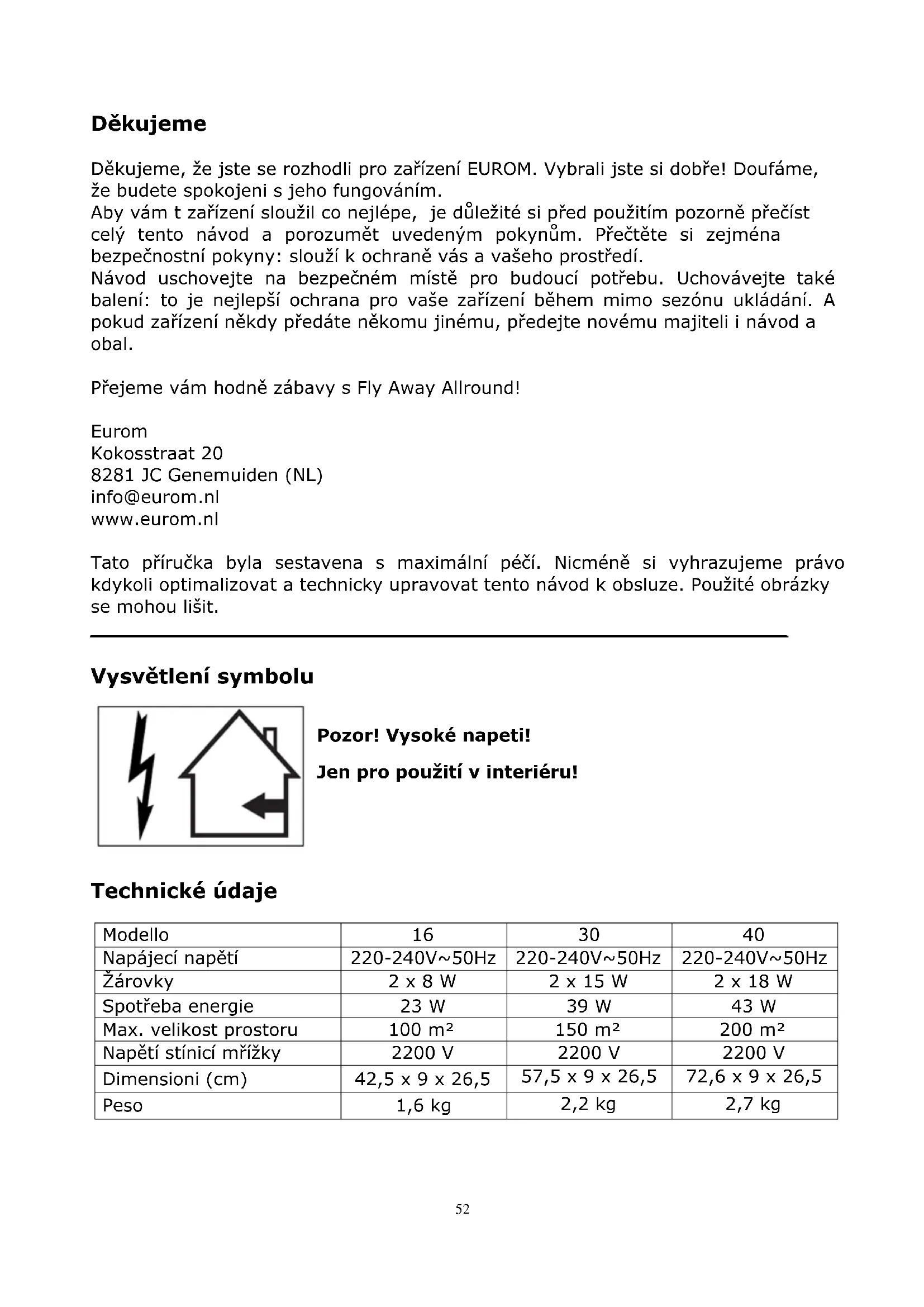 Děkujeme Děkujeme, že jste se rozhodli pro zařízení EUROM. Vybrali jste si dobře! Doufáme, že budete spokojeni s jeho fungováním. Aby vám t zařízení sloužil co nejlépe, je důležité si před použitím pozorně přečíst celý tento návod a porozumět uvedeným pokynům. Přečtěte si zejména bezpečnostní pokyny: slouží k ochraně vás a vašeho prostředí. Návod uschovejte na bezpečném místě pro budoucí potřebu. Uchovávejte také balení: to je nejlepší ochrana pro vaše zařízení během mimo sezónu ukládání. A pokud zařízení někdy předáte někomu jinému, předejte novému majiteli i návod a obal. Přejeme vám hodně zábavy s Fly Away Allround! Eurom Kokosstraat 20 8281 JC Genemuiden (NL) info@eurom.nl www.eurom.nl Tato příručka byla sestavena s maximální péčí. Nicméně si vyhrazujeme právo kdykoli optimalizovat a technicky upravovat tento návod k obsluze. Použité obrázky se mohou lišit.
