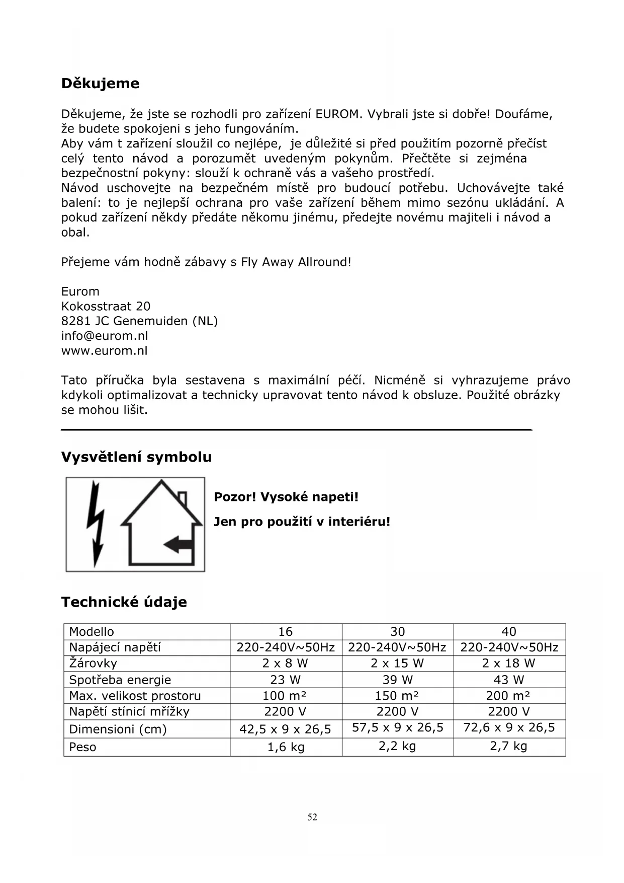 Děkujeme Děkujeme, že jste se rozhodli pro zařízení EUROM. Vybrali jste si dobře! Doufáme, že budete spokojeni s jeho fungováním. Aby vám t zařízení sloužil co nejlépe, je důležité si před použitím pozorně přečíst celý tento návod a porozumět uvedeným pokynům. Přečtěte si zejména bezpečnostní pokyny: slouží k ochraně vás a vašeho prostředí. Návod uschovejte na bezpečném místě pro budoucí potřebu. Uchovávejte také balení: to je nejlepší ochrana pro vaše zařízení během mimo sezónu ukládání. A pokud zařízení někdy předáte někomu jinému, předejte novému majiteli i návod a obal. Přejeme vám hodně zábavy s Fly Away Allround! Eurom Kokosstraat 20 8281 JC Genemuiden (NL) info@eurom.nl www.eurom.nl Tato příručka byla sestavena s maximální péčí. Nicméně si vyhrazujeme právo kdykoli optimalizovat a technicky upravovat tento návod k obsluze. Použité obrázky se mohou lišit.