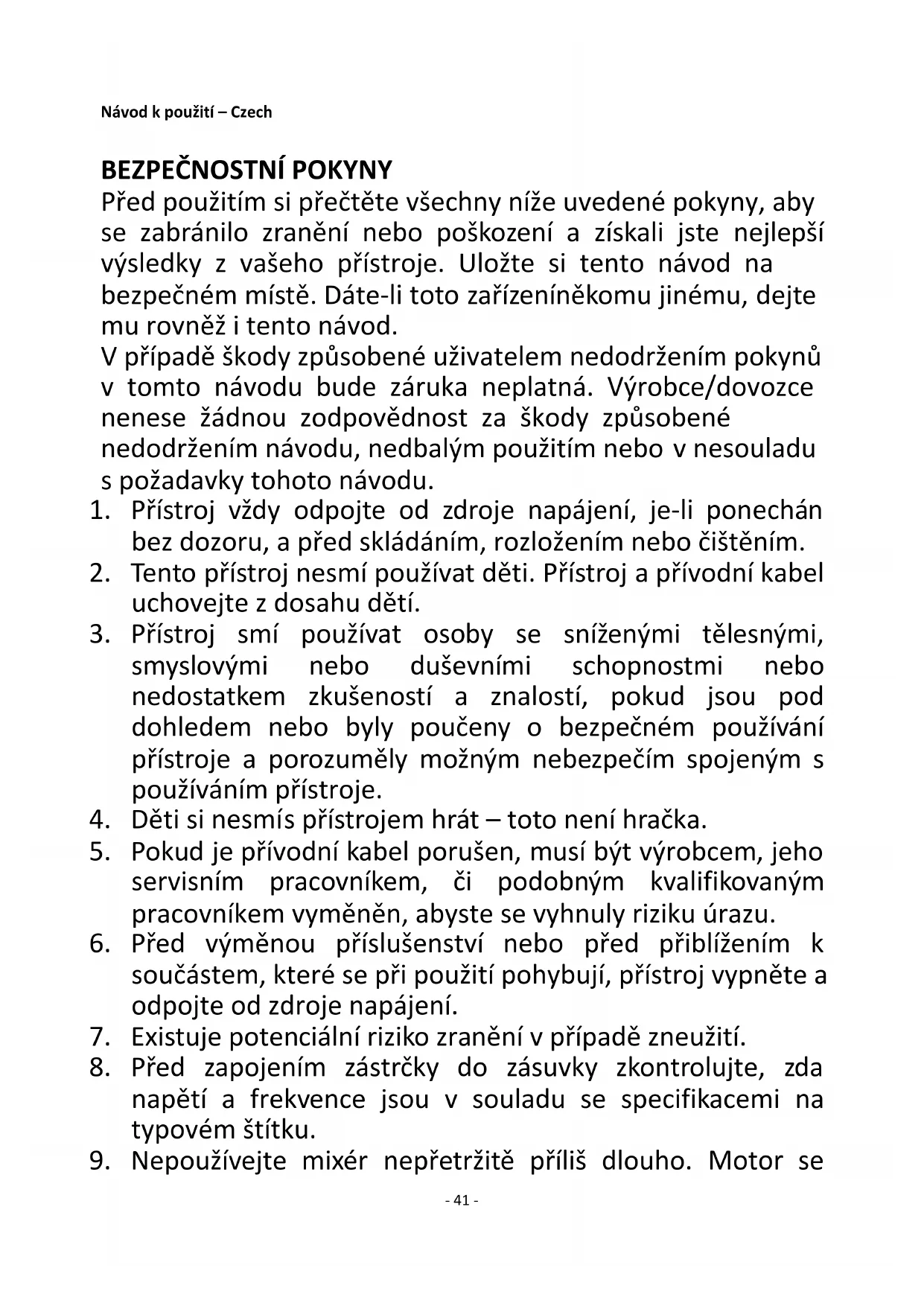 9. Nepoužívejte mixér nepřetržitě příliš dlouho. Motor se- 42 -