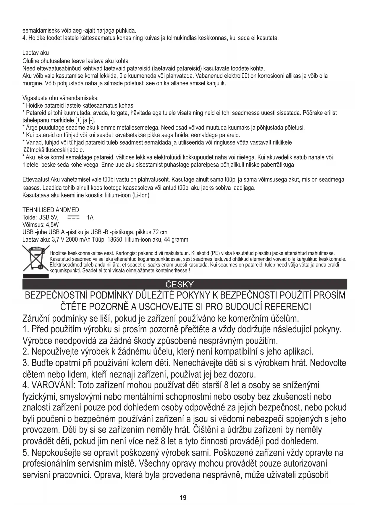 - V případě vytečení baterií vyjměte baterie, aby se uniklý elektrolyt nedostal do styku s pokožkou nebo oděvem. Pokud se jakákoli kapalina z baterie dostane do kontaktu s vaší pokožkou nebo oděvem, okamžitě ji omyjte vodou. Před vložením nové baterie důkladně vyčistěte přihrádku na baterie vlhkou papírovou utěrkou Upozornění Při výměně baterie za nesprávný typ existuje riziko výbuchu. Používejte pouze baterii stejného typu a výkonu, jaká je dodávána se zařízením. Nabíjení by mělo být prováděno pouze s použitím nabíječky dodané s výrobkem nebo vhodné pro daný typ baterie. Chemické složení použité baterie: lithium-iontová (Li-Ion) TECHNICKÁ DATA Příkon: USB 5V, 1A Výkon: 4,5W USB kabel s konektorem USB A a mikro zástrčkou USB B, délka 72 cm Dobíjecí baterie: 3,7 V 2000 mAh Typ: 18650, lithium-iontová baterie, 44 gramů CONDIȚII DE SIGURANȚĂ INSTRUCȚIUNI IMPORTANTE PRIVIND SIGURANȚA DE UTILIZARE CITIȚI CU ATENȚIE ȘI PĂSTRAȚI PENTRU REFERINȚA VIITORĂ Condițiile de garanție sunt diferite, dacă dispozitivul este utilizat în scopuri comerciale.
