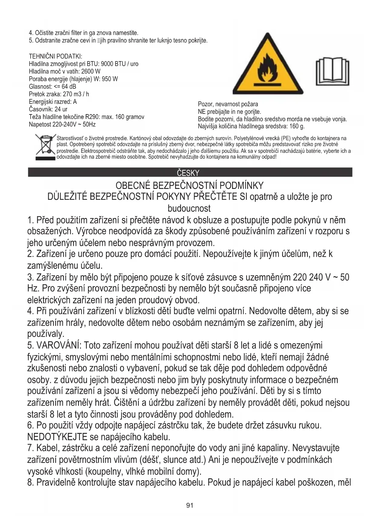 TECHNICKÁ DATA: Chladicí výkon při BTU: 9000 BTU / hod Chladicí výkon ve wattech: 2 600 W Spotřeba energie (chlazení) W: 950 W Hlasitost: <= 64 dB Průtok vzduchu: 270 m3 / h Energetická třída: A. Časovač: 24 hodin Hmotnost chladiva R290: max. 160 gramů Napětí 220-240V ~ 50Hz97