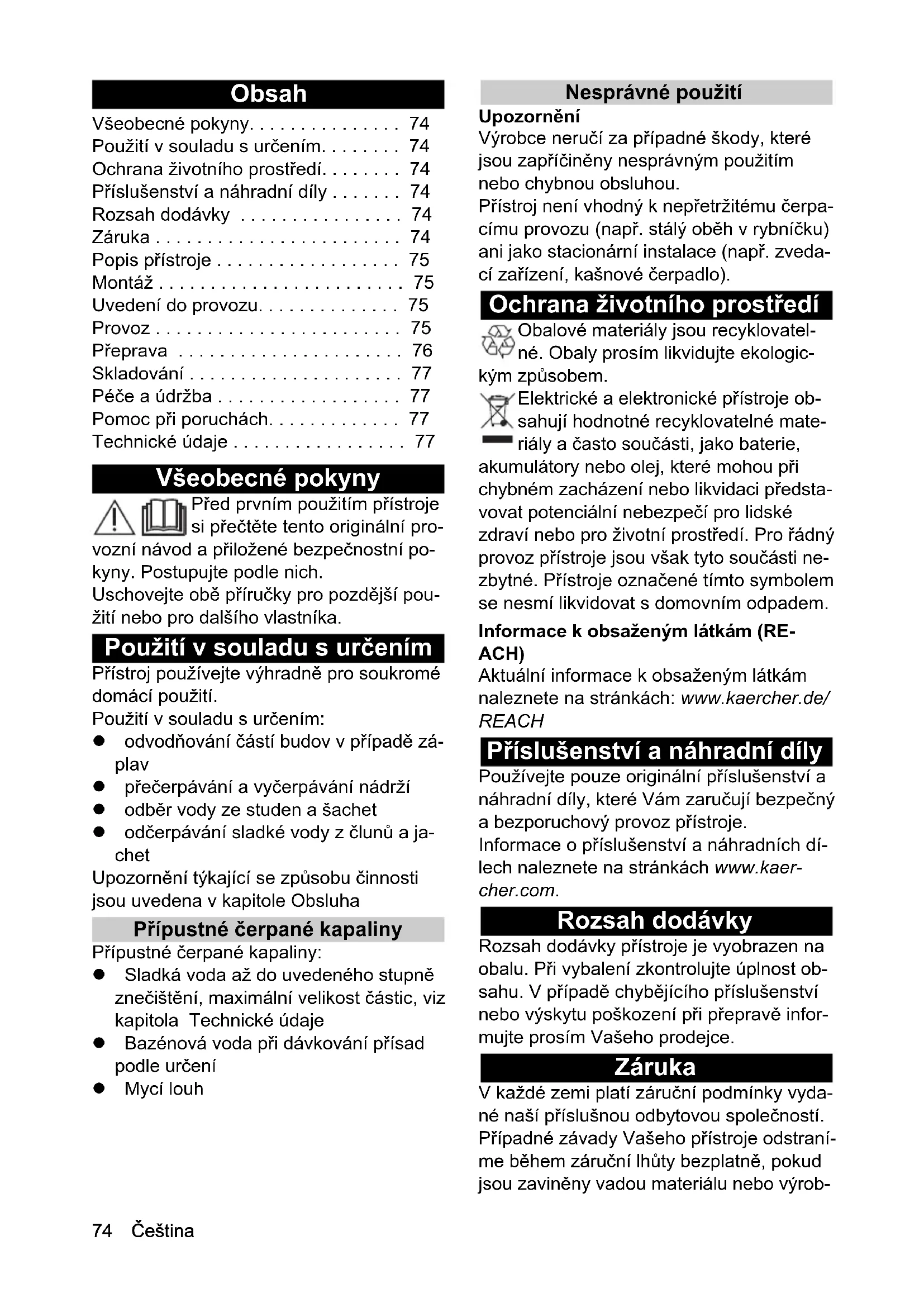 - Kézi üzemmód Szennyeződés- és tisztavíz- szállítás minimális folyadék- magassága mm 60 Szennyeződés- és tisztavíz- szállítás maradék folyadék- magassága mm 25 Lapos felszívás minimális fo- lyadékmagassága mm 40 Lapos felszívás maradék fo- lyadékmagassága mm 1 Méretek és súlyok Súly (tartozékok nélkül) kg 4,8 Hálózati kábel Kábelhossz m 1074 Čeština Obsah Všeobecné pokyny Před prvním použitím přístroje si přečtěte tento originální pro- vozní návod a přiložené bezpečnostní po- kyny. Postupujte podle nich. Uschovejte obě příručky pro pozdější pou- žití nebo pro dalšího vlastníka. Použití v souladu s určením Přístroj používejte výhradně pro soukromé domácí použití. Použití v souladu s určením: odvodňování částí budov v případě zá- plav přečerpávání a vyčerpávání nádrží odběr vody ze studen a šachet odčerpávání sladké vody z člunů a ja- chet Upozornění týkající se způsobu činnosti jsou uvedena v kapitole Obsluha Přípustné čerpané kapaliny Přípustné čerpané kapaliny: Sladká voda až do uvedeného stupně znečištění, maximální velikost částic, viz kapitola Technické údaje Bazénová voda při dávkování přísad podle určení Mycí louh Nesprávné použití Upozornění Výrobce neručí za případné škody, které jsou zapříčiněny nesprávným použitím nebo chybnou obsluhou. Přístroj není vhodný k nepřetržitému čerpa- címu provozu (např. stálý oběh v rybníčku) ani jako stacionární instalace (např. zveda- cí zařízení, kašnové čerpadlo). Ochrana životního prostředí Obalové materiály jsou recyklovatel- né. Obaly prosím likvidujte ekologic- kým způsobem. Elektrické a elektronické přístroje ob- sahují hodnotné recyklovatelné mate- riály a často součásti, jako baterie, akumulátory nebo olej, které mohou při chybném zacházení nebo likvidaci předsta- vovat potenciální nebezpečí pro lidské zdraví nebo pro životní prostředí. Pro řádný provoz přístroje jsou však tyto součásti ne- zbytné. Přístroje označené tímto symbolem se nesmí likvidovat s domovním odpadem. Informace k obsaženým látkám (RE- ACH) Aktuální informace k obsaženým látkám naleznete na stránkách: www .kaercher.de/ REACH Příslušenství a náhradní díly Používejte pouze originální příslušenství a náhradní díly, které Vám zaručují bezpečný a bezporuchový provoz přístroje. Informace o příslušenství a náhradních dí- lech naleznete na stránkách www.kaer- cher.com. Rozsah dodávky Rozsah dodávky přístroje je vyobrazen na obalu. Při vybalení zkontrolujte úplnost ob- sahu. V případě chybějícího příslušenství nebo výskytu poškození při přepravě infor- mujte prosím Vašeho prodejce. Záruka V každé zemi platí záruční podmínky vyda- né naší příslušnou odbytovou společností. Případné závady Vašeho přístroje odstraní- me během záruční lhůty bezplatně, pokud jsou zaviněny vadou materiálu nebo výrob- Všeobecné pokyny p. 74