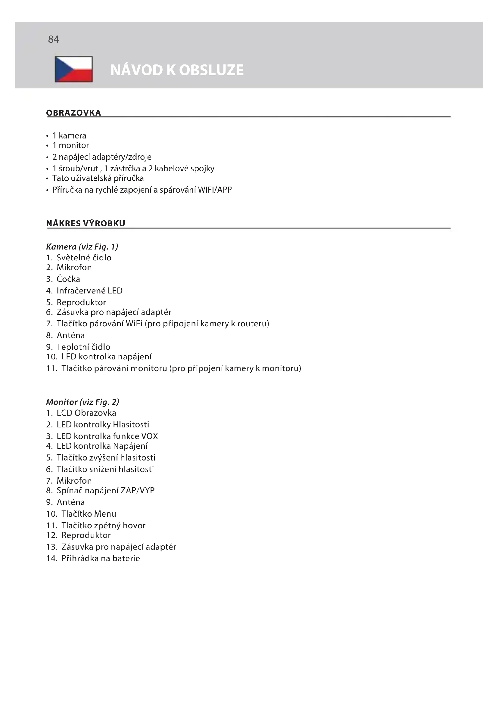 NASTAVENÍ1. NASTAVENÍ KAMERY A MONITORU1.1 Napájení kameryZasuňte příslušný konec kabelu přiloženého napájecího adaptéru do zdířky v kameře a adaptér zapojte do síťové zásuvky. Kamera se po připojení automaticky zapne. (viz Fig. 3).POZNÁMKA: Pro kameru použijte adaptér označený Output: 5V DC 2.0A.1.2 Umístění kameryUmístěte kameru na vhodné místo, namiřte čočku směrem ke sledované oblasti.POZNÁMKA: Neotáčejte ručně kamerou! Otáčení hlavou kamery musí být prováděno výhradně pomocí menu monitor(viz Fig. 11).1.3 Noční viděníKamera je pro zobrazení jasného obrazu při temnotě vybavena osmi LED diodami o vysoké intenzitě. Když světelné čidlo zjistí nízkou úroveň okolního světla, jsou LED automaticky aktivovány.1.4 Měření pokojové teplotyTeplotní čidlo měří pokojovou teplotu u kamery. Teplota bude zobrazena na obra-zovce monitoru.1.5 Napájení monitoruMonitor má v sobě zabudovanou 3.7V 2600mAh (Li-ion) baterii a používá běžné domácí síťové napájení.1. Zasuňte příslušný konec kabelu přiloženého napájecího adaptéru do zdířky v kameře a adaptér zapojte do síťové zásuvky. (viz Fig. 4).2. Otevřete přihrádku na baterie na zadní straně monitoru. Připojte baterii k moni-toru, vložte baterii do přihrádky a zavřete přihrádku na baterie.3. Posuňte spínač napájení do pozice ‘ON (ZAP)’(viz Fig. 4).POZNÁMKA 1: Pro monitor použijte adaptér označený OUTPUT (VÝSTUP): 5V DC 1.0A. POZNÁMKA 2: Pokud je napájení připojeno k monitoru, LED kontrolka “Power” se zeleně rozsvítí.Pokud je baterie vybitá, LED kontrolka “Power” začne červeně blikat.Když se baterie nabíjí, LED kontrolka “Power” svítí červeně.Jakmile je baterie plně nabitá, LED kontrolka “Power” zhasne (pokud je monitor vyp-nutý)POZNÁMKA 3: Pokud jsou monitor a kamera od sebe příliš vzdáleny, bude na LCD obrazovce zobrazeno “” (mimo dosah - out of range)2. TLAČÍTKA MONITORU2.1 Nastavení hlasitostiPro nastavení požadované úrovně hlasitosti stiskněte zesílit, nebo zeslabit (viz Fig. 5).2.2 Funkce zpětného hovoruPro hovor pomocí kamerové jednotky stiskněte a držte tlačítko zpětného hovoru(talk back button), na obrazovce se zobrazí příslušné ikony (viz Fig. 6). CZ86