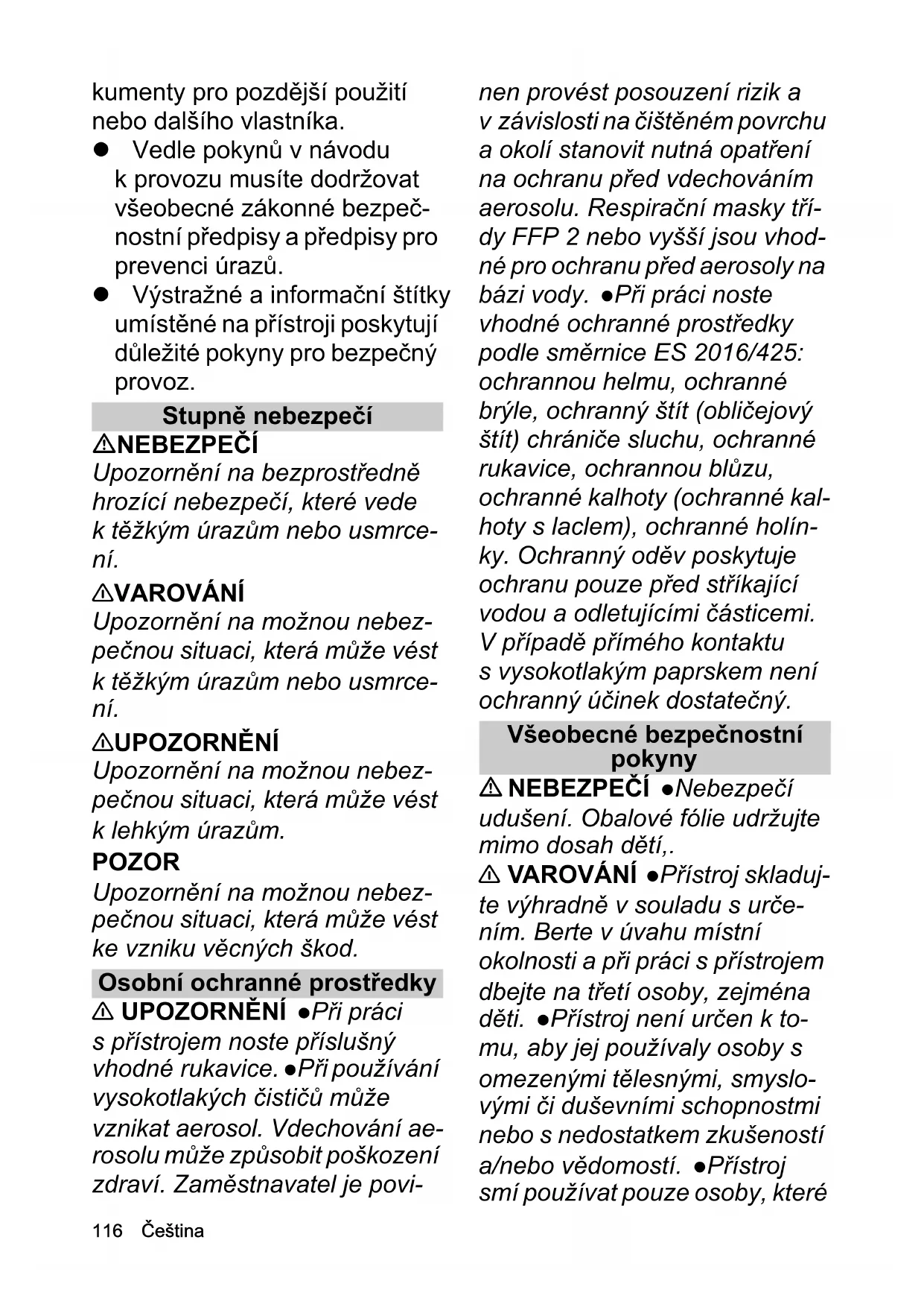 nepříznivých podmínek v síti může být nepříznivě ovlivněno fungování jiných přístrojů. Při nižší impedanci sítě než 0,15 ohmů se nepředpokládají žádné poruchy. Vodní přípojka 몇 VAROVÁNÍ Šroubení všech připojovacích hadic musí být těsná. Nepřekračujte přípust- nou teplotu vody na přívodu. Hadicová vedení pokládejte bezpečným způsobem. POZOR Používejte pouze ha- dicová vedení, která odpovídají požadavkům na provozní tlak, mechanické a chemické zatíže- ní. Nezmenšujte minimální pří- pustný poloměr ohybu hadicových vedení. Vyměňuj- te hadicová vedení v přiměřených časových inter- valech i když nevykazují žádné závady. Hadicová vedení mají omezenou životnost. Dodržuj- te předpisy stanovené místní vo- dárnou. Vysokotlaká přípojka NEBEZPEČÍ Používejte ha- dicové návleky, ochranné pota- hy nebo stínění, abyste vyloučili rizika od hadicových vedení. 몇 VAROVÁNÍ Přístroj nesmí- te uvádět do provozu, pokud je vysokotlaká hadice poškozená. Poškozenou vysokotlakou hadi- ci neprodleně vyměňte. Smí se používat pouze hadice a spojky doporučené výrobcem. Obj. č. viz návod k použití. Nevysta- vujte hadicová vedení žádném mechanickému, chemickému nebo tepelnému zatížení. Šroubení všech vysokotlakých hadic musí být těsné. Připojo- vací šroubení utahujte utahova- cím momentem maximálně 20 Nm. Používejte některé za- chycovací zařízení hadic. Pou- žívejte pouze vysokotlaké hadice a příslušenství, jejichž přípustný provozní tlak odpoví- dá minimálně přípustnému tlaku přístroje. Denně vysokotlaké hadice kontrolujte. Nepoužívej- te zalomené vysokotlaké hadi- ce. Nepoužívejte vysokotlaké hadice, u kterých je viditelná vnější drátěná vrstva. Nepouží- vejte vysokotlaké hadiceČeština 119 s poškozeným závitem. Nepo- užívejte vysokotlakou hadici, která byla vystavena přejetí, za- lomení nebo nárazu, i když není žádné poškození viditelné. Vy- sokotlaké hadice pokládejte tak, aby nemohlo dojít k jejich přeje- tí. Vystupující kapalina může způsobit zranění. Nevyhledávej- te úniky holýma rukama. 몇 UPOZORNĚNÍ Vysokotlaké hadice skladujte ak, aby nebyly vystaveny mechanickému zatí- žení. Provoz NEBEZPEČÍ Neodborné uvedení vysokotlakého čističe do provozu je nebezpečné a může vést k tělesným zraněním, za určitých okolností s následkem smrti. Přístroj provozujte jen tehdy, když jsou uzavřené všechny kapoty, kryty a elektrické skříně. Nikdy pří- stroj neponechávejte bez dozo- ru, dokud je v provozu. V případě poruchy elektrického napájení přístroj vypněte, abys- te zabránili nekontrolovanému opětovnému rozběhu po odstra- nění poruchy. Během pracov- ních přestávek přístroj zajistěte proti neoprávněnému používá- ní. Nepracujte s přístrojem, po- kud jste pod vlivem léků nebo alkoholu. Pracovní prostor za- jistěte proti vstupu nepovola- ných osob výrazným viditelným způsobem. Umístěte výstražné štítky a zábrany. V pracovní ob- lasti (okruh 10 m) se smí zdržo- vat pouze operátor. Pří práci na lešení se zajistěte pomocí vhodných opatření proti pádu. Působením sil zpětných rázů hrozí nebezpečí pádu. Při prá- ci stůjte na pevném podkladu. V každém okamžiku musíte mít pevný postoj. Vzájemně odlaď- te trysku a provozní tlak tako- vým způsobem, aby operátor mohl zvládat vznikající zpětný ráz. Síla zpětného rázu nesmí překročit 250 N (25 kp). Použí- vejte pouze příslušenství k čistění potrubí se značkou, která umožňuje včasné rozpo- znání výstupu trysky. Vzdále- nost mezi tryskou a značkou činí 500 mm. Před aktivací vyso- kotlakého paprsku zaveďte pří- slušenství k čištění potrubí minimálně 500 mm do čištěné trubky. Při použití přístroje v nebezpečných místech (např. čerpací stanice) dodržujte pří- slušné bezpečnostní předpisy. Provoz v oblastech s nebezpečím výbuchu je zaká- zán. Nikdy nevysávejte roz- pouštědla, kapaliny s obsahem rozpouštědel nebo neředěné ky- seliny. Mezi patří např. benzin, ředidla do barev nebo topný olej. Rozprášená mlha je vysoce vznětlivá, výbušná a toxická.120 Čeština 몇 VAROVÁNÍ Okamžitě od- straňujte rizikové okolnosti. Do- držujte národní předpisy ochrany zdraví při práci v uzavřených prostorách. Vy- střikující vodní paprsek působí na pracovní nástavec reaktivní silou. V důsledku zalomení pra- covního nástavce působí síla směrem nahoru. Pistole a pra- covní nástavec pevně uchopte. l Nesměřujte vysokotlaký papr- sek na sebe, např. kvůli čištění oděvu nebo obuvi. Nesměřuj- te vysokotlaký paprsek na oso- by, zvířata, aktivní elektrická zařízení nebo na přístroj samot- ný. Neostřikujte žádné před- měty, které obsahují látky poškozující zdraví (např. az- best). Před každým spuštěním provozu zkontrolujte přístroj a příslušenství jako např. vyso- kotlakou hadici, vysokotlakou pistoli a bezpečnostní zařízení, zda jsou v řádném stavu a pro- vozně bezpečné. Poškozený přístroj nepoužívejte. Poškoze- né komponenty neprodleně vy- měňte. 몇 UPOZORNĚNÍ Udržujte své pracoviště čisté a přehled- né. Jestliže síla zpětného rázu překračuje 150 N (15 kp), vy- bavte ručně držené stříkací zaří- zení opěrou na tělo. Nikdy přístroj neponechávejte bez do- zoru, dokud je v provozu. Ni- kdy neotevírejte kapotu, pokud je motor v chodu. Při provozu nearetujte páku vysokotlaké pis- tole. Přístroj musí stát na rov- ném, pevném podkladu. POZOR Dodržujte místní bez- pečnostní pokyny a předpisy pro prevenci úrazů. Nikdy nepro- vozujte přístroj při teplotách niž- ších než 0 °C. Upozornění D