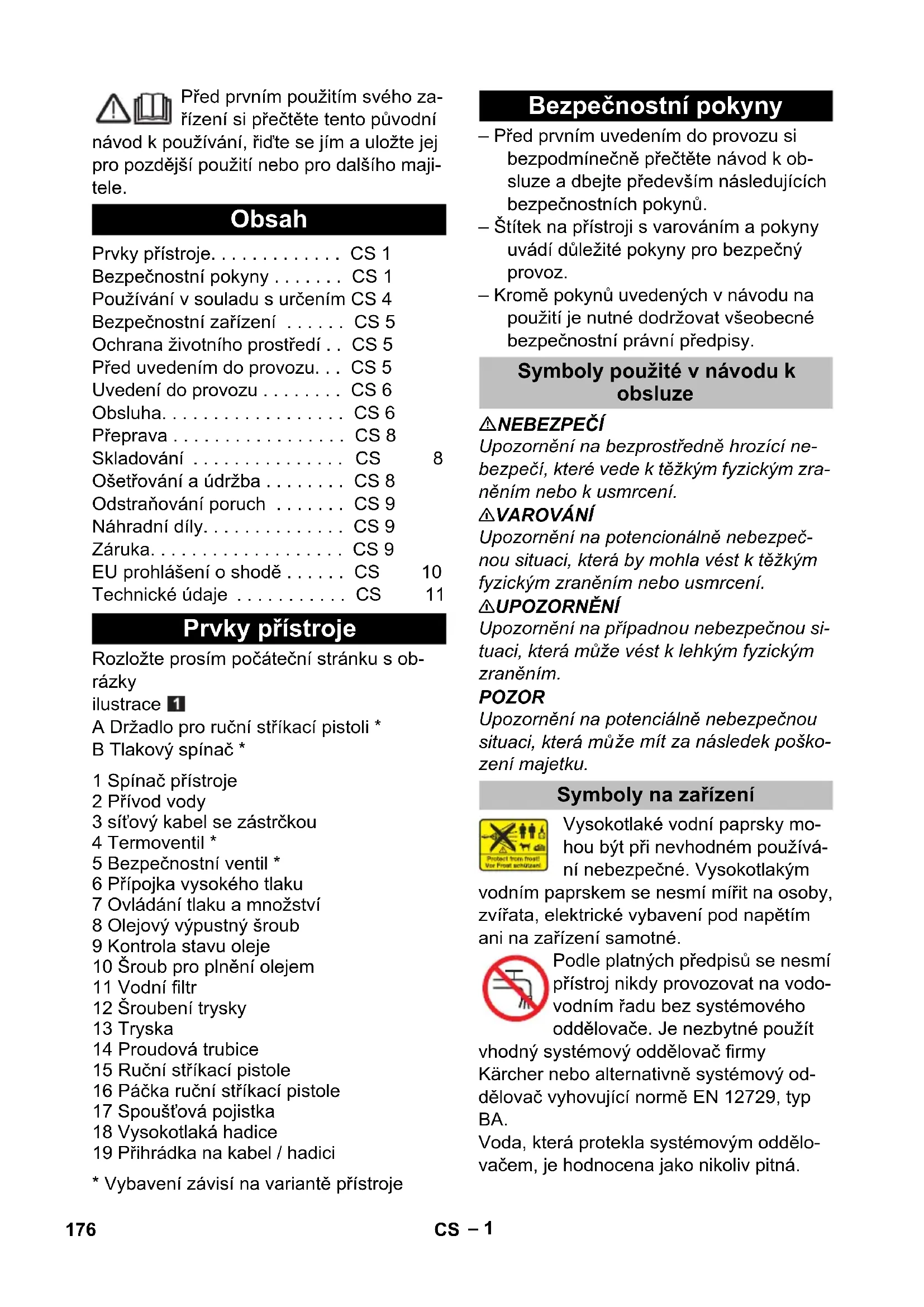 • Vybavení závisí na variantě přístroje – Před prvním uvedením do provozu si bezpodmínečně přečtěte návod k ob- sluze a dbejte především následujících bezpečnostních pokynů. – Štítek na přístroji s varováním a pokyny uvádí důležité pokyny pro bezpečný provoz. – Kromě pokynů uvedených v návodu na použití je nutné dodržovat všeobecné bezpečnostní právní předpisy. NEBEZPEČÍ Upozornění na bezprostředně hrozící ne- bezpečí, které vede k těžkým fyzickým zra- něním nebo k usmrcení. 몇 VAROVÁNÍ Upozornění na potencionálně nebezpeč- nou situaci, která by mohla vést k těžkým fyzickým zraněním nebo usmrcení. 몇 UPOZORNĚNÍ Upozornění na případnou nebezpečnou si- tuaci, která může vést k lehkým fyzickým zraněním. POZOR Upozornění na potenciálně nebezpečnou situaci, která mů že mít za následek poško- zení majetku. Vysokotlaké vodní paprsky mo- hou být při nevhodném používá- ní nebezpečné. Vysokotlakým vodním paprskem se nesmí mířit na osoby, zvířata, elektrické vybavení pod napětím ani na zařízení samotné. Podle platných předpisů se nesmí přístroj nikdy provozovat na vodo- vodním řadu bez systémového oddělovače. Je nezbytné použít vhodný systémový oddělovač firmy Kärcher nebo alternativně systémový od- dělovač vyhovující normě EN 12729, typ BA. Voda, která protekla systémovým oddělo- vačem, je hodnocena jako nikoliv pitná. Obsah Prvky přístroje. . . . . . . . . . . . . CS 1 Bezpečnostní pokyny . . . . . . . CS 1 Používání v souladu s určením CS 4 Bezpečnostní zařízení . . . . . . CS 5 Ochrana životního prostředí . . CS 5 Před uvedením do provozu. . . CS 5 Uvedení do provozu . . . . . . . . CS 6 Obsluha. . . . . . . . . . . . . . . . . . CS 6 Přeprava . . . . . . . . . . . . . . . . . CS 8 Skladování . . . . . . . . . . . . . . . CS 8 Ošetřování a údržba . . . . . . . . CS 8 Odstraňování poruch . . . . . . . CS 9 Náhradní díly. . . . . . . . . . . . . . CS 9 Záruka. . . . . . . . . . . . . . . . . . . CS 9 EU prohlášení o shodě . . . . . . CS 10 Technické údaje . . . . . . . . . . . CS 11 Prvky přístroje Bezpečnostní pokyny Symboly použité v návodu k obsluze Symboly na zařízení 176 CS– 2 Přístroj obsahuje horké plochy, které mohou vést k popáleninám. Nebezpečí zasažení elektrickým proudem. Pouzdro smí otevírat pouze kvalifikovaný elektrotech- nický personál. – Údaje o napětí uvedené na typovém štítku přístroje musí souhlasit s napětím uzemnění. – Minimální pojistka zástrčky (viz Tech- nické údaje). – Ochranná třída I – Přístroje je povoleno zapojovat pouze do řádně uzemněných zdrojů elektrického proudu. – Tento přístroj doporučujeme připojovat jen do zástrčky, která je vybavena 30 mA proudovým chráničem. – Používejte síťové připojení předepsané výrobcem. Totéž platí i pro výměnu ve- dení. Objednací číslo a typ viz Návod k použití. – Před každým použitím přístroje zkont- rolujte, zda napájecí vedení a zástrčka nejsou poškozeny. Poškozené napáje- cí vedení je nutné nechat neprodleně vyměnit autorizovanou servisní služ- bou, resp. odborníkem na elektrické pří- stroje. – Přístroj smí být zapojen jen do takové- ho el. přívodu, který byl instalován kva- lifikovaným elektrikářem v souladu s mezinárodní normou IEC 60364-1 o elektrické instalaci budov.