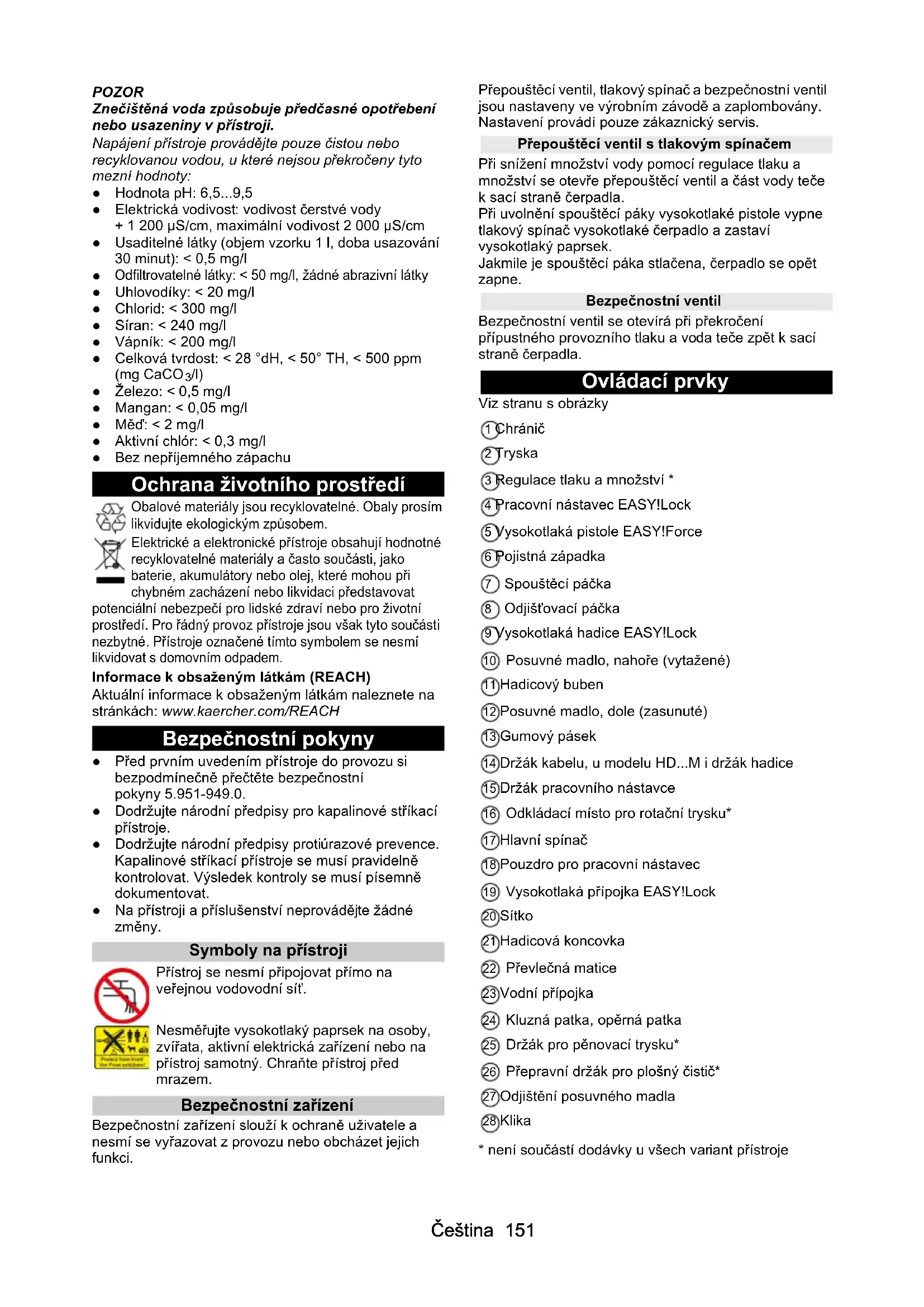 /l) ● Železo: < 0,5 mg/l ● Mangan: < 0,05 mg/l ● Měď: < 2 mg/l ● Aktivní chlór: < 0,3 mg/l ● Bez nepříjemného zápachu Ochrana životního prostředí Obalové materiály jsou recyklovatelné. Obaly prosím likvidujte ekologickým způsobem. Elektrické a elektronické přístroje obsahují hodnotné recyklovatelné materiály a často součásti, jako baterie, akumulátory nebo olej, které mohou při chybném zacházení nebo likvidaci představovat potenciální nebezpečí pro lidské zdraví nebo pro životní prostředí. Pro řádný provoz přístroje jsou však tyto součásti nezbytné. Přístroje označené tímto symbolem se nesmí likvidovat s domovním odpadem. Informace k obsaženým látkám (REACH) Aktuální informace k obsaženým látkám naleznete na stránkách: www.kaercher.com/REACH Bezpečnostní pokyny ● Před prvním uvedením přístroje do provozu si bezpodmínečně přečtěte bezpečnostní pokyny 5.951-949.0. ● Dodržujte národní předpisy pro kapalinové stříkací přístroje. ● Dodržujte národní předpisy protiúrazové prevence. Kapalinové stříkací přístroje se musí pravidelně kontrolovat. Výsledek kontroly se musí písemně dokumentovat. ● Na přístroji a příslušenství neprovádějte žádné změny. Symboly na přístroji Přístroj se nesmí připojovat přímo na veřejnou vodovodní síť. Nesměřujte vysokotlaký paprsek na osoby, zvířata, aktivní elektrická zařízení nebo na přístroj samotný. Chraňte přístroj před mrazem. Bezpečnostní zařízení Bezpečnostní zařízení slouží k ochraně uživatele a nesmí se vyřazovat z provozu nebo obcházet jejich funkci. Přepouštěcí ventil, tlakový spínač a bezpečnostní ventil jsou nastaveny ve výrobním závodě a zaplombovány. Nastavení provádí pouze zákaznický servis. Přepouštěcí ventil s tlakovým spínačem Při snížení množství vody pomocí regulace tlaku a množství se otevře přepouštěcí ventil a část vody teče k sací straně čerpadla. Při uvolnění spouštěcí páky vysokotlaké pistole vypne tlakový spínač vysokotlaké čerpadlo a zastaví vysokotlaký paprsek. Jakmile je spouštěcí páka stlačena, čerpadlo se opět zapne. Bezpečnostní ventil Bezpečnostní ventil se otevírá při překročení přípustného provozního tlaku a voda teče zpět k sací straně čerpadla. Ovládací prvky Viz stranu s obrázky 1 Chránič 2 Tryska 3 Regulace tlaku a množství * 4 Pracovní nástavec EASY!Lock 5 Vysokotlaká pistole EASY!Force 6 Pojistná západka 7 Spouštěcí páčka 8 Odjišťovací páčka 9 Vysokotlaká hadice EASY!Lock 10 Posuvné madlo, nahoře (vytažené) 11 Hadicový buben 12 Posuvné madlo, dole (zasunuté) 13 Gumový pásek 14 Držák kabelu, u modelu HD...M i držák hadice 15 Držák pracovního nástavce 16 Odkládací místo pro rotační trysku* 17 Hlavní spínač 18 Pouzdro pro pracovní nástavec 19 Vysokotlaká přípojka EASY!Lock 20 Sítko 21 Hadicová koncovka 22 Převlečná matice 23 Vodní přípojka 24 Kluzná patka, opěrná patka 25 Držák pro pěnovací trysku* 26 Přepravní držák pro plošný čistič* 27 Odjištění posuvného madla 28 Klika