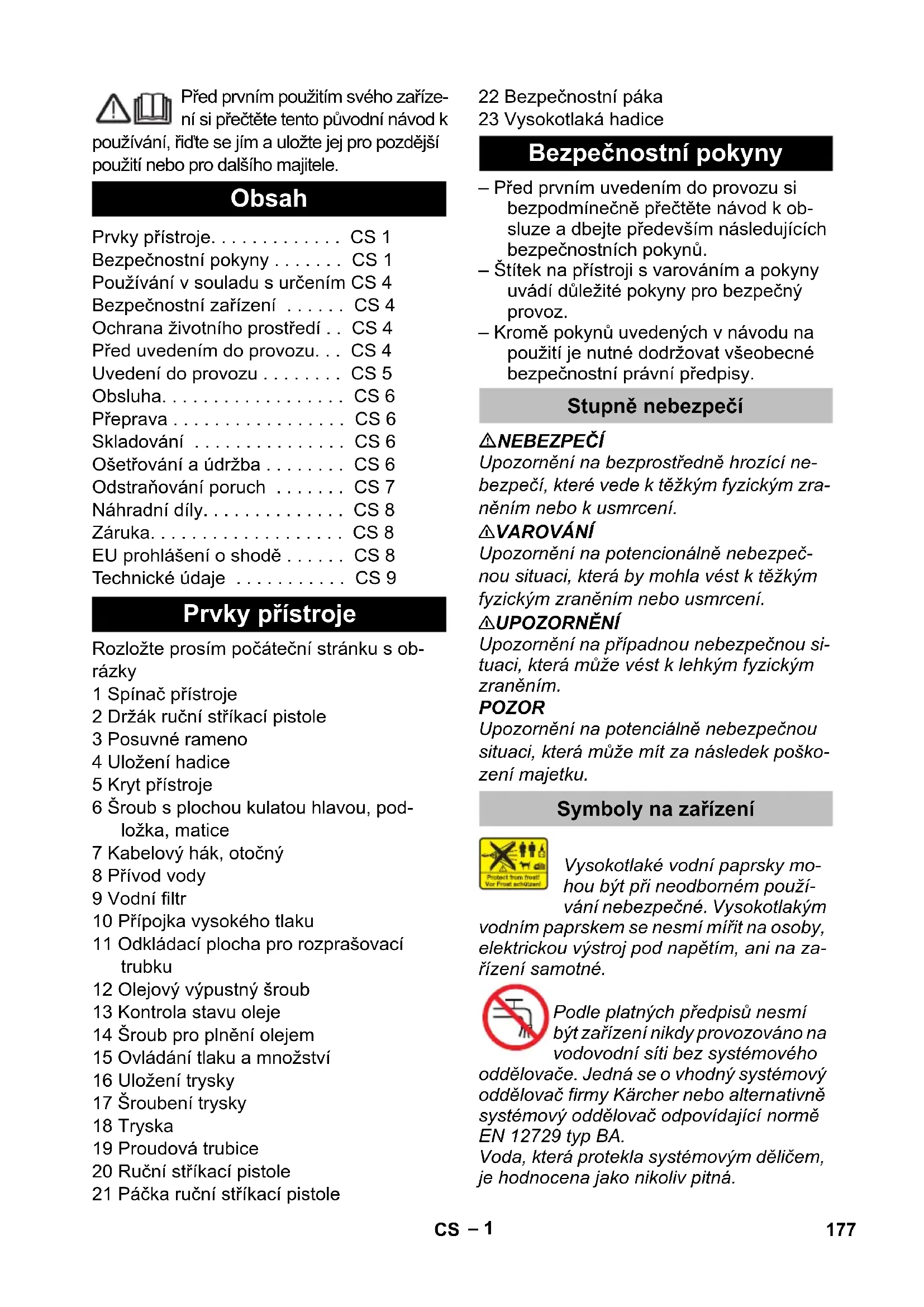 dB(A) 95 93 Üzemanyagok Olaj mennyiség l 0,4 Olaj fajta -- 15W40 Méretek és súly Hossz mm 700 szélesség mm 455 magasság mm 1010 Tömeg kg 55,4 60,9 A kivétel oka az (EU) 2019/1781 rendelet I. mellékletének 2. szakaszának 12. pontja sze- rint: j) 176 HU– 1 Před prvním použitím svého zaříze- ní si přečtěte tento původní návod k používání, řiďte se jím a uložte jej pro pozdější použití nebo pro dalšího majitele. Rozložte prosím počáteční stránku s ob- rázky 1 Spínač přístroje 2 Držák ruční stříkací pistole 3 Posuvné rameno 4 Uložení hadice 5 Kryt přístroje 6 Šroub s plochou kulatou hlavou, pod- ložka, matice 7 Kabelový hák, otočný 8 Přívod vody 9 Vodní filtr 10 Přípojka vysokého tlaku 11 Odkládací plocha pro rozprašovací trubku 12 Olejový výpustný šroub 13 Kontrola stavu oleje 14 Šroub pro plnění olejem 15 Ovládání tlaku a množství 16 Uložení trysky 17 Šroubení trysky 18 Tryska 19 Proudová trubice 20 Ruční stříkací pistole 21 Páčka ruční stříkací pistole 22 Bezpečnostní páka 23 Vysokotlaká hadice – Před prvním uvedením do provozu si bezpodmínečně přečtěte návod k ob- sluze a dbejte především následujících bezpečnostních pokynů. – Štítek na přístroji s varováním a pokyny uvádí důležité pokyny pro bezpečný provoz. – Kromě pokynů uvedených v návodu na použití je nutné dodržovat všeobecné bezpečnostní právní předpisy. NEBEZPEČÍ Upozornění na bezprostředně hrozící ne- bezpečí, které vede k těžkým fyzickým zra- něním nebo k usmrcení. 몇 VAROVÁNÍ Upozornění na potencionálně nebezpeč- nou situaci, která by mohla vést k těžkým fyzickým zraněním nebo usmrcení. 몇 UPOZORNĚNÍ Upozornění na případnou nebezpečnou si- tuaci, která může vést k lehkým fyzickým zraněním. POZOR Upozornění na potenciálně nebezpečnou situaci, která může mít za následek poško- zení majetku. Vysokotlaké vodní paprsky mo- hou být při neodborném použí- vání nebezpečné. Vysokotlakým vodním paprskem se nesmí mířit na osoby, elektrickou výstroj pod napětím, ani na za- řízení samotné. Podle platných předpisů nesmí být zařízení nikdy provozováno na vodovodní síti bez systémového oddělovače. Jedná se o vhodný systémový oddělovač firmy Kärcher nebo alternativně systémový oddělovač odpovídající normě EN 12729 typ BA. Voda, která protekla systémovým děličem, je hodnocena jako nikoliv pitná. Obsah Prvky přístroje. . . . . . . . . . . . . CS 1 Bezpečnostní pokyny . . . . . . . CS 1 Používání v souladu s určením CS 4 Bezpečnostní zařízení . . . . . . CS 4 Ochrana životního prostředí . . CS 4 Před uvedením do provozu. . . CS 4 Uvedení do provozu . . . . . . . . CS 5 Obsluha. . . . . . . . . . . . . . . . . . CS 6 Přeprava . . . . . . . . . . . . . . . . . CS 6 Skladování . . . . . . . . . . . . . . . CS 6 Ošetřování a údržba . . . . . . . . CS 6 Odstraňování poruch . . . . . . . CS 7 Náhradní díly. . . . . . . . . . . . . . CS 8 Záruka. . . . . . . . . . . . . . . . . . . CS 8 EU prohlášení o shodě . . . . . . CS 8 Technické údaje . . . . . . . . . . . CS 9 Prvky přístroje Bezpečnostní pokyny Stupně nebezpečí Symboly na zařízení 177CS– 2 Přístroj obsahuje horké plochy, které mohou vést k popáleninám. Nebezpečí zasažení elektrickým proudem. Kryt smí otevírat pouze odborný personál. – Údaje o napětí uvedené na typovém štítku přístroje musí souhlasit s napětím uzemnění. – Minimální pojistka zástrčky (viz Tech- nické údaje). – Ochranná třída I – Přístroje je povoleno zapojovat pouze do řádně uzemněných zdrojů elektrického proudu. – Tento přístroj doporučujeme připojovat jen do zástrčky, která je vybavena 30 mA proudovým chráničem. – Používejte síťové připojení předepsané výrobcem. Totéž platí i pro výměnu ve- dení. Objednací číslo a typ viz Návod k použití. – Před každým použitím přístroje zkont- rolujte, zda napájecí vedení a zástrčka nejsou poškozeny. Poškozené napáje- cí vedení je nutné nechat neprodleně vyměnit autorizovanou servisní služ- bou, resp. odborníkem na elektrické pří- stroje. – Přístroj smí být zapojen jen do takové- ho el. přívodu, který byl instalován kva- lifikovaným elektrikářem v souladu s mezinárodní normou IEC 60364-1 o elektrické instalaci budov. – Postupy zapínání vykazují krátkodobé poklesy napětí. – Při nepříznivých síťových podmínkách můýe dojít k poškození jiných přístrojů. – Nikdy se nedotýkejte síťového kabelu mokrýma rukama. – Dbejte na to, aby nedošlo k poškození síťového či prodlužovacího vedení ná- sledkem přejetí vedení, jeho skřípnutím či taháním za něj trhavým pohybem. Sí- ťový kabel chraňte před žárem, stykem s olejem či ostrými hranami. – Prodlužovací kabel musí mít průřez uvedený v návodu k použití a musí být chráněn proti vystříknutí vody. Spojení nesmí ležet ve vodě. – Síťová zástrčka a spojka prodlužovací- ho vedení musejí být vodotěsné a ne- smějí ležet ve vodě. Spojka nesmí dále leže na podlaze. Doporučujeme použí- vat kabelové bubny, které zaručují, že se zásuvky nacházejí nejméně 60 mm nad zemí. – Nevhodná elektrická prodlužovací ve- dení mohou být nebezpečná. V otevře- ných prostorách používejte jen taková elektrická prodlužovací vedení, která jsou k tomuto účelu schválena a odpo- vídajícím způsobem označena a mají dostatečný průřez: – Pravidelně kontrolujte, zda není síťový kabel poškozen, např. zda nejsou patr- né praskliny či jiné příznaky stárnutí. Bude-li zjištěno poškození, je třeba ka- bel vyměnit dříve, než dojde k jeho dal- šímu 
