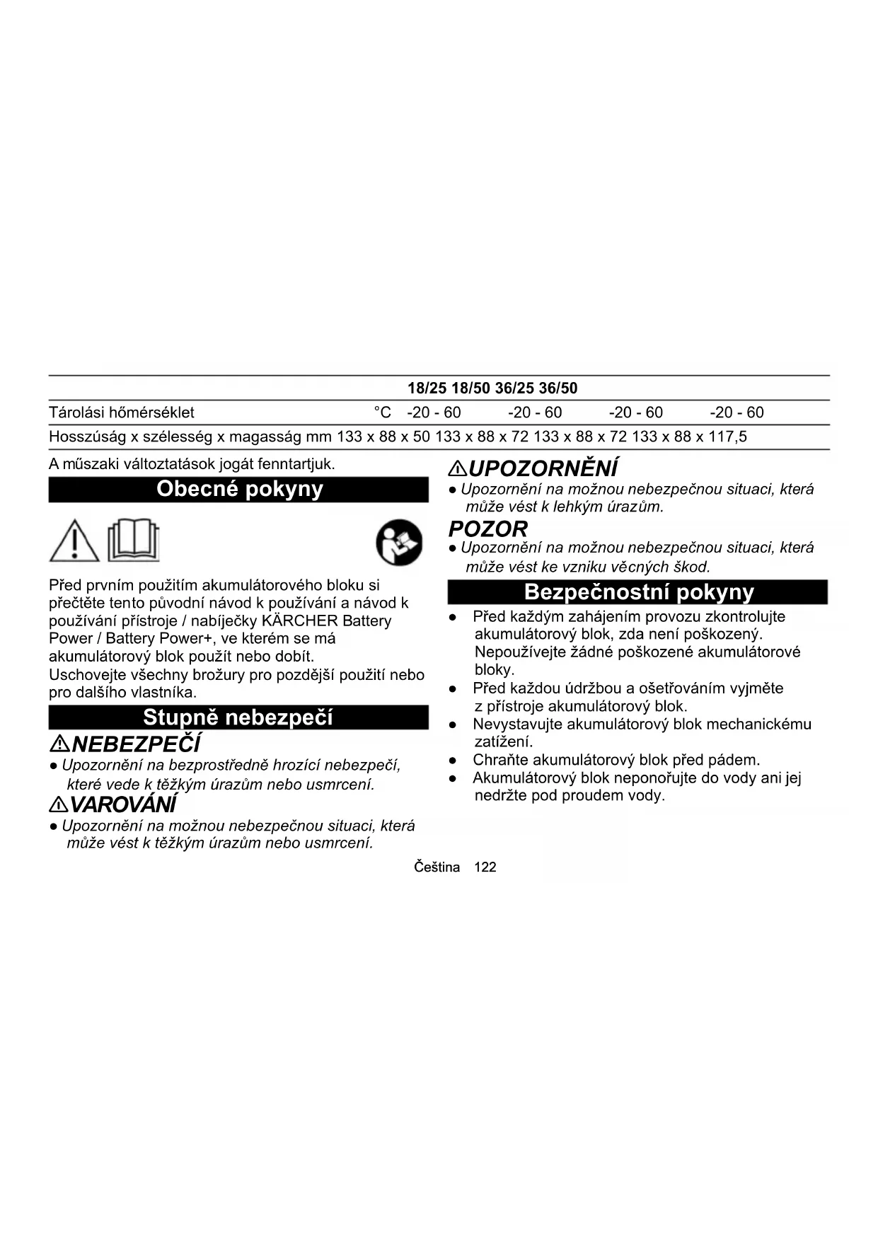 kuegységet. Műszaki adatok 18/25 18/50 36/25 36/50 Elektromos csatlakozás Akkuegység névleges feszültsége V 18 18 36 36 Akkuplattform Battery Po- wer Battery Po- wer Battery Po- wer Battery Power Kompatibilis az akkumulátor platformjával Battery Po- wer + Battery Po- wer + Battery Po- wer + Battery Power + Akkuegység típusa Li-ION Li-ION Li-ION Li-ION Névleges kapacitás (az IEC/EN 61960 szerint) Ah 2,5 5,0 2,5 5,0 Névleges energia Wh 45 90 90 180 Töltőáram max. A 3,5 7,5 3,5 7,5 Méretek és súlyok Súly kg 0,5 0,8 0,9 1,5 Üzemi hőmérséklet °C -20 - 40 -20 - 40 -20 - 40 -20 - 40 Feltöltési hőmérséklet °C 4 - 40 4 - 40 4 - 40 4 - 40Čeština 122 A műszaki változtatások jogát fenntartjuk. Obecné pokyny Před prvním použitím akumulátorového bloku si přečtěte tento původní návod k používání a návod k používání přístroje / nabíječky KÄRCHER Battery Power / Battery Power+, ve kterém se má akumulátorový blok použít nebo dobít. Uschovejte všechny brožury pro pozdější použití nebo pro dalšího vlastníka. Stupně nebezpečí NEBEZPEČÍ ● Upozornění na bezprostředně hrozící nebezpečí, které vede k těžkým úrazům nebo usmrcení. 몇 VAROVÁNÍ ● Upozornění na možnou nebezpečnou situaci, která může vést k těžkým úrazům nebo usmrcení. 몇 UPOZORNĚNÍ ● Upozornění na možnou nebezpečnou situaci, která může vést k lehkým úrazům. POZOR ● Upozornění na možnou nebezpečnou situaci, která může vést ke vzniku věcných škod. Bezpečnostní pokyny ● Před každým zahájením provozu zkontrolujte akumulátorový blok, zda není poškozený. Nepoužívejte žádné poškozené akumulátorové bloky. ● Před každou údržbou a ošetřováním vyjměte z přístroje akumulátorový blok. ● Nevystavujte akumulátorový blok mechanickému zatížení. ● Chraňte akumulátorový blok před pádem. ● Akumulátorový blok neponořujte do vody ani jej nedržte pod proudem vody. Tárolási hőmérséklet °C -20 - 60 -20 - 60 -20 - 60 -20 - 60 Hosszúság x szélesség x magasság mm 133 x 88 x 50 133 x 88 x 72 133 x 88 x 72 133 x 88 x 117,5 18/25 18/50 36/25 36/50123 Čeština ● Nepoužívejte, nenabíjejte nebo neskladujte akumulátorový blok v mokrém nebo znečištěném stavu. ● Pokud se akumulátorový blok namočí, ihned jej osušte. Zajistěte, aby na kontaktech nezůstala žádná vlhkost. ● Akumulátorový blok neskladujte ani nenabíjejte ve vlhkém nebo mokrém prostředí. ● Akumulátorový blok nabíjejte pouze schválenými nabíječkami. ● Nenabíjejte akumulátorový blok bez dozoru. Během nabíjení pravidelně kontrolujte stav akumulátoru a nabíječky. ● Pokud během nabíjení zaznamenáte poruchu, neobvyklý zápach nebo zahřívání, odpojte nabíječku ze sítě a akumulátorový blok od nabíječky. Akumulátorový blok a nabíječku okamžitě zlikvidujte a dodržujte příslušné předpisy pro přepravu a likvidaci odpadu. ● Akumulátorový blok nepoužívejte, nenabíjejte ani neskladujte ve výbušném prostředí nebo v blízkosti hořlavých předmětů. ● Nevhazujte akumulátorové bloky do ohně. ● Chraňte akumulátorový blok před horkem, ostrými hranami, olejem, rozpouštědly, čisticími prostředky a pohyblivými částmi přístroje. ● Nebezpečí zkratu. Chraňte kontakty akumulátorového bloku před kovovými díly a neukládejte je společně s kovovými díly. ● Neotevírejte akumulátorový blok. Opravy svěřujte pouze odbornému personálu. ● Vyvarujte se kontaktu s tekutinou vytékající z vadných akumulátorů. V případě kontaktu tekutinu ihned opláchněte vodou a při kontaktu s očima se navíc poraďte s lékařem. ● Akumulátorový blok po skončení jeho životnosti zlikvidujte v souladu s platnými předpisy. Bezpečnostní pokyny k přepravě Na lithium-iontovou baterii se vztahují požadavky zákona o nebezpečných věcech. Nepoškozený a funkční akumulátorový blok může uživatel přepravovat v oblastech veřejného přepravy bez dalších požadavků. Při přepravě třetími stranami (přepravní společností) dbejte na zvláštní požadavky na obal a označování. Akumulátorový blok zasílejte pouze v případě, že není poškozený kryt. Odkryté kontakty zalepte. Akumulátorový blok pevně a bezpečně zabalte. Akumulátorový blok se nesmí v obalu pohybovat.Čeština 124 NEBEZPEČÍ ● Vadný nebo nefunkční akumulátorový blok nesmí být zaslán a musí být zlikvidován na místě v souladu s platnými předpisy. Dodržujte místní národní předpisy. Použití v souladu s určením 몇 UPOZORNĚNÍ Nebezpečí výbuchu! Zranění a škody v důsledku explodujícího akumulátorového bloku. Nabíjejte, používejte a skladujte pouze nepoškozené a plně funkční akumulátorové bloky . Přestavby a změny bez autorizace výrobce jsou zakázány. Jakékoliv jiné použití je nepřípustné. Za ohrožení nastalá v důsledku nepřípustného použití nese odpovědnost sám uživatel. Akumulátorový blok nabíjejte a používejte pouze s přístroji KÄRCHER 18 V / 36 V Battery Power / Battery Power + Systems. POZOR Akumulátorové bloky lze používat pouze s přístroji stejného typu napětí (18 V nebo 36 V)! Akumulátorové bloky nepoužívejte ani nenabíjejte s přístroji s jiným typem napětí. Před použitím zkontrolujte, zda se typ napětí (18 V /36