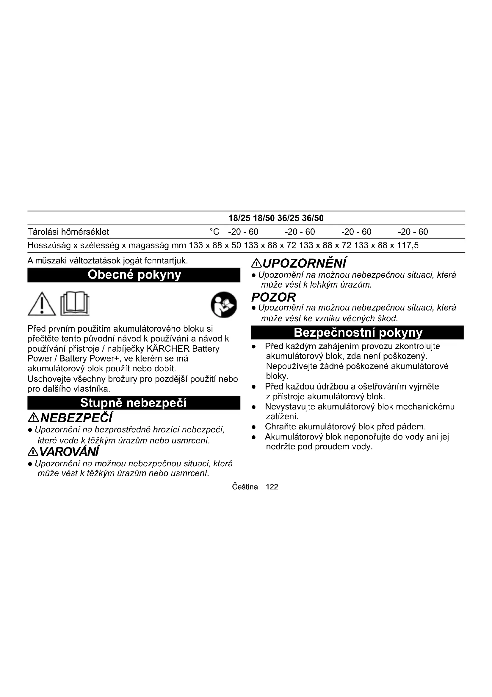 kuegységet. Műszaki adatok 18/25 18/50 36/25 36/50 Elektromos csatlakozás Akkuegység névleges feszültsége V 18 18 36 36 Akkuplattform Battery Po- wer Battery Po- wer Battery Po- wer Battery Power Kompatibilis az akkumulátor platformjával Battery Po- wer + Battery Po- wer + Battery Po- wer + Battery Power + Akkuegység típusa Li-ION Li-ION Li-ION Li-ION Névleges kapacitás (az IEC/EN 61960 szerint) Ah 2,5 5,0 2,5 5,0 Névleges energia Wh 45 90 90 180 Töltőáram max. A 3,5 7,5 3,5 7,5 Méretek és súlyok Súly kg 0,5 0,8 0,9 1,5 Üzemi hőmérséklet °C -20 - 40 -20 - 40 -20 - 40 -20 - 40 Feltöltési hőmérséklet °C 4 - 40 4 - 40 4 - 40 4 - 40Čeština 122 A műszaki változtatások jogát fenntartjuk. Obecné pokyny Před prvním použitím akumulátorového bloku si přečtěte tento původní návod k používání a návod k používání přístroje / nabíječky KÄRCHER Battery Power / Battery Power+, ve kterém se má akumulátorový blok použít nebo dobít. Uschovejte všechny brožury pro pozdější použití nebo pro dalšího vlastníka. Stupně nebezpečí NEBEZPEČÍ ● Upozornění na bezprostředně hrozící nebezpečí, které vede k těžkým úrazům nebo usmrcení. 몇 VAROVÁNÍ ● Upozornění na možnou nebezpečnou situaci, která může vést k těžkým úrazům nebo usmrcení. 몇 UPOZORNĚNÍ ● Upozornění na možnou nebezpečnou situaci, která může vést k lehkým úrazům. POZOR ● Upozornění na možnou nebezpečnou situaci, která může vést ke vzniku věcných škod. Bezpečnostní pokyny ● Před každým zahájením provozu zkontrolujte akumulátorový blok, zda není poškozený. Nepoužívejte žádné poškozené akumulátorové bloky. ● Před každou údržbou a ošetřováním vyjměte z přístroje akumulátorový blok. ● Nevystavujte akumulátorový blok mechanickému zatížení. ● Chraňte akumulátorový blok před pádem. ● Akumulátorový blok neponořujte do vody ani jej nedržte pod proudem vody. Tárolási hőmérséklet °C -20 - 60 -20 - 60 -20 - 60 -20 - 60 Hosszúság x szélesség x magasság mm 133 x 88 x 50 133 x 88 x 72 133 x 88 x 72 133 x 88 x 117,5 18/25 18/50 36/25 36/50123 Čeština ● Nepoužívejte, nenabíjejte nebo neskladujte akumulátorový blok v mokrém nebo znečištěném stavu. ● Pokud se akumulátorový blok namočí, ihned jej osušte. Zajistěte, aby na kontaktech nezůstala žádná vlhkost. ● Akumulátorový blok neskladujte ani nenabíjejte ve vlhkém nebo mokrém prostředí. ● Akumulátorový blok nabíjejte pouze schválenými nabíječkami. ● Nenabíjejte akumulátorový blok bez dozoru. Během nabíjení pravidelně kontrolujte stav akumulátoru a nabíječky. ● Pokud během nabíjení zaznamenáte poruchu, neobvyklý zápach nebo zahřívání, odpojte nabíječku ze sítě a akumulátorový blok od nabíječky. Akumulátorový blok a nabíječku okamžitě zlikvidujte a dodržujte příslušné předpisy pro přepravu a likvidaci odpadu. ● Akumulátorový blok nepoužívejte, nenabíjejte ani neskladujte ve výbušném prostředí nebo v blízkosti hořlavých předmětů. ● Nevhazujte akumulátorové bloky do ohně. ● Chraňte akumulátorový blok před horkem, ostrými hranami, olejem, rozpouštědly, čisticími prostředky a pohyblivými částmi přístroje. ● Nebezpečí zkratu. Chraňte kontakty akumulátorového bloku před kovovými díly a neukládejte je společně s kovovými díly. ● Neotevírejte akumulátorový blok. Opravy svěřujte pouze odbornému personálu. ● Vyvarujte se kontaktu s tekutinou vytékající z vadných akumulátorů. V případě kontaktu tekutinu ihned opláchněte vodou a při kontaktu s očima se navíc poraďte s lékařem. ● Akumulátorový blok po skončení jeho životnosti zlikvidujte v souladu s platnými předpisy. Bezpečnostní pokyny k přepravě Na lithium-iontovou baterii se vztahují požadavky zákona o nebezpečných věcech. Nepoškozený a funkční akumulátorový blok může uživatel přepravovat v oblastech veřejného přepravy bez dalších požadavků. Při přepravě třetími stranami (přepravní společností) dbejte na zvláštní požadavky na obal a označování. Akumulátorový blok zasílejte pouze v případě, že není poškozený kryt. Odkryté kontakty zalepte. Akumulátorový blok pevně a bezpečně zabalte. Akumulátorový blok se nesmí v obalu pohybovat.Čeština 124 NEBEZPEČÍ ● Vadný nebo nefunkční akumulátorový blok nesmí být zaslán a musí být zlikvidován na místě v souladu s platnými předpisy. Dodržujte místní národní předpisy. Použití v souladu s určením 몇 UPOZORNĚNÍ Nebezpečí výbuchu! Zranění a škody v důsledku explodujícího akumulátorového bloku. Nabíjejte, používejte a skladujte pouze nepoškozené a plně funkční akumulátorové bloky . Přestavby a změny bez autorizace výrobce jsou zakázány. Jakékoliv jiné použití je nepřípustné. Za ohrožení nastalá v důsledku nepřípustného použití nese odpovědnost sám uživatel. Akumulátorový blok nabíjejte a používejte pouze s přístroji KÄRCHER 18 V / 36 V Battery Power / Battery Power + Systems. POZOR Akumulátorové bloky lze používat pouze s přístroji stejného typu napětí (18 V nebo 36 V)! Akumulátorové bloky nepoužívejte ani nenabíjejte s přístroji s jiným typem napětí. Před použitím zkontrolujte, zda se typ napětí (18 V /36