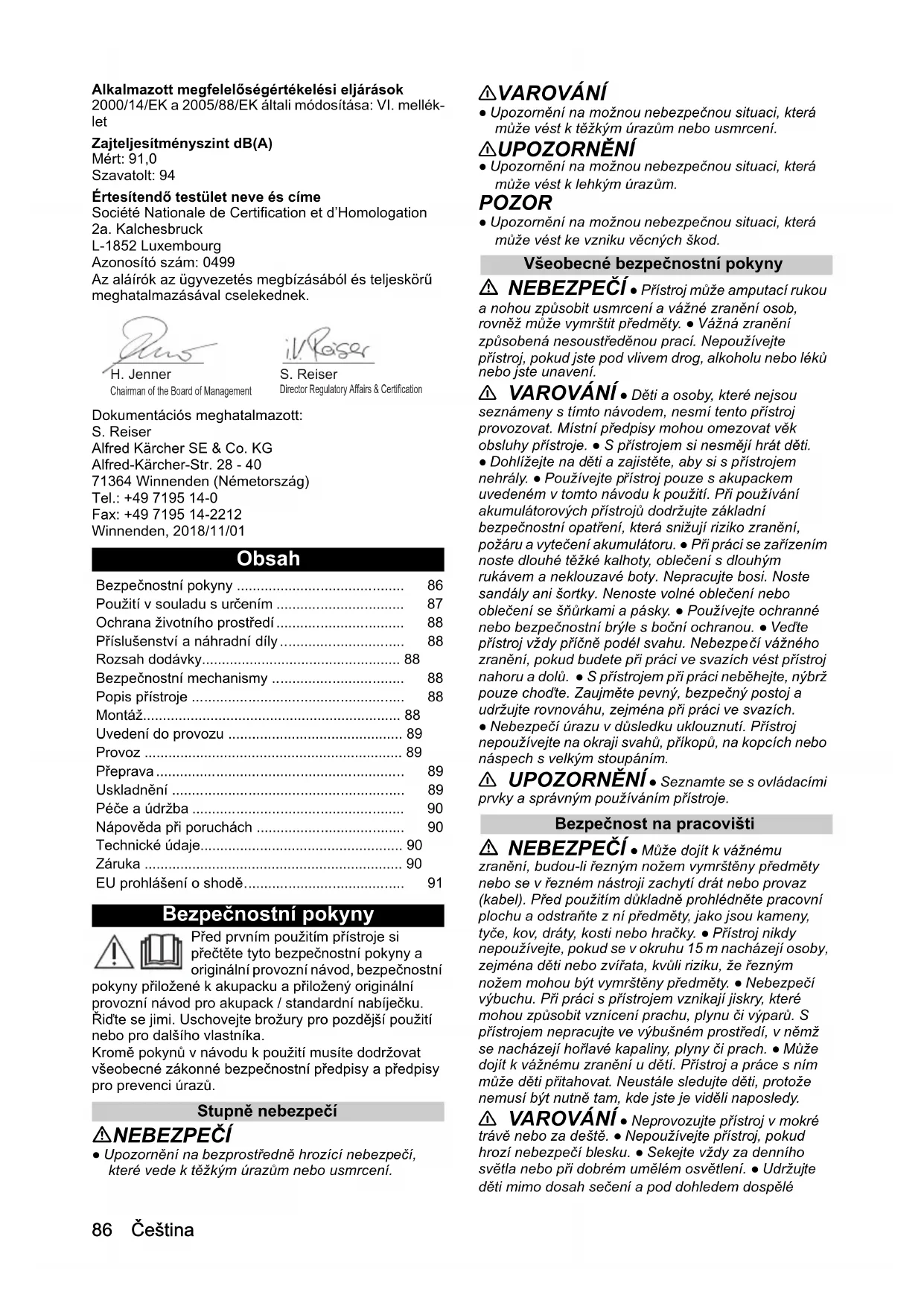 - Tömeg (akkuegység nélkül) kg 13,486 Čeština Alkalmazott megfelelőségértékelési eljárások 2000/14/EK a 2005/88/EK általi módosítása: VI. mellék- let Zajteljesítményszint dB(A) Mért: 91,0 Szavatolt: 94 Értesítendő testület neve és címe Société Nationale de Certification et d’Homologation 2a. Kalchesbruck L-1852 Luxembourg Azonosító szám: 0499 Az aláírók az ügyvezetés megbízásából és teljeskörű meghatalmazásával cselekednek. Dokumentációs meghatalmazott: S. Reiser Alfred Kärcher SE & Co. KG Alfred-Kärcher-Str. 28 - 40 71364 Winnenden (Németország) Tel.: +49 7195 14-0 Fax: +49 7195 14-2212 Winnenden, 2018/11/01 Obsah Bezpečnostní pokyny Před prvním použitím přístroje si přečtěte tyto bezpečnostní pokyny a originální provozní návod, bezpečnostní pokyny přiložené k akupacku a přiložený originální provozní návod pro akupack / standardní nabíječku. Řiďte se jimi. Uschovejte brožury pro pozdější použití nebo pro dalšího vlastníka. Kromě pokynů v návodu k použití musíte dodržovat všeobecné zákonné bezpečnostní předpisy a předpisy pro prevenci úrazů. Stupně nebezpečí NEBEZPEČÍ ● Upozornění na bezprostředně hrozící nebezpečí, které vede k těžkým úrazům nebo usmrcení. 몇 VAROVÁNÍ ● Upozornění na možnou nebezpečnou situaci, která může vést k těžkým úrazům nebo usmrcení. 몇 UPOZORNĚNÍ ● Upozornění na možnou nebezpečnou situaci, která může vést k lehkým úrazům. POZOR ● Upozornění na možnou nebezpečnou situaci, která může vést ke vzniku věcných škod. Všeobecné bezpečnostní pokyny NEBEZPEČÍ ● Přístroj může amputací rukou a nohou způsobit usmrcení a vážné zranění osob, rovněž může vymrštit předměty. ● Vážná zranění způsobená nesoustředěnou prací. Nepoužívejte přístroj, pokud jste pod vlivem drog, alkoholu nebo léků nebo jste unavení. 몇 VAROVÁNÍ ● Děti a osoby, které nejsou seznámeny s tímto návodem, nesmí tento přístroj provozovat. Místní předpisy mohou omezovat věk obsluhy přístroje. ● S přístrojem si nesmějí hrát děti. ● Dohlížejte na děti a zajistěte, aby si s přístrojem nehrály. ● Používejte přístroj pouze s akupackem uvedeném v tomto návodu k použití. Při používání akumulátorových přístrojů dodržujte základní bezpečnostní opatření, která snižují riziko zranění, požáru a vytečení akumulátoru. ● Při práci se zařízením noste dlouhé těžké kalhoty, oblečení s dlouhým rukávem a neklouzavé boty. Nepracujte bosi. Noste sandály ani šortky. Nenoste volné oblečení nebo oblečení se šňůrkami a pásky. ● Používejte ochranné nebo bezpečnostní brýle s boční ochranou. ● Veďte přístroj vždy příčně podél svahu. Nebezpe čí vážného zranění, pokud budete při práci ve svazích vést přístroj nahoru a dolů. ● S přístrojem při práci neběhejte, nýbrž pouze choďte. Zaujměte pevný, bezpečný postoj a udržujte rovnováhu, zejména při práci ve svazích. ● Nebezpečí úrazu v důsledku uklouznutí. Přístroj nepoužívejte na okraji svahů, příkopů, na kopcích nebo náspech s velkým stoupáním. 몇 UPOZORNĚNÍ ● Seznamte se s ovládacími prvky a správným používáním přístroje. Bezpečnost na pracovišti NEBEZPEČÍ ● Může dojít k vážnému zranění, budou-li řezným nožem vymrštěny předměty nebo se v řezném nástroji zachytí drát nebo provaz (kabel). Před použitím důkladně prohlédněte pracovní plochu a odstraňte z ní předměty, jako jsou kameny, tyče, kov, dráty, kosti nebo hračky. ● Přístroj nikdy nepoužívejte, pokud se v okruhu 15 m nacházejí osoby, zejména děti nebo zvířata, kvůli riziku, že řezným nožem mohou být vymrštěny předměty. ● Nebezpečí výbuchu. Při práci s přístrojem vznikají jiskry, které mohou způsobit vznícení prachu, plynu či výparů. S přístrojem nepracujte ve výbušném prostředí, v němž se nacházejí hořlavé kapaliny, plyny či prach. ● Může dojít k vážnému zranění u dě tí. Přístroj a práce s ním může děti přitahovat. Neustále sledujte děti, protože nemusí být nutně tam, kde jste je viděli naposledy. 몇 VAROVÁNÍ ● Neprovozujte přístroj v mokré trávě nebo za deště. ● Nepoužívejte přístroj, pokud hrozí nebezpečí blesku. ● Sekejte vždy za denního světla nebo při dobrém umělém osvětlení. ● Udržujte děti mimo dosah sečení a pod dohledem dospělé Bezpečnostní pokyny p. 86