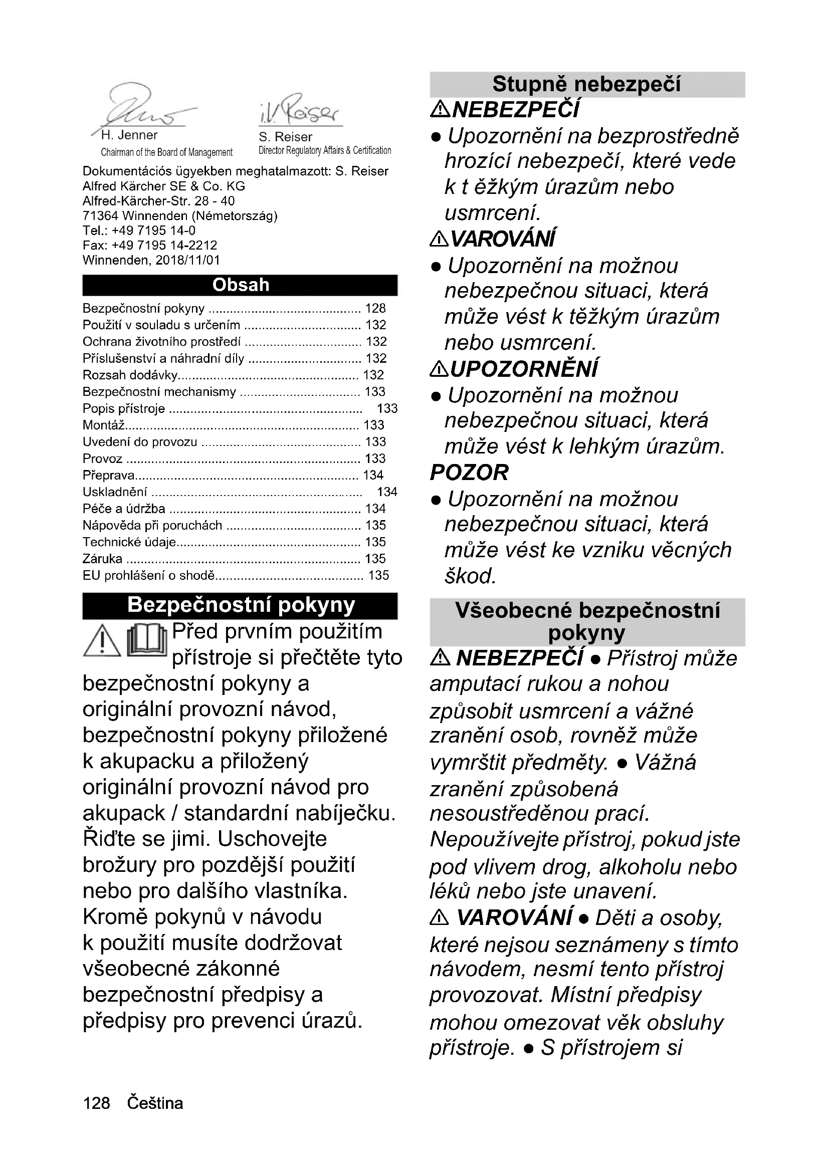 - Tömeg (akkuegység nélkül) kg 13,4128 Čeština Dokumentációs ügyekben meghatalmazott: S. Reiser Alfred Kärcher SE & Co. KG Alfred-Kärcher-Str. 28 - 40 71364 Winnenden (Németország) Tel.: +49 7195 14-0 Fax: +49 7195 14-2212 Winnenden, 2018/11/01 Obsah Bezpečnostní pokyny Před prvním použitím přístroje si přečtěte tyto bezpečnostní pokyny a originální provozní návod, bezpečnostní pokyny přiložené k akupacku a přiložený originální provozní návod pro akupack / standardní nabíječku. Řiďte se jimi. Uschovejte brožury pro pozdější použití nebo pro dalšího vlastníka. Kromě pokynů v návodu k použití musíte dodržovat všeobecné zákonné bezpečnostní předpisy a předpisy pro prevenci úrazů. Stupně nebezpečí NEBEZPEČÍ ● Upozornění na bezprostředně hrozící nebezpečí, které vede ktěžkým úrazům nebo usmrcení. 몇 VAROVÁNÍ ● Upozornění na možnou nebezpečnou situaci, která může vést k těžkým úrazům nebo usmrcení. 몇 UPOZORNĚNÍ ● Upozornění na možnou nebezpečnou situaci, která může vést k lehkým úrazům. POZOR ● Upozornění na možnou nebezpečnou situaci, která může vést ke vzniku věcných škod. Všeobecné bezpečnostní pokyny NEBEZPEČÍ ● Přístroj může amputací rukou a nohou způsobit usmrcení a vážné zranění osob, rovněž může vymrštit předměty. ● Vážná zraně ní způsobená nesoustředěnou prací. Nepoužívejte přístroj, pokud jste pod vlivem drog, alkoholu nebo léků nebo jste unavení. 몇 VAROVÁNÍ ● Děti a osoby, které nejsou seznámeny s tímto návodem, nesmí tento přístroj provozovat. Místní předpisy mohou omezovat věk obsluhy přístroje. ● S přístrojem si Bezpečnostní pokyny p. 128