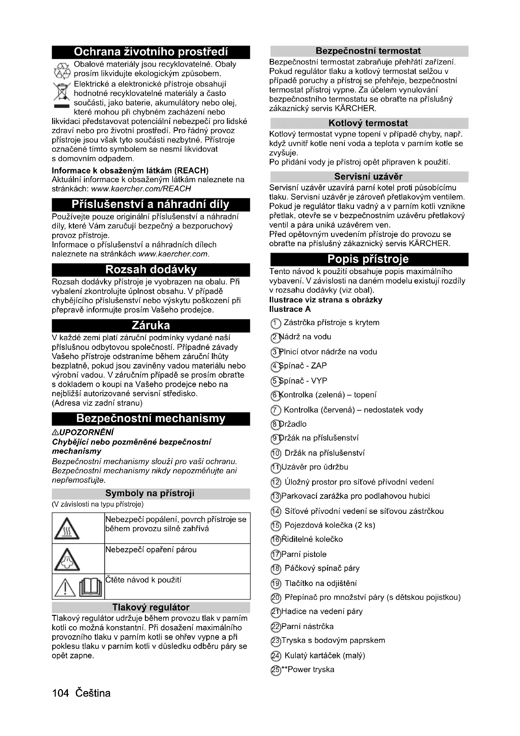 - Technické údaje 04 Čeština Ochrana životního prostředí Obalové materiály jsou recyklovatelné. Obaly prosím likvidujte ekologickým způsobem. Elektrické a elektronické přístroje obsahují hodnotné recyklovatelné materiály a často součásti, jako baterie, akumulátory nebo olej, které mohou při chybném zacházení nebo likvidaci představovat potenciální nebezpečí pro lidské zdraví nebo pro životní prostředí. Pro řádný provoz přístroje jsou však tyto součásti nezbytné. Přístroje označené tímto symbolem se nesmí likvidovat s domovním odpadem. Informace k obsaženým látkám (REACH) Aktuální informace k obsaženým látkám naleznete na stránkách: www.kaercher.com/REACH Příslušenství a náhradní díly Používejte pouze originální příslušenství a náhradní díly, které Vám zaručují bezpečný a bezporuchový provoz přístroje. Informace o příslušenství a náhradních dílech naleznete na stránkách www.kaercher.com. Rozsah dodávky Rozsah dodávky přístroje je vyobrazen na obalu. Při vybalení zkontrolujte úplnost obsahu. V případě chybějícího příslušenství nebo výskytu poškození při přepravě informujte prosím Vašeho prodejce. Záruka V každé zemi platí záruční podmínky vydané naší příslušnou odbytovou společností. Případné závady Vašeho přístroje odstraníme během záruční lhůty bezplatně, pokud jsou zaviněny vadou materiálu nebo výrobní vadou. V záručním případě se prosím obraťte s dokladem o koupi na Vašeho prodejce nebo na nejbližší autorizované servisní středisko. (Adresa viz zadní stranu) Bezpečnostní mechanismy 몇 UPOZORNĚNÍ Chybějící nebo pozměněné bezpečnostní mechanismy Bezpečnostní mechanismy slouží pro vaši ochranu. Bezpečnostní mechanismy nikdy nepozměňujte ani nepřemosťujte. Symboly na přístroji (V závislosti na typu přístroje) Tlakový regulátor Tlakový regulátor udržuje během provozu tlak v parním kotli co možná konstantní. Při dosažení maximálního provozního tlaku v parním kotli se ohřev vypne a při poklesu tlaku v parním kotli v důsledku odběru páry se opět zapne. Bezpečnostní termostat Bezpečnostní termostat zabraňuje přehřátí zařízení. Pokud regulátor tlaku a kotlový termostat selžou v případě poruchy a přístroj se přehřeje, bezpečnostní termostat přístroj vypne. Za účelem vynulování bezpečnostního termostatu se obraťte na příslušný zákaznický servis KÄRCHER. Kotlový termostat Kotlový termostat vypne topení v případě chyby, např. když uvnitř kotle není voda a teplota v parním kotle se zvyšuje. Po přidání vody je přístroj opět připraven k použití. Servisní uzávěr Servisní uzávěr uzavírá parní kotel proti působícímu tlaku. Servisní uzávěr je zároveň přetlakovým ventilem. Pokud je regulátor tlaku vadný a v parním kotli vznikne přetlak, otevře se v bezpečnostním uzávěru přetlakový ventil a pára uniká uzávěrem ven. Před opětovným uvedením přístroje do provozu se obraťte na příslušný zákaznický servis KÄRCHER. Popis přístroje Tento návod k použití obsahuje popis maximálního vybavení. V závislosti na daném modelu existují rozdíly v rozsahu dodávky (viz obal). Ilustrace viz strana s obrázky Ilustrace A 1 Zástrčka přístroje s krytem 2 Nádrž na vodu 3 Plnicí otvor nádrže na vodu 4 Spínač - ZAP 5 Spínač - VYP 6 Kontrolka (zelená) – topení 7 Kontrolka (červená) – nedostatek vody 8 Držadlo 9 Držák na příslušenství 10 Držák na příslušenství 11 Uzávěr pro údržbu 12 Úložný prostor pro síťové přívodní vedení 13 Parkovací zarážka pro podlahovou hubici 14 Síťové přívodní vedení se síťovou zástrčkou 15 Pojezdová kolečka (2 ks) 16 Řiditelné kolečko 17 Parní pistole 18 Páčkový spínač páry 19 Tlačítko na odjištění 20 Přepínač pro množství páry (s dětskou pojistkou) 21 Hadice na vedení páry 22 Parní nástrčka 23 Tryska s bodovým paprskem 24 Kulatý kartáček (malý) 25 **Power tryska Nebezpečí popálení, povrch přístroje se během provozu silně zahřívá Nebezpečí opaření párou Čtěte návod k použitíČeština 105 26 **Kulatý kartáček (velký) 27 Ruční hubice 28 Potah ruční hubice z mikrovlákna 29 Prodlužovací trubka (2 ks) 30 Tlačítko na odjištění 31 Podlahová hubice 32 Suchý zip 33 Pad z mikrovlákna na podlahu (1 ks) 34 **Pad z mikrovlákna (2 ks) 35 **Kobercový nástavec 36 Odvápňovací prostředek 37 Napařovací žehlička 38 Kontrolka (oranžová) – topení 39 Spínač páry (dole) 40 Parní nástrčka ** dodatečná výbava Montáž Montáž příslušenství p. 1091