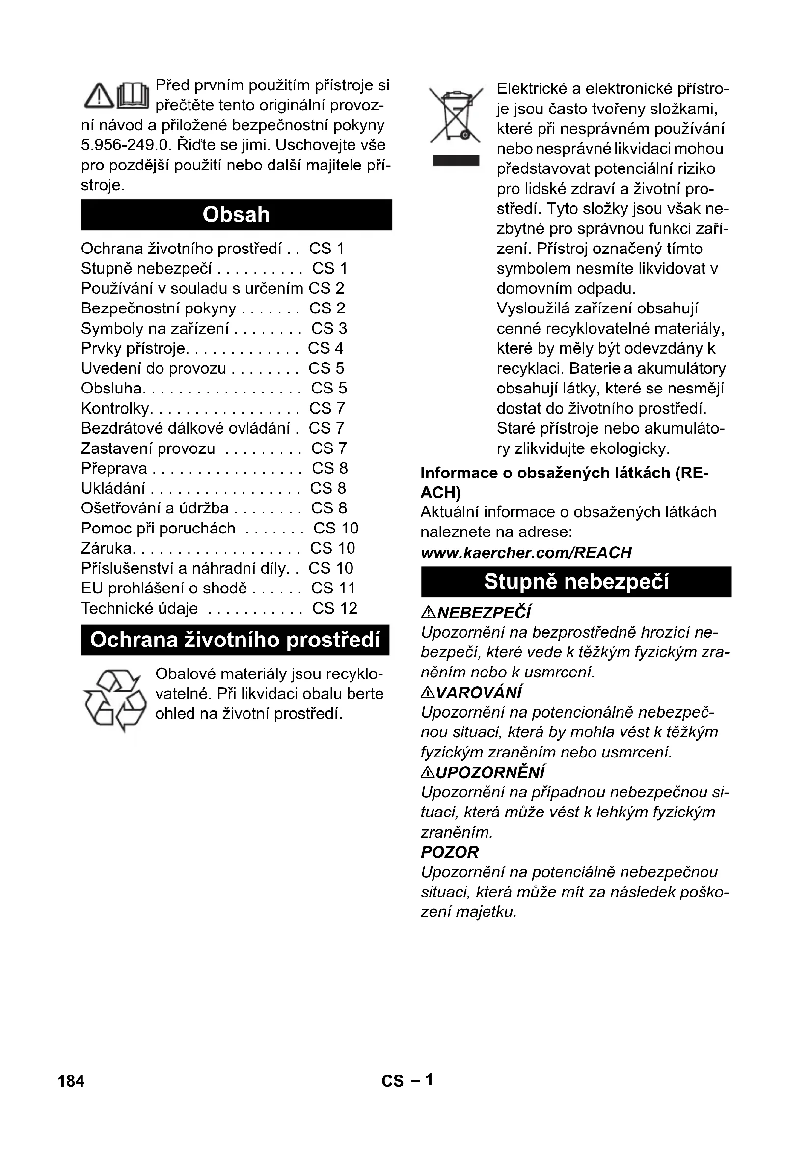 183HU– 1 Před prvním použitím přístroje si přečtěte tento originální provoz- ní návod a přiložené bezpečnostní pokyny 5.956-249.0. Řiďte se jimi. Uschovejte vše pro pozdější použití nebo další majitele pří- stroje. Informace o obsažených látkách (RE- ACH) Aktuální informace o obsažených látkách naleznete na adrese: www.kaercher.com/REACH NEBEZPEČÍ Upozornění na bezprostředně hrozící ne- bezpečí, které vede k těžkým fyzickým zra- něním nebo k usmrcení. 몇 VAROVÁNÍ Upozornění na potencionálně nebezpeč- nou situaci, která by mohla vést k těžkým fyzickým zraněním nebo usmrcení. 몇 UPOZORNĚNÍ Upozornění na případnou nebezpečnou si- tuaci, která může vést k lehkým fyzickým zraněním. POZOR Upozornění na potenciálně nebezpečnou situaci, která může mít za následek poško- zení majetku. Obsah Ochrana životního prostředí . . CS 1 Stupně nebezpečí . . . . . . . . . . CS 1 Používání v souladu s určením CS 2 Bezpečnostní pokyny . . . . . . . CS 2 Symboly na zařízení . . . . . . . . CS 3 Prvky přístroje. . . . . . . . . . . . . CS 4 Uvedení do provozu . . . . . . . . CS 5 Obsluha. . . . . . . . . . . . . . . . . . CS 5 Kontrolky. . . . . . . . . . . . . . . . . CS 7 Bezdrátové dálkové ovládání . CS 7 Zastavení provozu . . . . . . . . . CS 7 Přeprava . . . . . . . . . . . . . . . . . CS 8 Ukládání . . . . . . . . . . . . . . . . . CS 8 Ošetřování a údržba . . . . . . . . CS 8 Pomoc při poruchách . . . . . . . CS 10 Záruka. . . . . . . . . . . . . . . . . . . CS 10 Příslušenství a náhradní díly. . CS 10 EU prohlášení o shodě . . . . . . CS 11 Technické údaje . . . . . . . . . . . CS 12 Ochrana životního prostředí Obalové materiály jsou recyklo- vatelné. Při likvidaci obalu berte ohled na životní prostředí. Elektrické a elektronické přístro- je jsou často tvořeny složkami, které při nesprávném používání nebo nesprávné likvidaci mohou představovat potenciální riziko pro lidské zdraví a životní pro- středí. Tyto složky jsou však ne- zbytné pro správnou funkci zaří- zení. Přístroj označený tímto symbolem nesmíte likvidovat v domovním odpadu. Vysloužilá zařízení obsahují cenné recyklovatelné materiály, které by měly být odevzdány k recyklaci. Baterie a akumulátory obsahují látky, které se nesmějí dostat do životního prostředí. Staré přístroje nebo akumuláto- ry zlikvidujte ekologicky. Stupně nebezpečí 184 CS– 2 – Tento vysavač je vhodný pro suché a mokré čištění podlah a stěn. – Tento přístroj je určen k odsávání su- chého, nehořlavého prachu ze strojů. – Přístroj je určen pro vysávání vlhkých nebo tekutých látek. – Zařízení je vhodné k odsávání suché- ho, nehořlavého, zdraví škodlivého pra- chu prachová třídy M podle EN 60 335- 2-69. Omezení: Nesmějí se odsávat ra- kovinotvorné látky. – Tento přístroj je vhodný k průmyslové- mu použití. – Příslušenství není součástí dodávky. Příslušenství je třeba podle druhu pou- žití objednávat zvlášť. – Bezvadnou funkčnost přístroje zaručují pouze jmenovité šířky sací hadice DN42, DN52 a DN 72. Přístroj IV 100/40 M se smí používat pouze s příslušenstvím DN 42 a DN 52. – Každé jiné použití je považováno za ne- odborné použití. Před prvním uvedením do provozu si bez- podmínečně přečtěte přiložené bezpeč- nostní pokyny k mokrému/ suchému vysa- vači. NEBEZPEČÍ – Je-li odfuk ze zařízení vyveden zpět do místnosti, musí být v místnosti zajištěna dostatečně rychlá výměna vzduchu V. Aby byly dodrženy požadované limitní hodnoty, může objemový průtok přivá- děný zpět představovat nanejvýše 50% z celkového objemového průtoku čers- tvého vzduchu (objem místnosti O