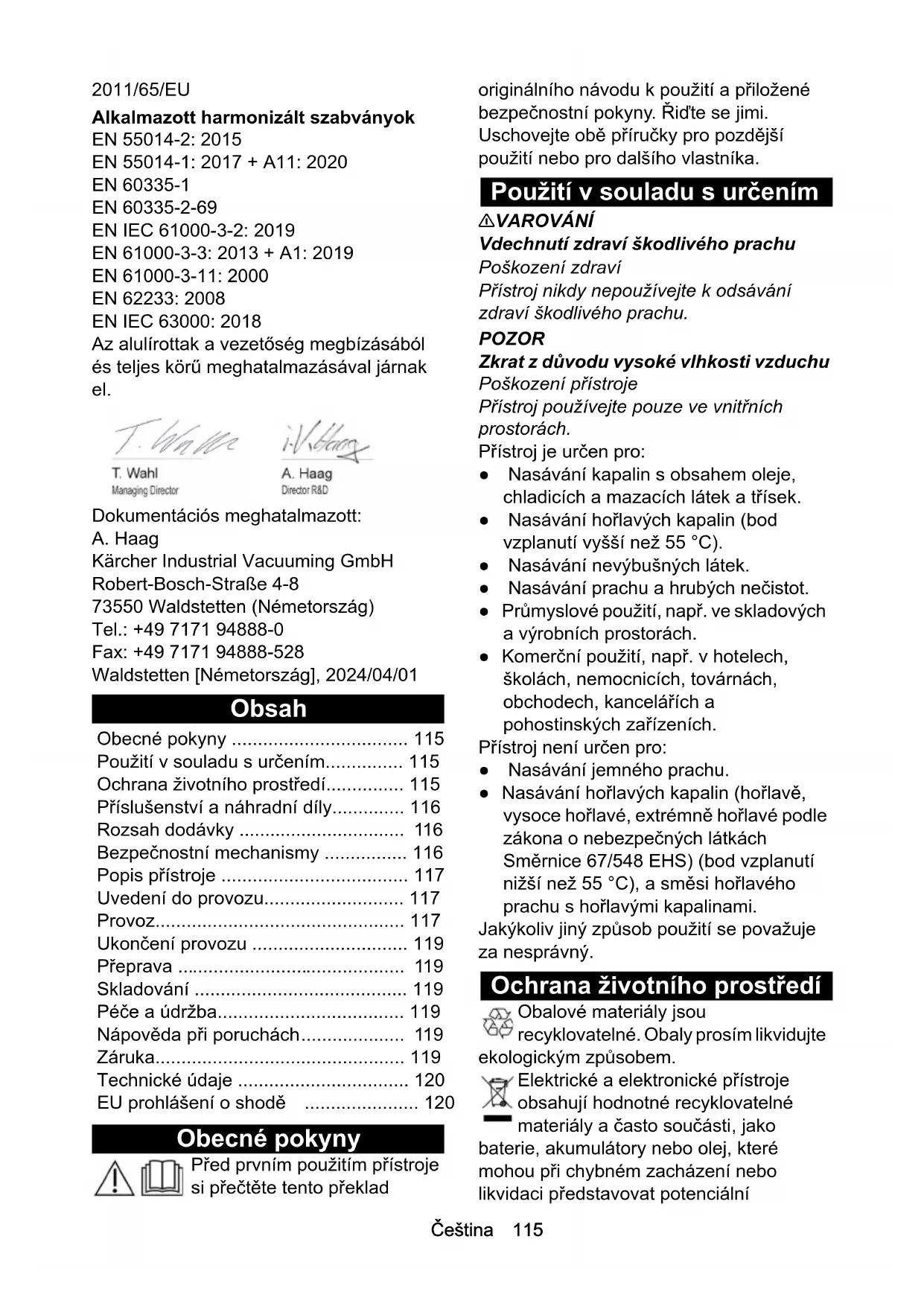 - EN 61000-3-3: 2013 + A1: 2019 EN 61000-3-11: 2000 EN 62233: 2008 EN IEC 63000: 2018 Az alulírottak a vezetőség megbízásából és teljes körű meghatalmazásával járnak el. Dokumentációs meghatalmazott: A. Haag Kärcher Industrial Vacuuming GmbH Robert-Bosch-Straße 4-8 73550 Waldstetten (Németország) Tel.: +49 7171 94888-0 Fax: +49 7171 94888-528 Waldstetten [Németország], 2024/04/01 Obsah Obecné pokyny Před prvním použitím přístroje si přečtěte tento překlad originálního návodu k použití a přiložené bezpečnostní pokyny. Řiďte se jimi. Uschovejte obě příručky pro pozdější použití nebo pro dalšího vlastníka. Použití v souladu s určením 몇 VAROVÁNÍ Vdechnutí zdraví škodlivého prachu Poškození zdraví Přístroj nikdy nepoužívejte k odsávání zdraví škodlivého prachu. POZOR Zkrat z důvodu vysoké vlhkosti vzduchu Poškození přístroje Přístroj používejte pouze ve vnitřních prostorách. Přístroj je určen pro: ● Nasávání kapalin s obsahem oleje, chladicích a mazacích látek a třísek. ● Nasávání hořlavých kapalin (bod vzplanutí vyšší než 55 °C). ● Nasávání nevýbušných látek. ● Nasávání prachu a hrubých nečistot. ● Průmyslové použití, např. ve skladových a výrobních prostorách. ● Komerční použití, např. v hotelech, školách, nemocnicích, továrnách, obchodech, kancelářích a pohostinských zařízeních. Přístroj není určen pro: ● Nasávání jemného prachu. ● Nasávání hořlavých kapalin (hořlavě, vysoce hořlavé, extrémně hořlavé podle zákona o nebezpečných látkách Směrnice 67/548 EHS) (bod vzplanutí nižší než 55 °C), a směsi hořlavého prachu s hořlavými kapalinami. Jakýkoliv jiný způsob použití se považuje za nesprávný. Ochrana životního prostředí Obalové materiály jsou recyklovatelné. Obaly prosím likvidujte ekologickým způsobem. Elektrické a elektronické přístroje obsahují hodnotné recyklovatelné materiály a často součásti, jako baterie, akumulátory nebo olej, které mohou při chybném zacházení nebo likvidaci představovat potenciální Obecné pokyny p. 115