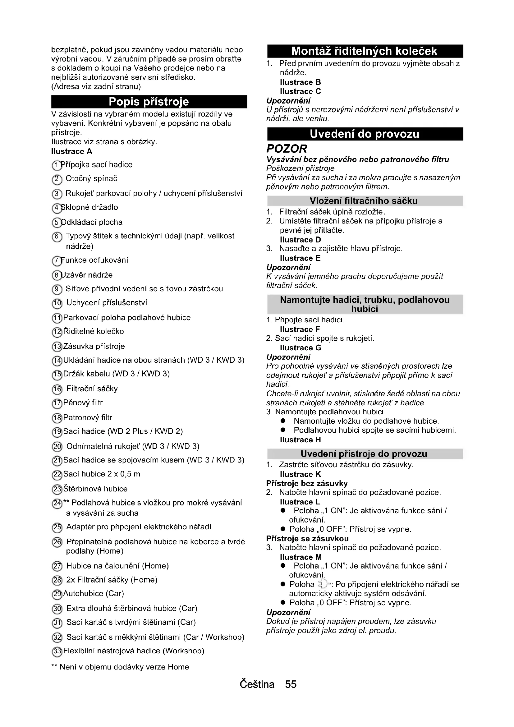 Ábra T Segítség üzemzavarok esetén Az üzemzavarok gyakran egyszerű okokra vezethetők vissza, amelyeket az alábbi áttekintés segítségével a kezelő maga is könnyen elháríthat. Kétség esetén vagy az itt meg nem nevezett üzemzavarok esetén, kérjük, forduljon a hivatalos ügyfélszolgálathoz. Csökkenő szívóteljesítmény A tartozékok, a szívótömlő vagy a szívócsövek eldugul- tak. Távolítsa el a dugulást megfelelő segédeszközzel. A porzsák tele van. Cserélje ki a porzsákot. A habosított anyag szűrő/patronszűrő szennyezett. Tisztítsa meg a habosított anyag szűrőt / patronszű- rőt (lásd a(z) A habosított anyag szűrő / patronszűrő tisztítása fejezetet). A habosított anyag szűrő / patronszűrő sérült. Cserélje ki a habosított anyag szűrőt / patronszűrőt. Műszaki adatok Megjegyzés A műszaki adatok a típustáblán találhatók. Obecné pokyny Před prvním použitím přístroje si přečtěte tento překlad originálního návodu k použití a přiložené bezpečnostní pokyny. Řiďte se jimi. Uschovejte obě příručky pro pozdější použití nebo pro dalšího vlastníka. Použití v souladu s určením Přístroj používejte výhradně pro soukromé domácí použití. Ten to přístroj je na základě popisů a bezpečnostních pokynů uvedených v tomto návodu k použití a bezpečnostních pokynech určen k použití jako vysavač pro vysávání mokrých nečistot a vysávání za sucha. Studený popel lze vysávat pouze pomocí vhodného příslušenství. Chraňte přístroj před deštěm a neskladujte jej ve venkovních prostorách. Upozornění Výrobce neručí za případné škody, které jsou zapříčiněny nesprávným použitím nebo chybnou obsluhou. Ochrana životního prostředí Obalové materiály jsou recyklovatelné. Obaly prosím likvidujte ekologickým způsobem. Elektrické a elektronické přístroje obsahují hodnotné recyklovatelné materiály a často součásti, jako baterie, akumulátory nebo olej, které mohou při chybném zacházení nebo likvidaci představovat potenciální nebezpečí pro lidské zdraví nebo pro životní prostředí. Pro řádný provoz přístroje jsou však tyto součásti nezbytné. Přístroje označené tímto symbolem se nesmí likvidovat s domovním odpadem. Informace k obsaženým látkám (REACH) Aktuální informace k obsaženým látkám naleznete na stránkách: www.kaercher.com/REACH Příslušenství a náhradní díly Používejte pouze originální příslušenství a náhradní díly, které Vám zaručují bezpečný a bezporuchový provoz přístroje. Informace o příslušenství a náhradních dílech naleznete na stránkách www.kaercher.com. Rozsah dodávky Rozsah dodávky přístroje je vyobrazen na obalu. Při vybalení zkontrolujte úplnost obsahu. V případě chybějícího příslušenství nebo výskytu poškození při přepravě informujte prosím Vašeho prodejce. Záruka V každé zemi platí záruční podmínky vydané naší příslušnou odbytovou společností. Případné závady Vašeho přístroje odstraníme během záruční lhůtyČeština 55 bezplatně, pokud jsou zaviněny vadou materiálu nebo výrobní vadou. V záručním případě se prosím obraťte s dokladem o koupi na Vašeho prodejce nebo na nejbližší autorizované servisní středisko. (Adresa viz zadní stranu) Popis přístroje V závislosti na vybraném modelu existují rozdíly ve vybavení. Konkrétní vybavení je popsáno na obalu přístroje. Ilustrace viz strana s obrázky. Ilustrace A 1 Přípojka sací hadice 2 Otočný spínač 3 Rukojeť parkovací polohy / uchycení příslušenství 4 Sklopné držadlo 5 Odkládací plocha 6 Typový štítek s technickými údaji (např. velikost nádrže) 7 Funkce odfukování 8 Uzávěr nádrže 9 Síťové přívodní vedení se síťovou zástrčkou 10 Uchycení příslušenství 11 Parkovací poloha podlahové hubice 12 Řiditelné kolečko 13 Zásuvka přístroje 14 Ukládání hadice na obou stranách (WD 3 / KWD 3) 15 Držák kabelu (WD 3 / KWD 3) 16 Filtrační sáčky 17 Pěnový filtr 18 Patronový filtr 19 Sací hadice (WD 2 Plus / KWD 2) 20 Odnímatelná rukojeť (WD 3 / KWD 3) 21 Sací hadice se spojovacím kusem (WD 3 / KWD 3) 22 Sací hubice 2 x 0,5 m 23 Štěrbinová hubice 24 ** Podlahová hubice s vložkou pro mokré vysávání a vysávání za sucha 25 Adaptér pro připojení elektrického nářadí 26 Přepínatelná podlahová hubice na koberce a tvrdé podlahy (Home) 27 Hubice na čalounění (Home) 28 2x Filtrační sáčky (Home) 29 Autohubice (Car) 30 Extra dlouhá štěrbinová hubice (Car) 31 Sací kartáč s tvrdými štětinami (Car) 32 Sací kartáč s měkkými štětinami (Car / Workshop) 33 Flexibilní nástrojová hadice (Workshop) ** Není v objemu dodávky verze Home Montáž řiditelných koleček