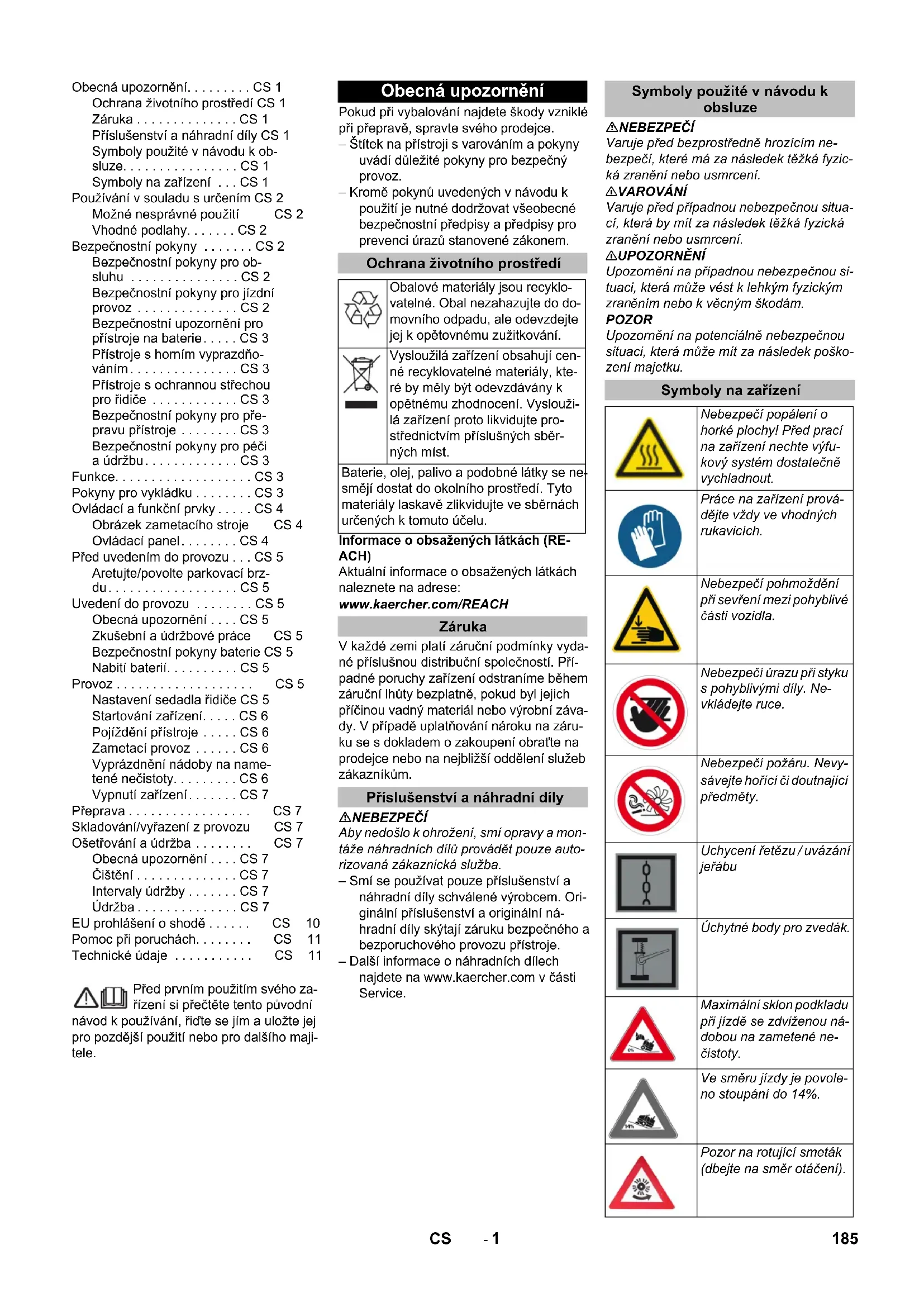 0,1 0,1 Méretek és súly hosszúság x szélesség x magasság mm 2082x1250x1450 2082x1250x1450 Fordulási sugár jobbra mm 1350 1350 Fordulási sugár balra mm 1350 1350 Önsúly (akkumulátor nélkül/akkumulátorral) kg 750/1200 750/1200 Megengedett összsúly kg 1620 1620 Megengedett tengelyterhelés elől kg 797 797 Megengedett tengely terhelés hátul kg 823 823 A műszaki adatok módosításának jogát fenntartjuk! 184 HU- 1 Před prvním použitím svého za- řízení si přečtěte tento původní návod k používání, řiďte se jím a uložte jej pro pozdější použití nebo pro dalšího maji- tele. Pokud při vybalování najdete škody vzniklé při přepravě, spravte svého prodejce. – Štítek na přístroji s varováním a pokyny uvádí důležité pokyny pro bezpečný provoz. – Kromě pokynů uvedených v návodu k použití je nutné dodržovat všeobecné bezpečnostní předpisy a předpisy pro prevenci úrazů stanovené zákonem. Informace o obsažených látkách (RE- ACH) Aktuální informace o obsažených látkách naleznete na adrese: www.kaercher.com/REACH V každé zemi platí záruční podmínky vyda- né příslušnou distribuční společností. Pří- padné poruchy zařízení odstraníme během záruční lhůty bezplatně, pokud byl jejich příčinou vadný materiál nebo výrobní záva- dy. V případě uplatňování nároku na záru- ku se s dokladem o zakoupení obraťte na prodejce nebo na nejbližší oddělení služeb zákazníkům. NEBEZPEČÍ Aby nedošlo k ohrožení, smí opravy a mon- táže náhradních dílů provádět pouze auto- rizovaná zákaznická služba. – Smí se používat pouze příslušenství a náhradní díly schválené výrobcem. Ori- ginální příslušenství a originální ná- hradní díly skýtají záruku bezpečného a bezporuchového provozu přístroje. – Další informace o náhradních dílech najdete na www.kaercher.com v části Service. NEBEZPEČÍ Varuje před bezprostředně hrozícím ne- bezpečí, které má za následek těžká fyzic- ká zranění nebo usmrcení. 몇 VAROVÁNÍ Varuje před případnou nebezpečnou situa- cí, která by mít za následek těžká fyzická zranění nebo usmrcení. 몇 UPOZORNĚNÍ Upozornění na případnou nebezpečnou si- tuaci, která může vést k lehkým fyzickým zran ěním nebo k věcným škodám. POZOR Upozornění na potenciálně nebezpečnou situaci, která může mít za následek poško- zení majetku. Obecná upozornění. . . . . . . . . CS 1 Ochrana životního prostředí CS 1 Záruka . . . . . . . . . . . . . . CS 1 Příslušenství a náhradní díly CS 1 Symboly použité v návodu k ob- sluze. . . . . . . . . . . . . . . . CS 1 Symboly na zařízení . . . CS 1 Používání v souladu s určením CS 2 Možné nesprávné použití CS 2 Vhodné podlahy. . . . . . . CS 2 Bezpečnostní pokyny . . . . . . . CS 2 Bezpečnostní pokyny pro ob- sluhu . . . . . . . . . . . . . . . CS 2 Bezpečnostní pokyny pro jízdní provoz . . . . . . . . . . . . . . CS 2 Bezpečnostní upozornění pro přístroje na baterie. . . . . CS 3 Přístroje s horním vyprazdňo- váním . . . . . . . . . . . . . . . CS 3 Přístroje s ochrannou střechou pro řidiče . . . . . . . . . . . . CS 3 Bezpečnostní pokyny pro pře- pravu přístroje . . . . . . . . CS 3 Bezpečnostní pokyny pro péči a údržbu. . . . . . . . . . . . . CS 3 Funkce. . . . . . . . . . . . . . . . . . . CS 3 Pokyny pro vykládku . . . . . . . . CS 3 Ovládací a funkční prvky . . . . . CS 4 Obrázek zametacího stroje CS 4 Ovládací panel. . . . . . . . CS 4 Před uvedením do provozu . . . CS 5 Aretujte/povolte parkovací brz- du. . . . . . . . . . . . . . . . . . CS 5 Uvedení do provozu . . . . . . . . CS 5 Obecná upozornění . . . . CS 5 Zkušební a údržbové práce CS 5 Bezpečnostní pokyny baterie CS 5 Nabití baterií. . . . . . . . . . CS 5 Provoz . . . . . . . . . . . . . . . . . . . CS 5 Nastavení sedadla řidiče CS 5 Startování zařízení. . . . . CS 6 Pojíždění přístroje . . . . . CS 6 Zametací provoz . . . . . . CS 6 Vyprázdnění nádoby na name- tené nečistoty. . . . . . . . . CS 6 Vypnutí zařízení. . . . . . . CS 7 Přeprava . . . . . . . . . . . . . . . . . CS 7 Skladování/vyřazení z provozu CS 7 Ošetřování a údržba . . . . . . . . CS 7 Obecná upozornění . . . . CS 7 Čištění . . . . . . . . . . . . . . CS 7 Intervaly údržby . . . . . . . CS 7 Údržba . . . . . . . . . . . . . . CS 7 EU prohlášení o shodě . . . . . . CS 10 Pomoc při poruchách. . . . . . . . CS 11 Technické údaje . . . . . . . . . . . CS 11 Obecná upozornění Ochrana životního prostředí Obalové materiály jsou recyklo- vatelné. Obal nezahazujte do do- movního odpadu, ale odevzdejte jej k opětovnému zužitkování. Vysloužilá zařízení obsahují cen- né recyklovatelné materiály, kte- ré by měly být odevzdávány k opětnému zhodnocení. Vyslouži- lá zařízení proto likvidujte pro- střednictvím příslušných sběr- ných míst. Baterie, olej, palivo a podobné látky se ne- smějí dostat do okolního prostředí. Tyto materiály laskavě zlikvidujte ve sběrnách určených k tomuto účelu. Záruka Příslušenství a náhradní díly Symboly použité v návodu k obsluze Symboly na zařízení Nebezpečí popálení o horké plochy! Před prací na zařízení nechte výfu- kový systém dostatečně vychladnout. Práce na zařízení prová- dějte vždy ve vhodných rukavicích. Nebezpečí pohmoždění při sevření mezi pohyblivé části vozidla. Nebezpečí úrazu při styku s pohyblivými díly. Ne- vkládejte ruce. Nebezpečí požáru. Nevy- sávejte hořící či doutnající předměty. Uchycení řetězu / uvázání jeřábu Úchytné body pro zvedák. Maximální sklon podkladu při jízdě se zdviženou ná- dobou na zametené ne- čistoty. Ve směru jízdy je povole- no stoupá