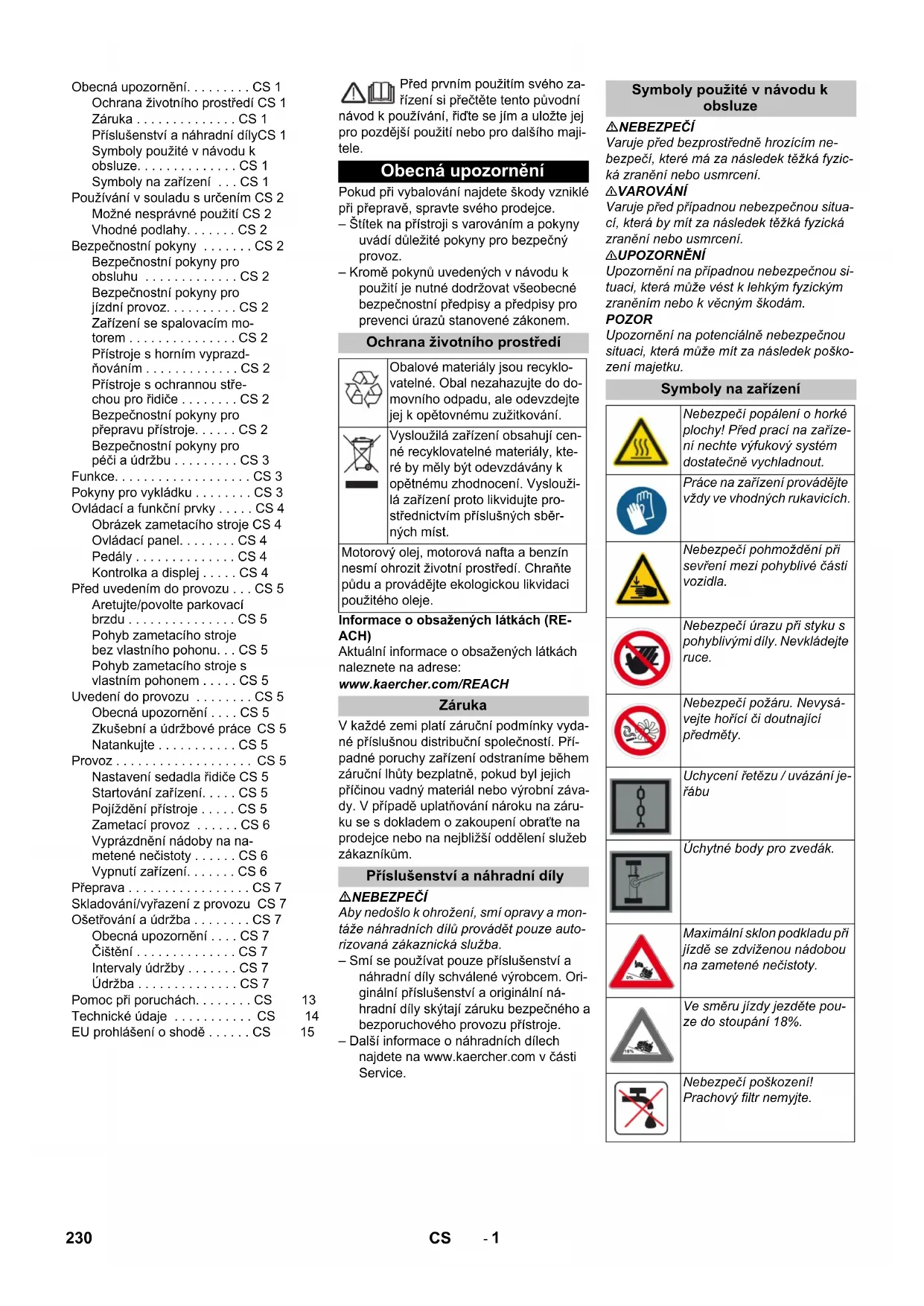 Követett megfelelés megállapítási eljá- rás: 2000/14/EK: V. függelék Hangteljesítményszint dB(A) Mért: 96 Garantált: 98 Chairman of the Board of Management Director Regulatory Affairs & Certification 229HU- 1 Před prvním použitím svého za- řízení si přečtěte tento původní návod k používání, řiďte se jím a uložte jej pro pozdější použití nebo pro dalšího maji- tele. Pokud při vybalování najdete škody vzniklé při přepravě, spravte svého prodejce. – Štítek na přístroji s varováním a pokyny uvádí důležité pokyny pro bezpečný provoz. – Kromě pokynů uvedených v návodu k použití je nutné dodržovat všeobecné bezpečnostní předpisy a předpisy pro prevenci úrazů stanovené zákonem. Informace o obsažených látkách (RE- ACH) Aktuální informace o obsažených látkách naleznete na adrese: www.kaercher.com/REACH V každé zemi platí záruční podmínky vyda- né příslušnou distribuční společností. Pří- padné poruchy zařízení odstraníme během záruční lhůty bezplatně, pokud byl jejich příčinou vadný materiál nebo výrobní záva- dy. V případě uplatňování nároku na záru- ku se s dokladem o zakoupení obraťte na prodejce nebo na nejbližší oddělení služeb zákazníkům. NEBEZPEČÍ Aby nedošlo k ohrožení, smí opravy a mon- táže náhradních dílů provádět pouze auto- rizovaná zákaznická služba. – Smí se používat pouze příslušenství a náhradní díly schválené výrobcem. Ori- ginální příslušenství a originální ná- hradní díly skýtají záruku bezpečného a bezporuchového provozu přístroje. – Další informace o náhradních dílech najdete na www.kaercher.com v části Service. NEBEZPEČÍ Varuje před bezprostředně hrozícím ne- bezpečí, které má za následek těžká fyzic- ká zranění nebo usmrcení. 몇 VAROVÁNÍ Varuje před případnou nebezpečnou situa- cí, která by mít za následek těžká fyzická zranění nebo usmrcení. 몇 UPOZORNĚNÍ Upozornění na případnou nebezpečnou si- tuaci, která může vést k lehkým fyzickým zraněním nebo k věcným škodám. POZOR Upozornění na potenciálně nebezpečnou situaci, která může mít za následek poško- zení majetku. Obecná upozornění. . . . . . . . . CS 1 Ochrana životního prostředí CS 1 Záruka . . . . . . . . . . . . . . CS 1 Příslušenství a náhradní dílyCS 1 Symboly použité v návodu k obsluze. . . . . . . . . . . . . . CS 1 Symboly na zařízení . . . CS 1 Používání v souladu s určením CS 2 Možné nesprávné použití CS 2 Vhodné podlahy. . . . . . . CS 2 Bezpečnostní pokyny . . . . . . . CS 2 Bezpečnostní pokyny pro obsluhu . . . . . . . . . . . . . CS 2 Bezpečnostní pokyny pro jízdní provoz. . . . . . . . . . CS 2 Zařízení se spalovacím mo- torem . . . . . . . . . . . . . . . CS 2 Přístroje s horním vyprazd- ňováním . . . . . . . . . . . . . CS 2 Přístroje s ochrannou stře- chou pro řidiče . . . . . . . . CS 2 Bezpečnostní pokyny pro přepravu přístroje. . . . . . CS 2 Bezpečnostní pokyny pro péči a údržbu . . . . . . . . . CS 3 Funkce. . . . . . . . . . . . . . . . . . . CS 3 Pokyny pro vykládku . . . . . . . . CS 3 Ovládací a funkční prvky . . . . . CS 4 Obrázek zametacího stroje CS 4 Ovládací panel. . . . . . . . CS 4 Pedály . . . . . . . . . . . . . . CS 4 Kontrolka a displej . . . . . CS 4 Před uvedením do provozu . . . CS 5 Aretujte/povolte parkovací brzdu . . . . . . . . . . . . . . . CS 5 Pohyb zametacího stroje bez vlastního pohonu. . . CS 5 Pohyb zametacího stroje s vlastním pohonem . . . . . CS 5 Uvedení do provozu . . . . . . . . CS 5 Obecná upozornění . . . . CS 5 Zkušební a údržbové práce CS 5 Natankujte . . . . . . . . . . . CS 5 Provoz . . . . . . . . . . . . . . . . . . . CS 5 Nastavení sedadla řidiče CS 5 Startování zařízení. . . . . CS 5 Pojíždění přístroje . . . . . CS 5 Zametací provoz . . . . . . CS 6 Vyprázdnění nádoby na na- metené nečistoty . . . . . . CS 6 Vypnutí zařízení. . . . . . . CS 6 Přeprava . . . . . . . . . . . . . . . . . CS 7 Skladování/vyřazení z provozu CS 7 Ošetřování a údržba . . . . . . . . CS 7 Obecná upozornění . . . . CS 7 Čištění . . . . . . . . . . . . . . CS 7 Intervaly údržby . . . . . . . CS 7 Údržba . . . . . . . . . . . . . . CS 7 Pomoc při poruchách. . . . . . . . CS 13 Technické údaje . . . . . . . . . . . CS 14 EU prohlášení o shodě . . . . . . CS 15 Obecná upozornění Ochrana životního prostředí Obalové materiály jsou recyklo- vatelné. Obal nezahazujte do do- movního odpadu, ale odevzdejte jej k opětovnému zužitkování. Vysloužilá zařízení obsahují cen- né recyklovatelné materiály, kte- ré by měly být odevzdávány k opětnému zhodnocení. Vyslouži- lá zařízení proto likvidujte pro- střednictvím příslušných sběr- ných míst. Motorový olej, motorová nafta a benzín nesmí ohrozit životní prostředí. Chraňte půdu a provádějte ekologickou likvidaci použitého oleje. Záruka Příslušenství a náhradní díly Symboly použité v návodu k obsluze Symboly na zařízení Nebezpečí popálení o horké plochy! Před prací na zaříze- ní nechte výfukový systém dostatečně vychladnout. Práce na zařízení provádějte vždy ve vhodných rukavicích. Nebezpečí pohmoždění při sevření mezi pohyblivé části vozidla. Nebezpečí úrazu při styku s pohyblivými díly. Nevkládejte ruce. Nebezpečí požáru. Nevysá- vejte hořící či doutnající předměty. Uchycení řetězu / uvázání je- řábu Úchytné body pro zvedák. Maximální sklon podkladu při jízdě se zdviženou nádobou na zametené nečistoty. Ve směru jízdy jezděte pou- ze do stoupání 18%. Nebezpečí poškození! Prachový filtr nemyjte. 230 CS- 2 Zametací stroj je určen k čištění podlaho- vých ploch v kom