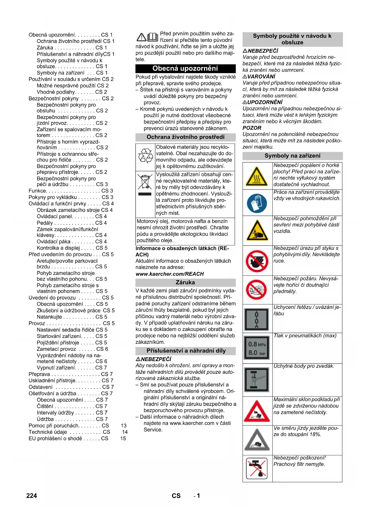 Követett megfelelés megállapítási eljá- rás: 2000/14/EK: V. függelék Hangteljesítményszint dB(A) Mért: 99 Garantált: 102 Chairman of the Board of Management Director Regulatory Affairs & Certification 223HU- 1 Před prvním použitím svého za- řízení si přečtěte tento původní návod k používání, řiďte se jím a uložte jej pro pozdější použití nebo pro dalšího maji- tele. Pokud při vybalování najdete škody vzniklé při přepravě, spravte svého prodejce. – Štítek na přístroji s varováním a pokyny uvádí důležité pokyny pro bezpečný provoz. – Kromě pokynů uvedených v návodu k použití je nutné dodržovat všeobecné bezpečnostní předpisy a předpisy pro prevenci úrazů stanovené zákonem. Informace o obsažených látkách (RE- ACH) Aktuální informace o obsažených látkách naleznete na adrese: www.kaercher.com/REACH V každé zemi platí záruční podmínky vyda- né příslušnou distribuční společností. Pří- padné poruchy zařízení odstraníme během záruční lhůty bezplatně, pokud byl jejich příčinou vadný materiál nebo výrobní záva- dy. V případě uplatňování nároku na záru- ku se s dokladem o zakoupení obraťte na prodejce nebo na nejbližší oddělení služeb zákazníkům. NEBEZPEČÍ Aby nedošlo k ohrožení, smí opravy a mon- táže náhradních dílů provádět pouze auto- rizovaná zákaznická služba. – Smí se používat pouze příslušenství a náhradní díly schválené výrobcem. Ori- ginální příslušenství a originální ná- hradní díly skýtají záruku bezpečného a bezporuchového provozu přístroje. – Další informace o náhradních dílech najdete na www.kaercher.com v části Service. NEBEZPEČÍ Varuje před bezprostředně hrozícím ne- bezpečí, které má za následek těžká fyzic- ká zranění nebo usmrcení. 몇 VAROVÁNÍ Varuje před případnou nebezpečnou situa- cí, která by mít za následek těžká fyzická zranění nebo usmrcení. 몇 UPOZORNĚNÍ Upozornění na případnou nebezpečnou si- tuaci, která může vést k lehkým fyzickým zraněním nebo k věcným škodám. POZOR Upozornění na potenciálně nebezpečnou situaci, která může mít za následek poško- zení majetku. Obecná upozornění. . . . . . . . . CS 1 Ochrana životního prostředí CS 1 Záruka . . . . . . . . . . . . . . CS 1 Příslušenství a náhradní dílyCS 1 Symboly použité v návodu k obsluze. . . . . . . . . . . . . . CS 1 Symboly na zařízení . . . CS 1 Používání v souladu s určením CS 2 Možné nesprávné použití CS 2 Vhodné podlahy. . . . . . . CS 2 Bezpečnostní pokyny . . . . . . . CS 2 Bezpečnostní pokyny pro obsluhu . . . . . . . . . . . . . CS 2 Bezpečnostní pokyny pro jízdní provoz. . . . . . . . . . CS 2 Zařízení se spalovacím mo- torem . . . . . . . . . . . . . . . CS 2 Přístroje s horním vyprazd- ňováním . . . . . . . . . . . . . CS 2 Přístroje s ochrannou stře- chou pro řidiče . . . . . . . . CS 2 Bezpečnostní pokyny pro přepravu přístroje. . . . . . CS 2 Bezpečnostní pokyny pro péči a údržbu . . . . . . . . . CS 3 Funkce. . . . . . . . . . . . . . . . . . . CS 3 Pokyny pro vykládku . . . . . . . . CS 3 Ovládací a funkční prvky . . . . . CS 4 Obrázek zametacího stroje CS 4 Ovládací panel. . . . . . . . CS 4 Pedály . . . . . . . . . . . . . . CS 4 Zámek zapalování/funkční klávesy. . . . . . . . . . . . . . CS 4 Ovládací páka . . . . . . . . CS 4 Kontrolka a displej . . . . . CS 5 Před uvedením do provozu . . . CS 5 Aretujte/povolte parkovací brzdu . . . . . . . . . . . . . . . CS 5 Pohyb zametacího stroje bez vlastního pohonu. . . CS 5 Pohyb zametacího stroje s vlastním pohonem . . . . . CS 5 Uvedení do provozu . . . . . . . . CS 5 Obecná upozornění . . . . CS 5 Zkušební a údržbové práce CS 5 Natankujte . . . . . . . . . . . CS 5 Provoz . . . . . . . . . . . . . . . . . . . CS 5 Nastavení sedadla řidiče CS 5 Startování zařízení. . . . . CS 5 Pojíždění přístroje . . . . . CS 5 Zametací provoz . . . . . . CS 6 Vyprázdnění nádoby na na- metené nečistoty . . . . . . CS 6 Vypnutí zařízení. . . . . . . CS 7 Přeprava . . . . . . . . . . . . . . . . . CS 7 Uskladnění přístroje. . . . . . . . . CS 7 Odstavení . . . . . . . . . . . . . . . . CS 7 Ošetřování a údržba . . . . . . . . CS 7 Obecná upozornění . . . . CS 7 Čištění . . . . . . . . . . . . . . CS 7 Intervaly údržby . . . . . . . CS 7 Údržba . . . . . . . . . . . . . . CS 7 Pomoc při poruchách. . . . . . . . CS 13 Technické údaje . . . . . . . . . . . CS 14 EU prohlášení o shodě . . . . . . CS 15 Obecná upozornění Ochrana životního prostředí Obalové materiály jsou recyklo- vatelné. Obal nezahazujte do do- movního odpadu, ale odevzdejte jej k opětovnému zužitkování. Vysloužilá zařízení obsahují cen- né recyklovatelné materiály, kte- ré by měly být odevzdávány k opětnému zhodnocení. Vyslouži- lá zařízení proto likvidujte pro- střednictvím příslušných sběr- ných míst. Motorový olej, motorová nafta a benzín nesmí ohrozit životní prostředí. Chraňte půdu a provádějte ekologickou likvidaci použitého oleje. Záruka Příslušenství a náhradní díly Symboly použité v návodu k obsluze Symboly na zařízení Nebezpečí popálení o horké plochy! Před prací na zaříze- ní nechte výfukový systém dostatečně vychladnout. Práce na zařízení provádějte vždy ve vhodných rukavicích. Nebezpečí pohmoždění při sevření mezi pohyblivé části vozidla. Nebezpečí úrazu při styku s pohyblivými díly. Nevkládejte ruce. Nebezpečí požáru. Nevysá- vejte hořící či doutnající předměty. Uchycení řetězu / uvázání je- řábu Tlak v pneumatikách (max) Úchytné body pro zvedák. Maximální sklon podkladu při jízdě se zdviženou nádobou na zameten