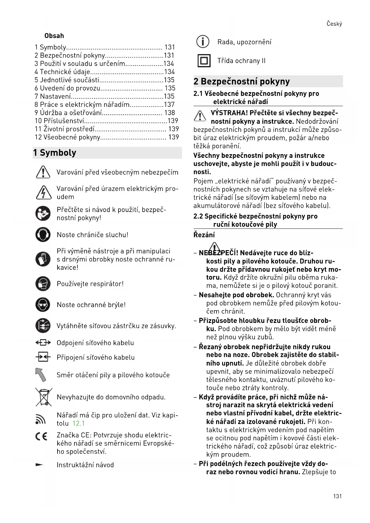 - 12 Všeobecné pokyny 1 Symboly Varování před všeobecným nebezpečím Varování před úrazem elektrickým pro udem Přečtěte si návod k použití, bezpeč nostní pokyny! Noste chrániče sluchu! Při výměně nástroje a při manipulaci s drsnými obrobky noste ochranné ru kavice! Používejte respirátor! Noste ochranné brýle! Vytáhněte síťovou zástrčku ze zásuvky. Odpojení síťového kabelu Připojení síťového kabelu Směr otáčení pily a pilového kotouče Nevyhazujte do domovního odpadu. Nářadí má čip pro uložení dat. Viz kapi tolu 12.1 Značka CE: Potvrzuje shodu elektric kého nářadí se směrnicemi Evropské ho společenství. Instruktážní návod Rada, upozornění Třída ochrany II 2 Bezpečnostní pokyny p. 139