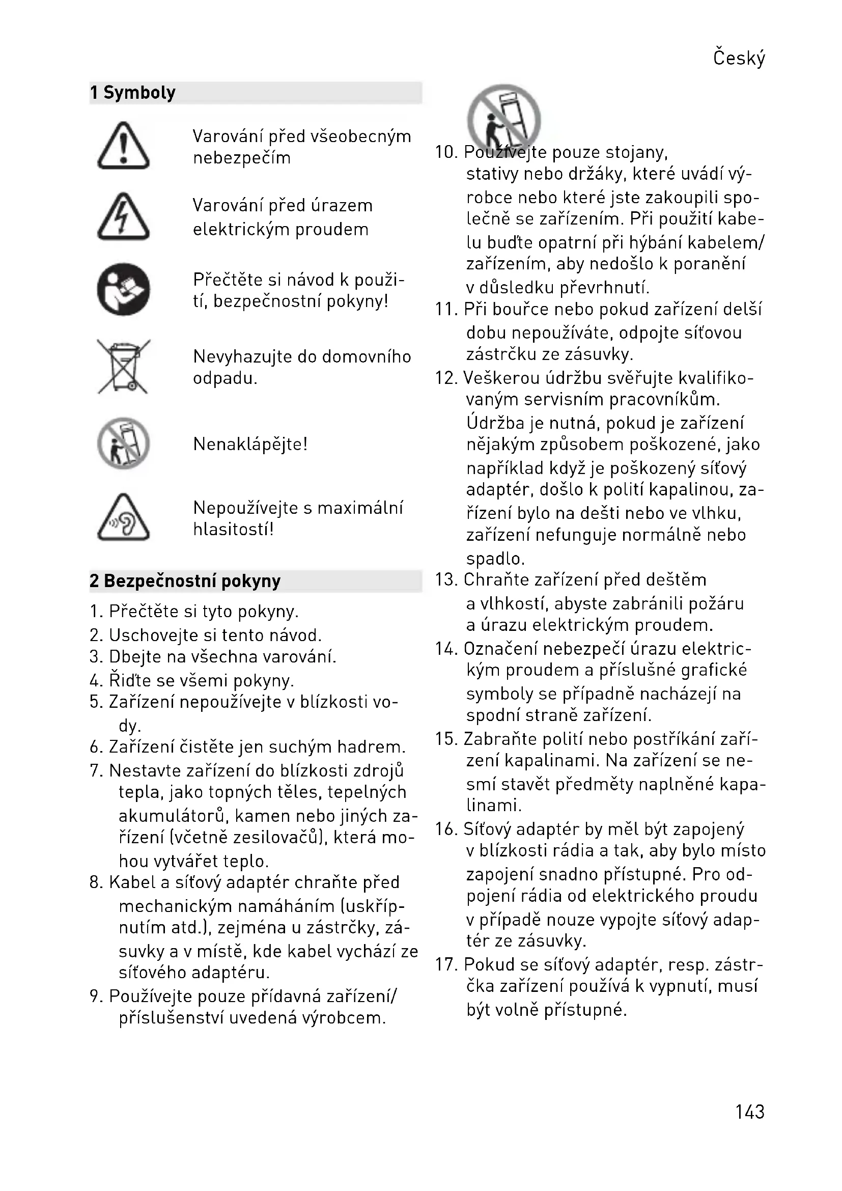 1421 Symboly Varování před všeobecným nebezpečím Varování před úrazem elektrickým proudem Přečtěte si návod k použi tí, bezpečnostní pokyny! Nevyhazujte do domovního odpadu. Nenaklápějte! Nepoužívejte s maximální hlasitostí! 2 Bezpečnostní pokyny
