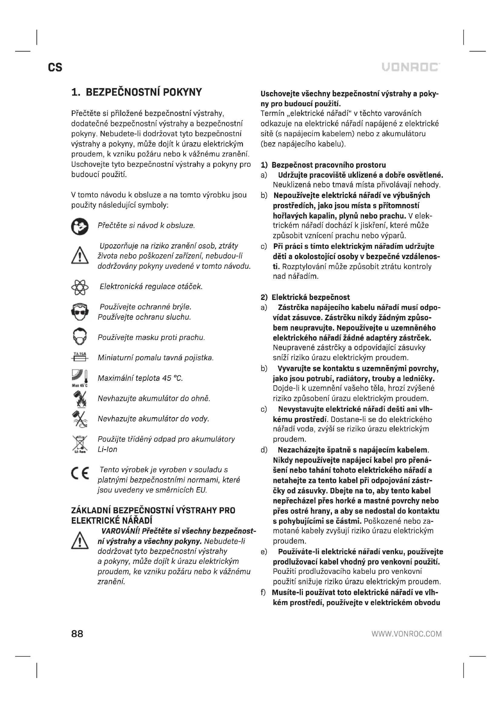 Chraňte akumulátor před teplem, například před nepřetržitým intenzivním slunečním světlem, ohněm, vodou a vlhkostí. Nebezpečí výbuchu. c) V případě poškození a nesprávného použití aku- mulátoru se mohou uvolňovat výpary. Vpřípadě potíží vyvětrejte místnost a vyhledejte lékařskou pomoc. Výpary mohou dráždit dýchací ústrojí. d) Používejte tento akumulátor výhradně s výrob- kem značky Vonroc. Toto opatření samo o sobě chrání akumulátor před nebezpečným přetížením. e) Akumulátor může být poškozen ostrými před- měty, jako například hřebíky nebo šroubováky, nebo vnější silou. Může dojít k vnitřnímu zkratu a vznícení, vzniku kouře, výbuchu nebo přehřátí akumulátoru.CS
