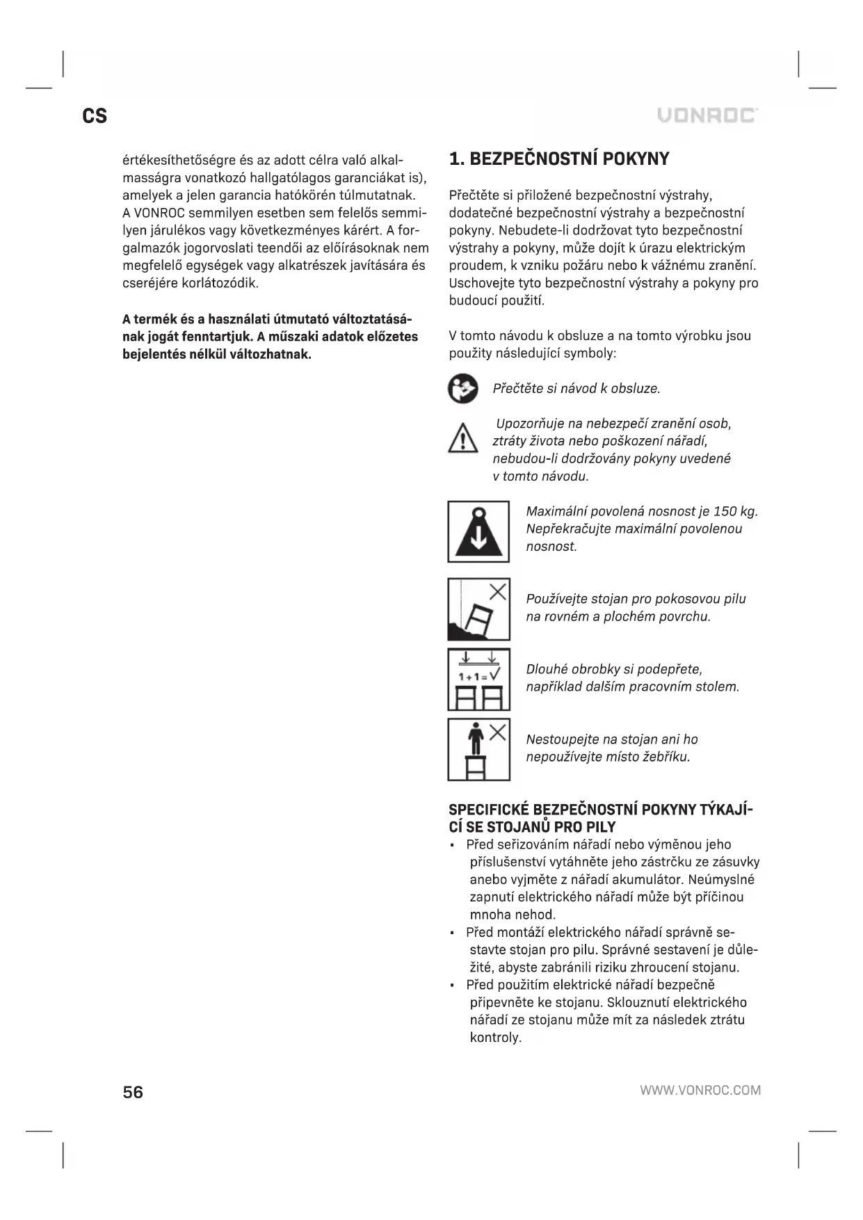 pro pokosovou pilu před jeho každým použitím iponěm. Opravy a úkony údržby může provádět pouze kompetentní osoba, která bude používat vhodné náhradní díly. Použití neschválených neoriginálních náhradních dílů není doporučeno a ruší platnost záruky. ZÁRUKA Výrobky VONROC jsou vyvíjeny v souladu s poža- davky norem na nejvyšší kvalitu a je zaručeno, že po dobu platné záruky, která začíná běžet dnem původního nákupu, nebudou na těchto výrob- cích žádné vady materiálu, ani vady způsobené špatným dílenským zpracováním. Dojde-li během tohoto období k závadě v důsledku vady materiálu nebo dílenského zpracování, kontaktujte přímo firmuVONROC. Z této záruky jsou vyloučeny následující případy: