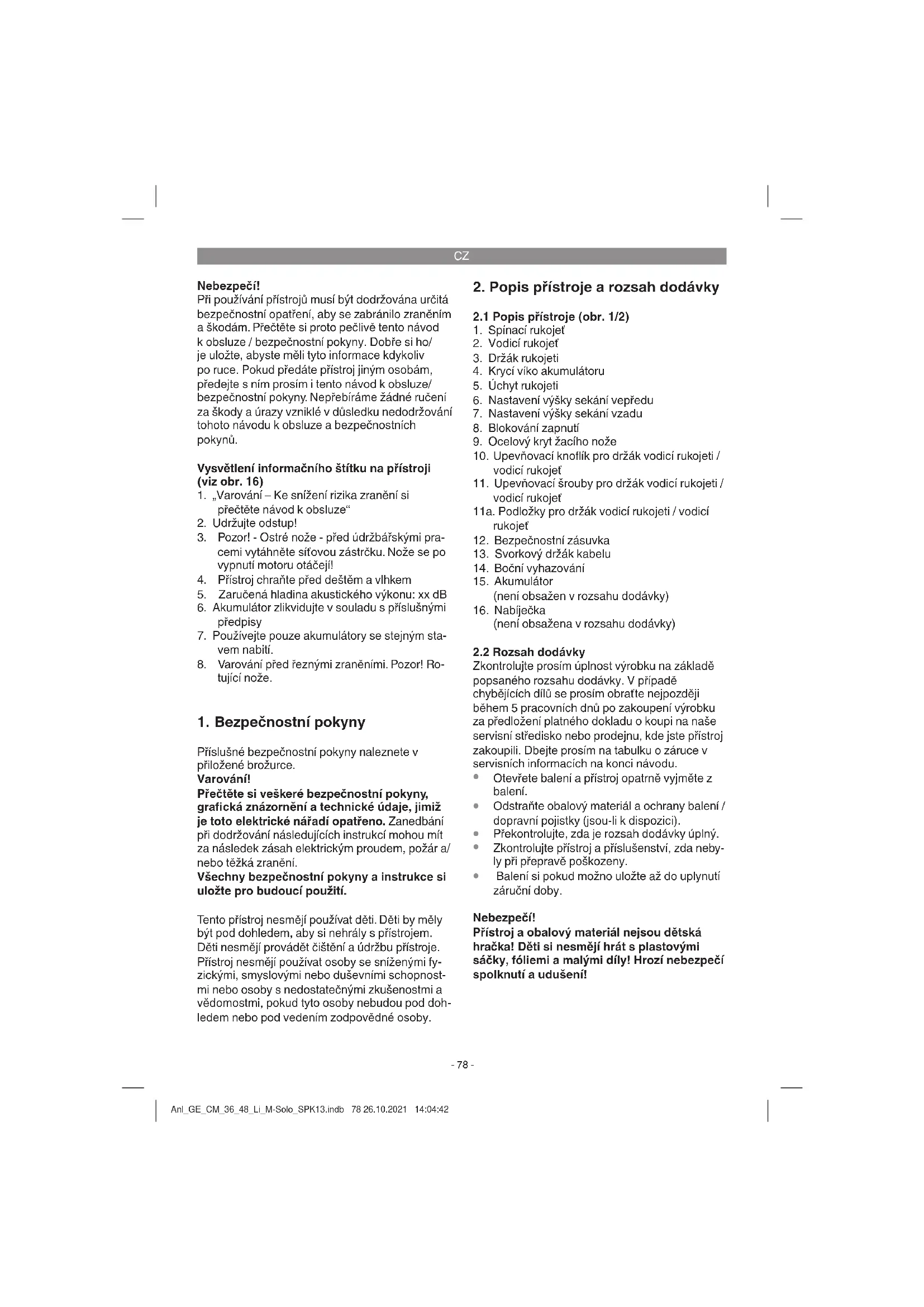 Balení si pokud možno uložte až do uplynutí záruční doby. Nebezpečí! Přístroj a obalový materiál nejsou dětská hračka! Děti si nesmějí hrát s plastovými sáčky, fóliemi a malými díly! Hrozí nebezpečí spolknutí a udušení! Anl_GE_CM_36_48_Li_M-Solo_SPK13.indb 78 26.10.2021 14:04:42CZ