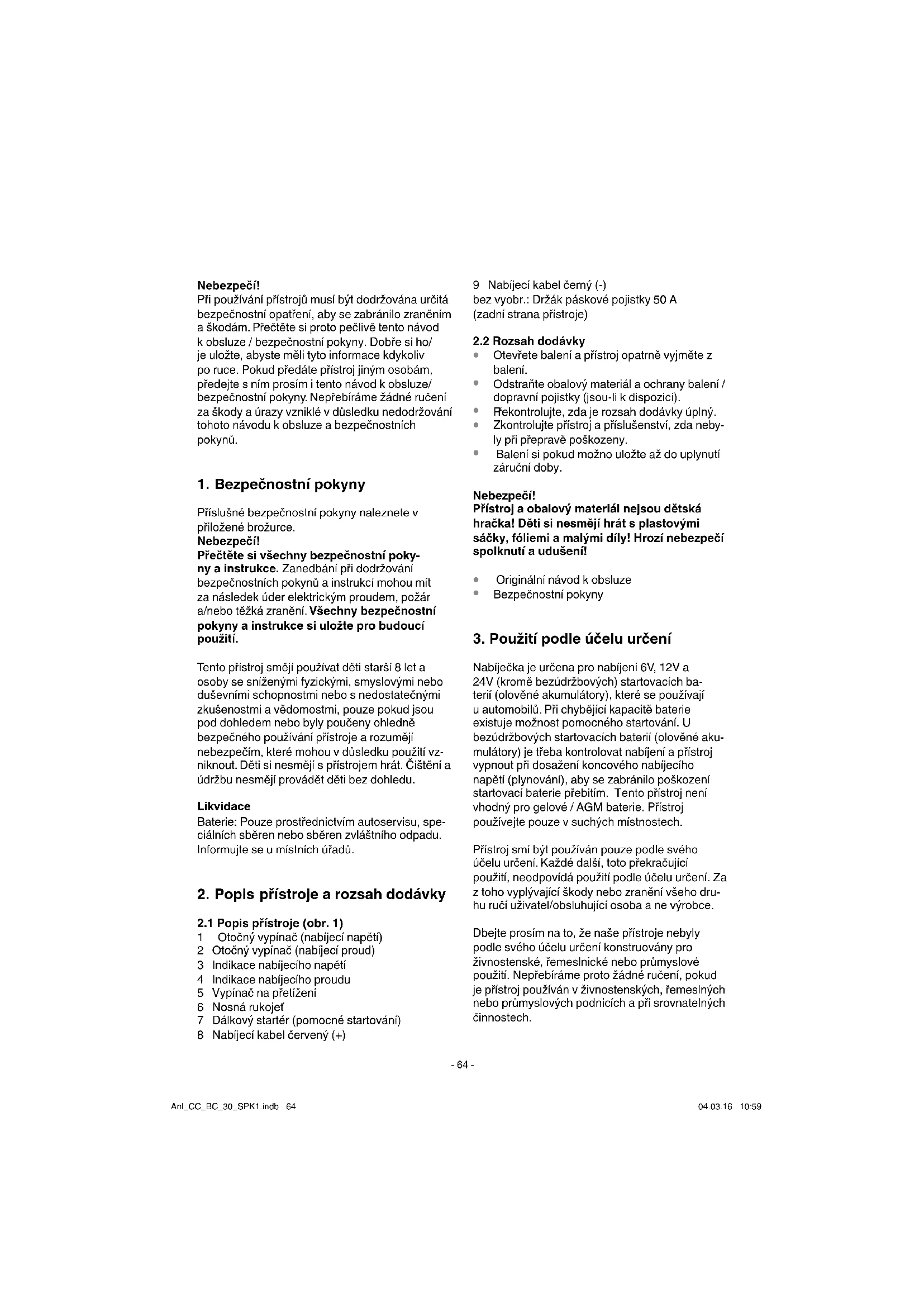 Nabíječka je určena pro nabíjení 6V, 12V a 24V (kromě bezúdržbových) startovacích ba- terií (olověné akumulátory), které se používají u automobilů. Při chybějící kapacitě baterie existuje možnost pomocného startování. U bezúdržbových startovacích baterií (olověné aku- mulátory) je třeba kontrolovat nabíjení a přístroj vypnout při dosažení koncového nabíjecího napětí (plynování), aby se zabránilo poškození startovací baterie přebitím. Tento přístroj není vhodný pro gelové / AGM baterie. Přístroj používejte pouze v suchých místnostech. Přístroj smí být používán pouze podle svého účelu určení. Každé další, toto překračující použití, neodpovídá použití podle účelu určení. Za z toho vyplývající škody nebo zranění všeho dru- hu ručí uživatel/obsluhující osoba a ne výrobce. Dbejte prosím na to, že naše přístroje nebyly podle svého účelu určení konstruovány pro živnostenské, řemeslnické nebo průmyslové použití. Nepřebíráme proto žádné ručení, pokud je přístroj používán v živnostenských, řemeslných nebo průmyslových podnicích a při srovnatelných činnostech. Anl_CC_BC_30_SPK1.indb 64Anl_CC_BC_30_SPK1.indb 64 04.03.16 10:5904.03.16 10:59CZ